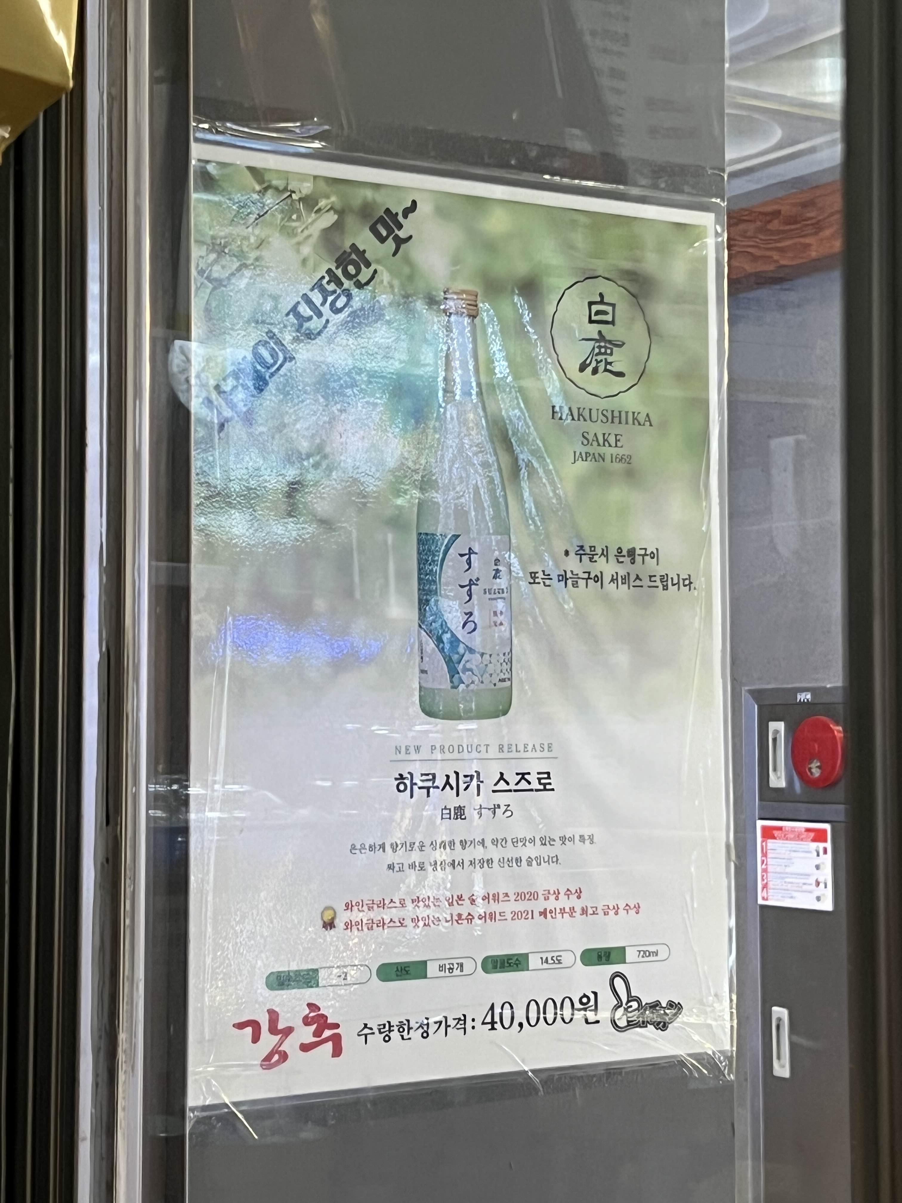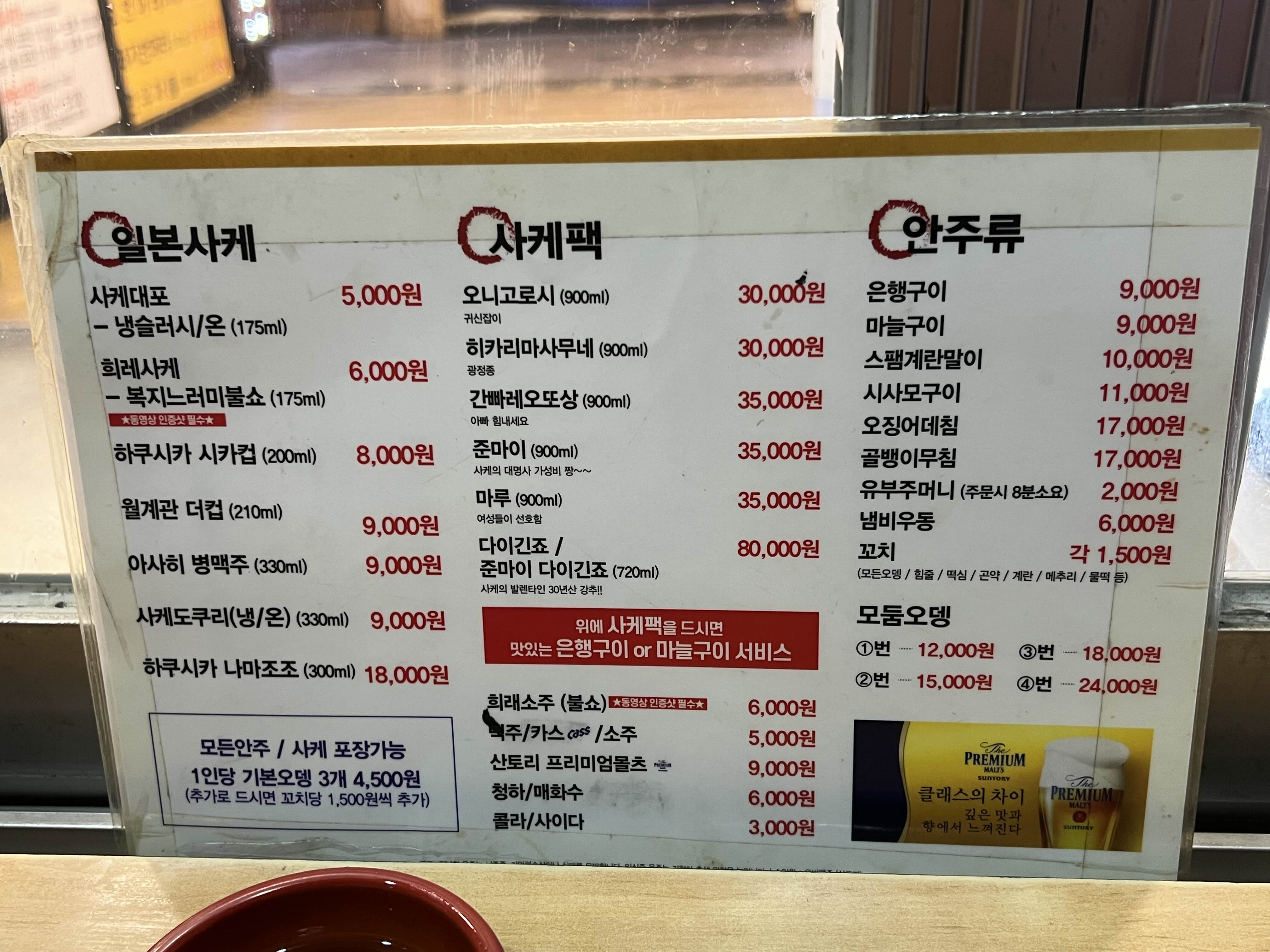 아래 사케도 이벤트를 해서 주문하면 은행구이를 주신다고 하네요. 3명이상이 가면 사케 1팩 주문해서 먹어도 좋을 것 같아요. 사실 2명이서 가도 드시는 분들 많습니다. 저희는 히카리마사무네를 주문했고, 맛은 차갑게 먹는 게 더 깔끔하게 느껴졌습니다. 따듯하게 데우면 코를 찌르는 듯한 알콜향이 나기 때문에 호불호가 갈립니다.