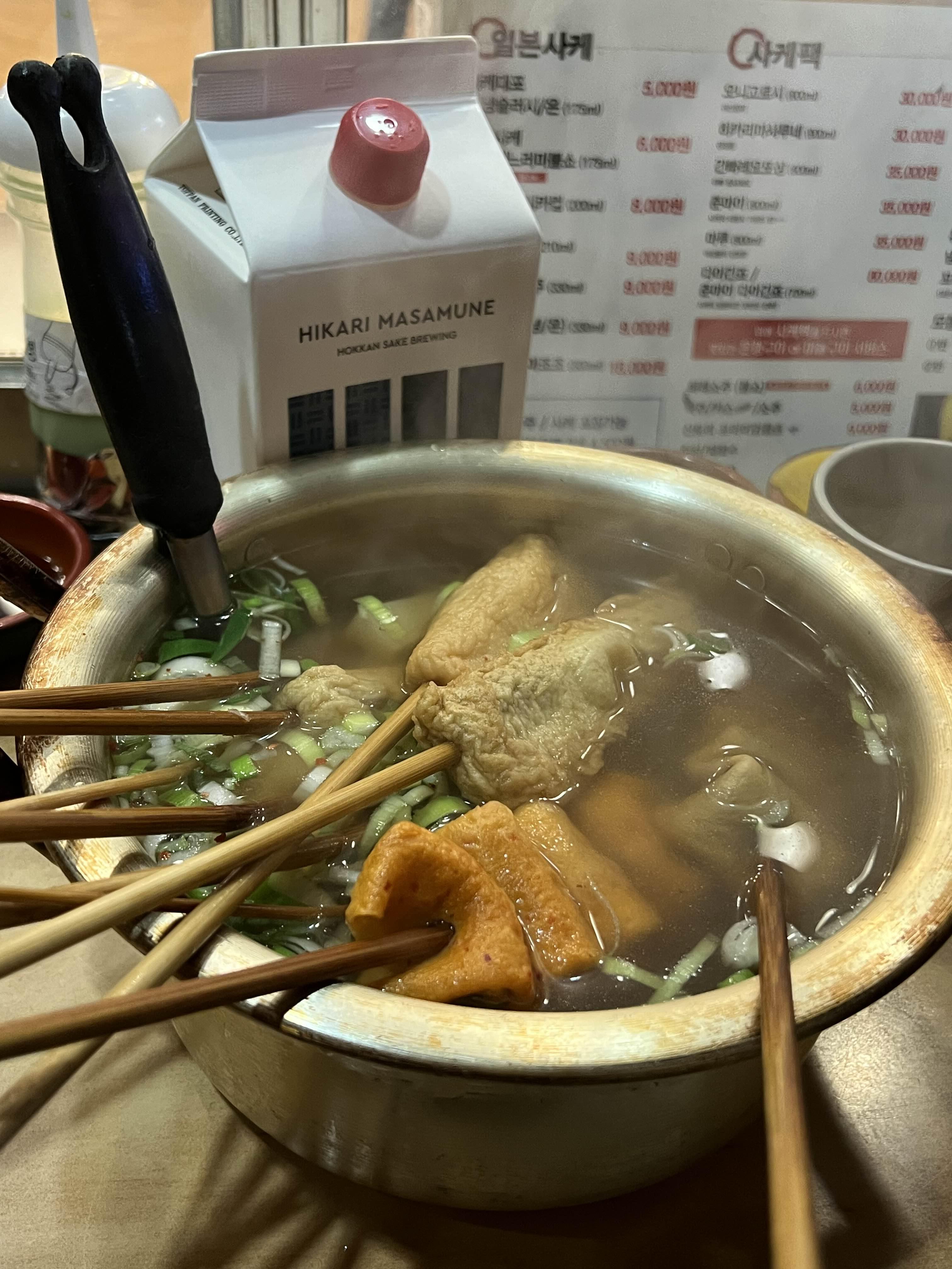 사케1팩을 주문해서 은행구이 서비스로 먹었습니다. 그리고 한 명 더 와서 4명이서 마셨어요. 1차로 갔기 때문에 배도 조금 부르고 술도 웬만큼 먹어서 일어났습니다. 나중에 일어날 때 오뎅꼬치 갯수를 세보니까 많이 먹었더라고요. 인당 7개정도는 먹은 듯.....그럼 거의 30개 정도 먹은 것 같아요. ㅋㅋㅋㅋㅋ