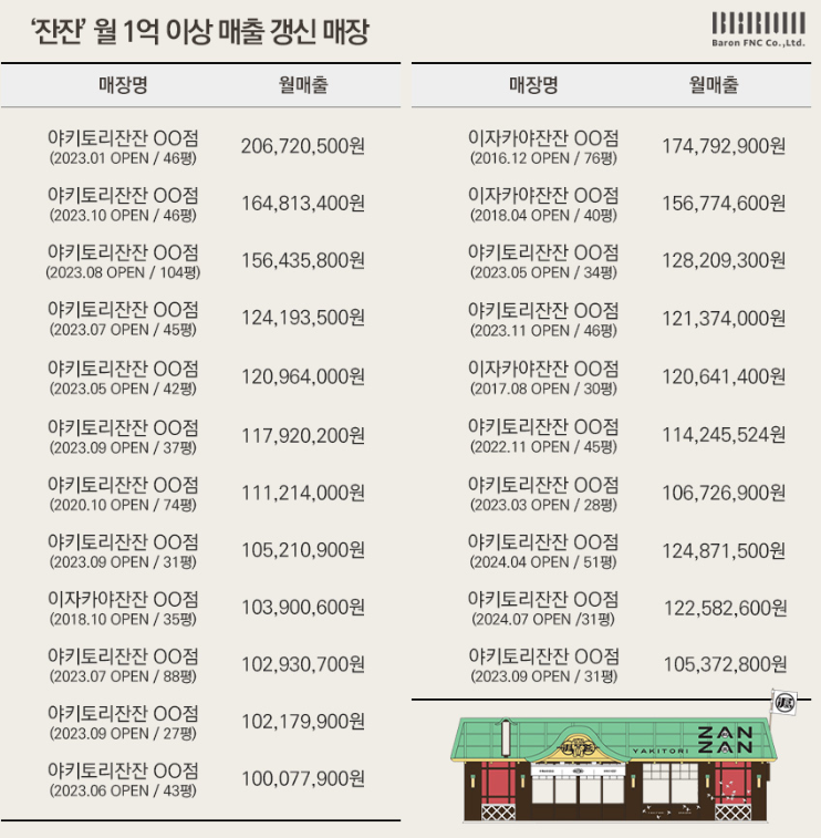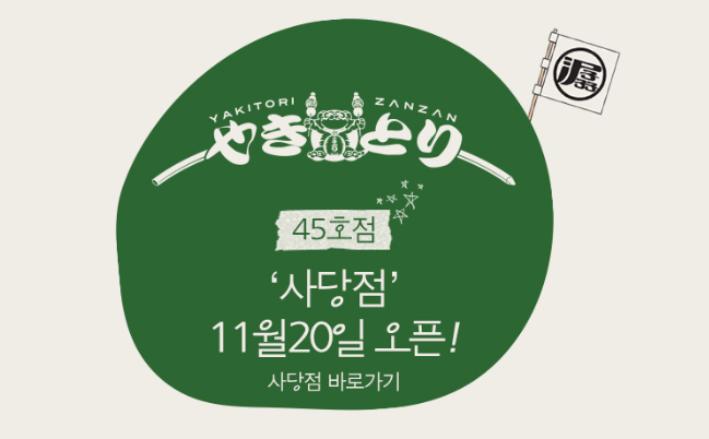 11월에 사당에 야키토리 잔잔 45호점이 오픈해서 한번 가보았습니다. 야키토리 잔잔 홈페이지에 들어가니까 월매출이 1억 이상되는 가게들이 꽤 많네요! 벌써 45호점이라고 하니 창업에 관심있는 분들은 살펴보시기 바랍니다. 창업비용은 약 1억 8천만원정도 소요되는 것 같더라고요! 그래도 장사가 잘 되면 월매출이 1억이 넘으니까 몇 개월만 잘 운영해도 투자비용은 뽑는 것 같습니다.