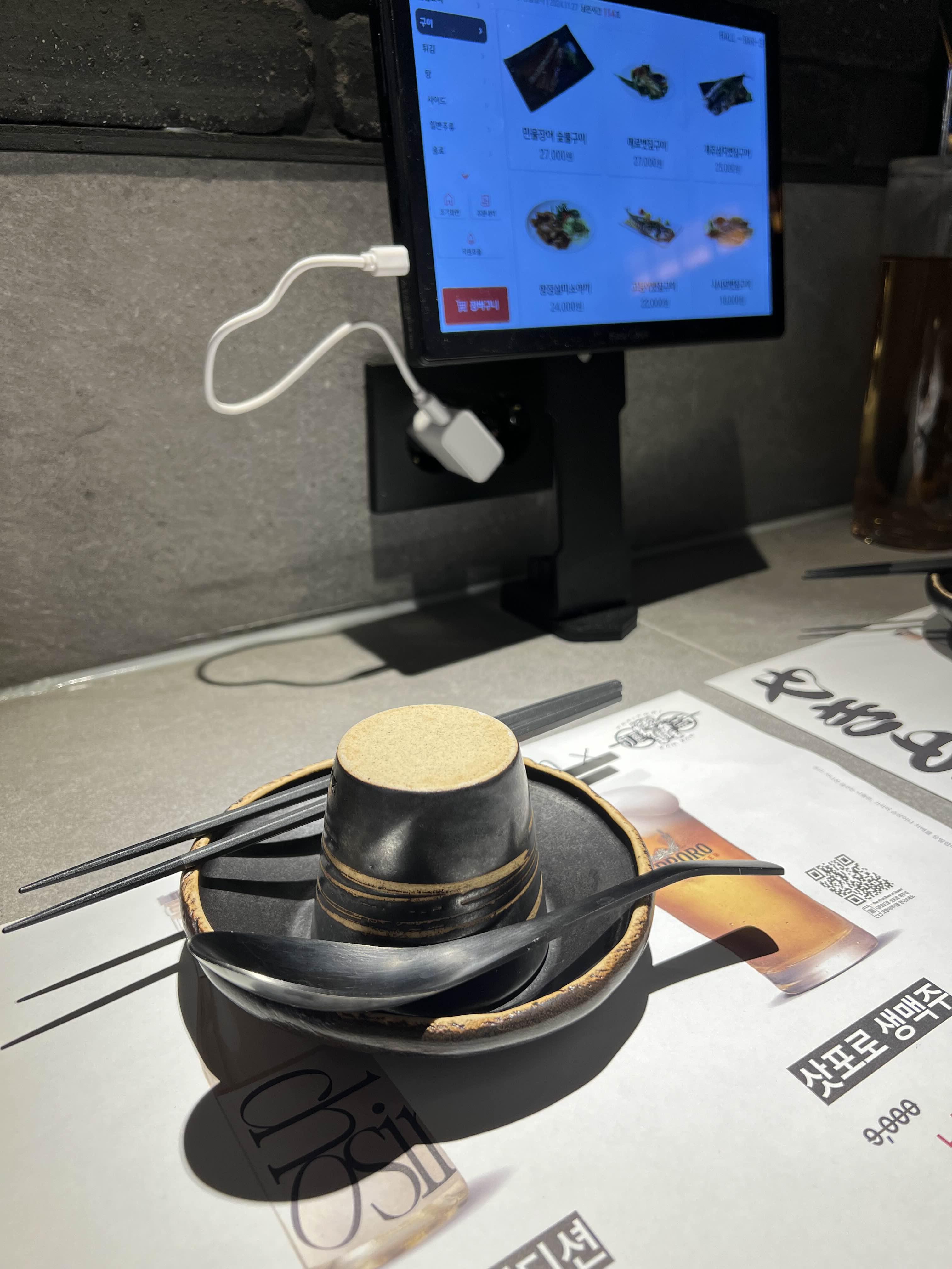 주문은 테이블에 있는 태블릿으로 주문하게 되어 있습니다. 자리에 앉아서 바로 살펴보고 주문하시면 됩니다. 식기와 찻물을 주시고 저희는 일단 맥주를 한잔씩 주문했습니다. 야키토리는 개별로 시키면 조금 비싼 느낌이라 야키토리 5종으로 주문하시는 게 가성비가 좋습니다. 야키토리집이니까 야키토리로 시작하는 게 좋겠죠?!ㅋㅋ
