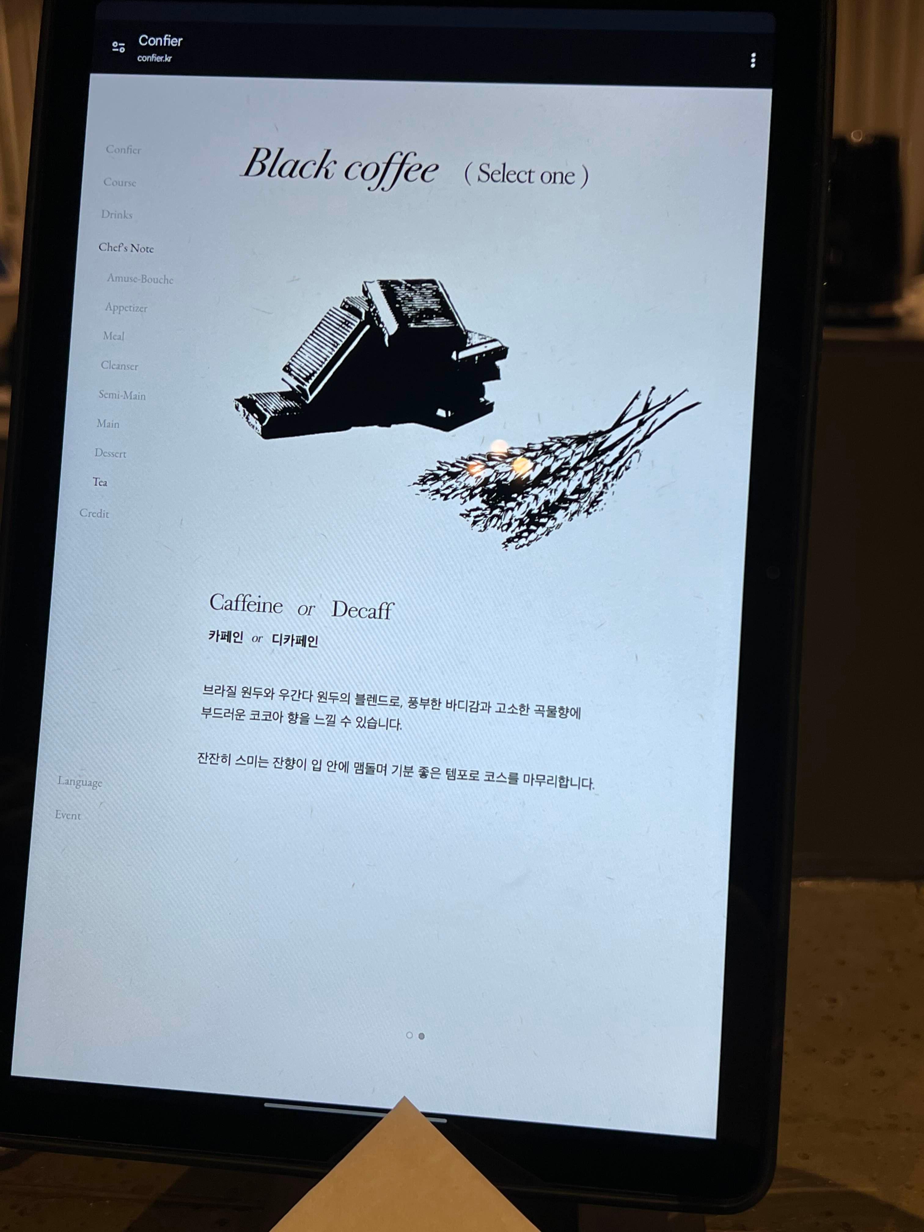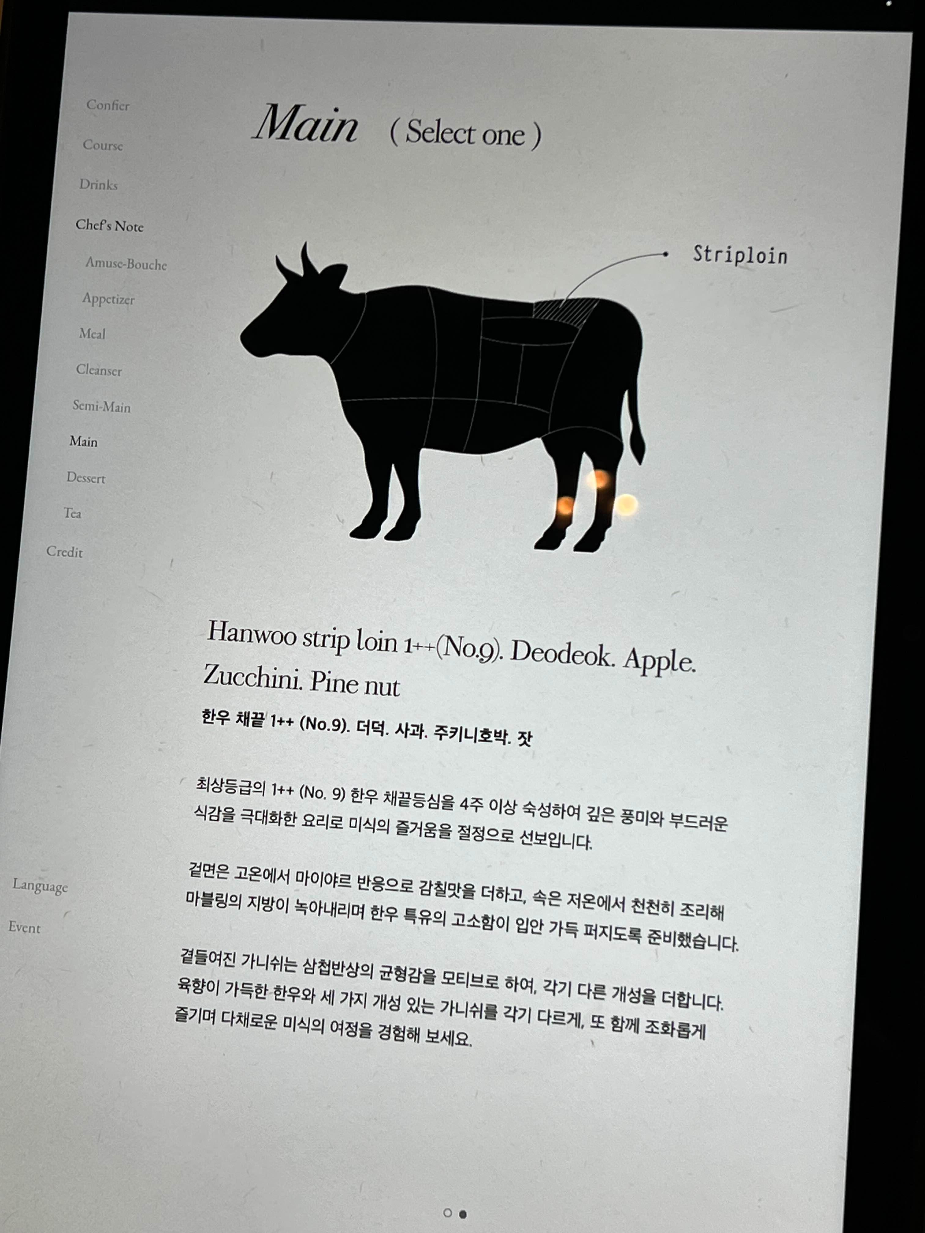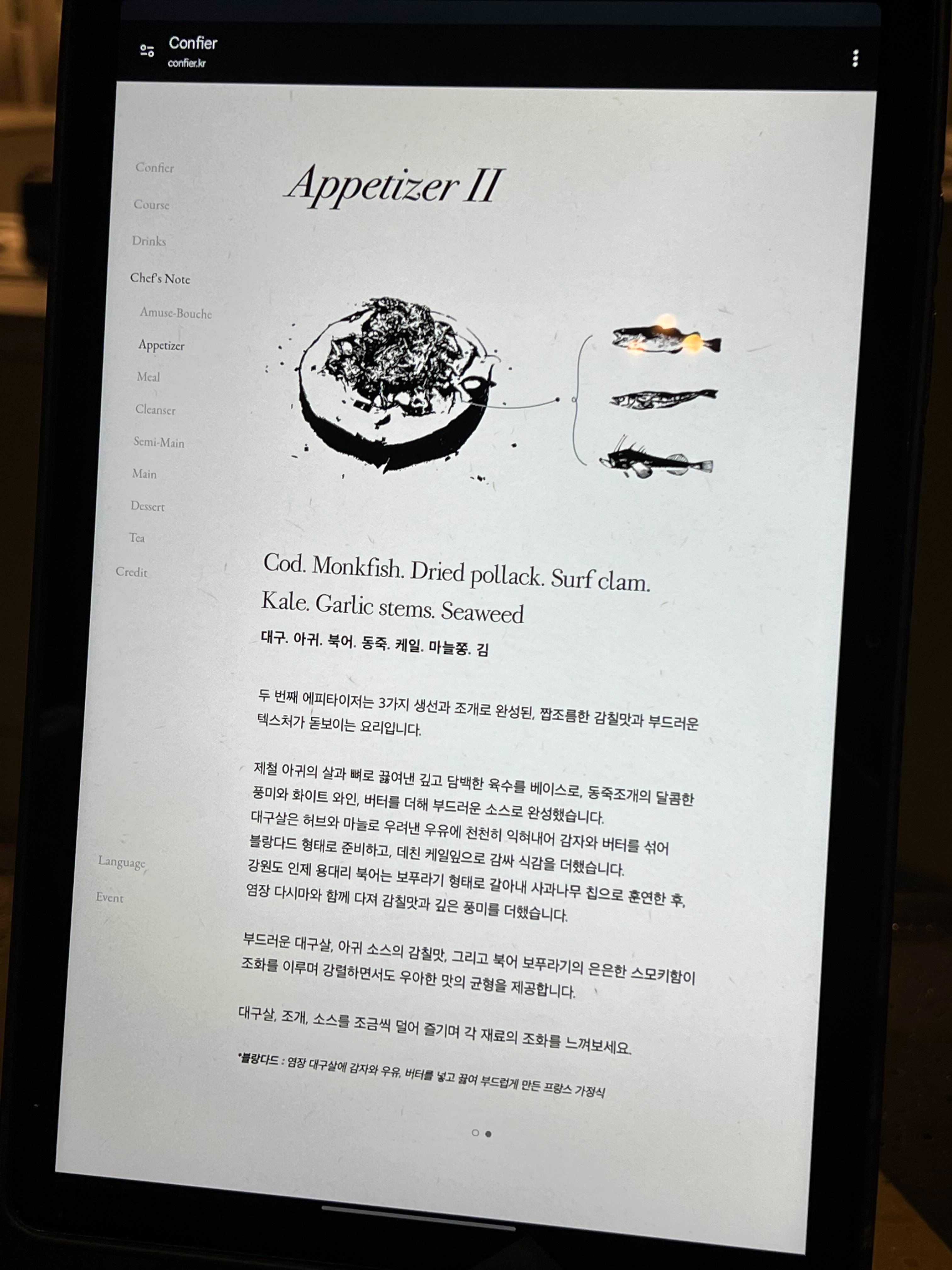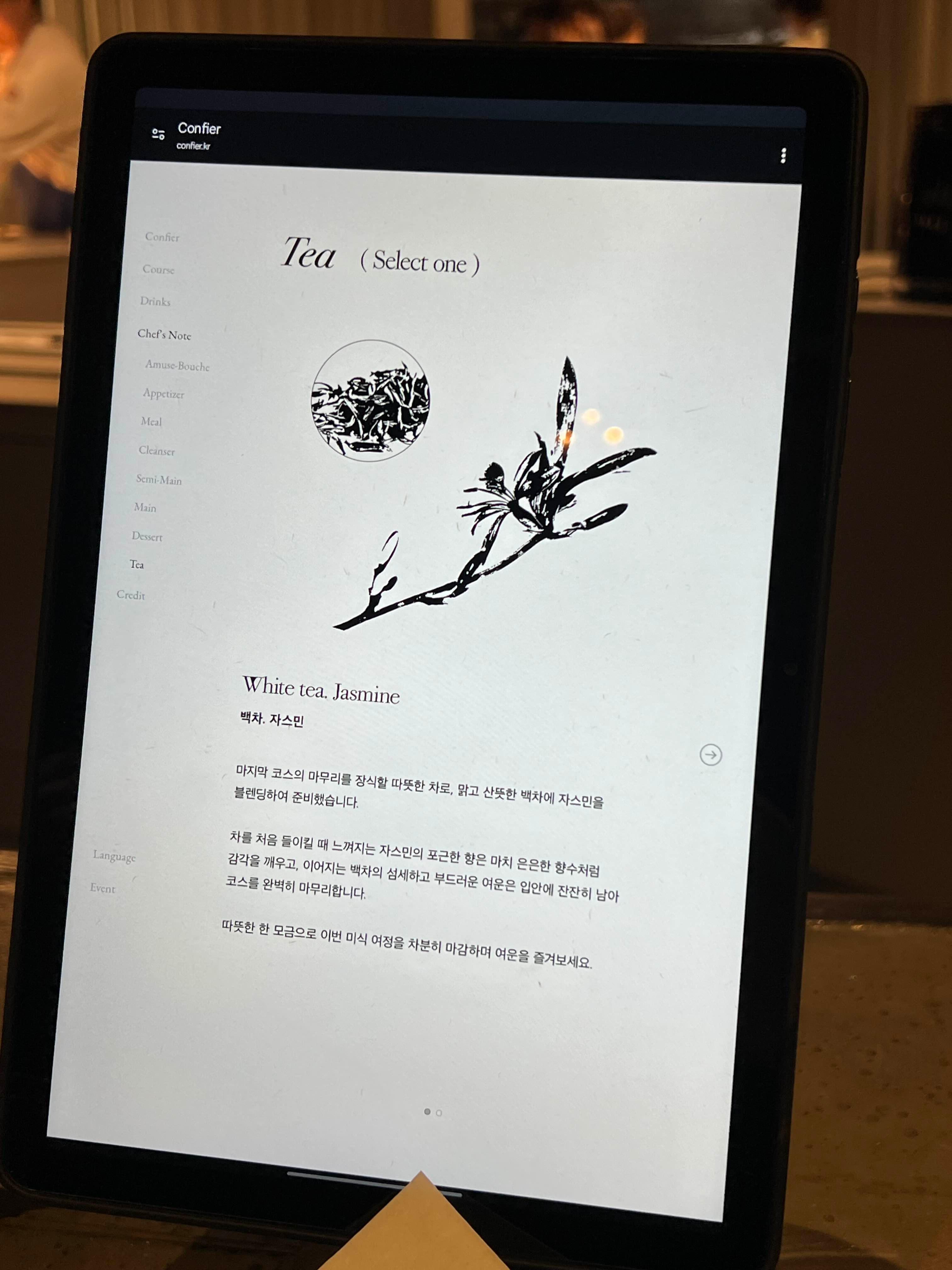 음식에 대한 설명은 서빙해 주시면서 해주시지만 태블릿에도 나와 있기 때문에 찾아서 보시면 좋아요.