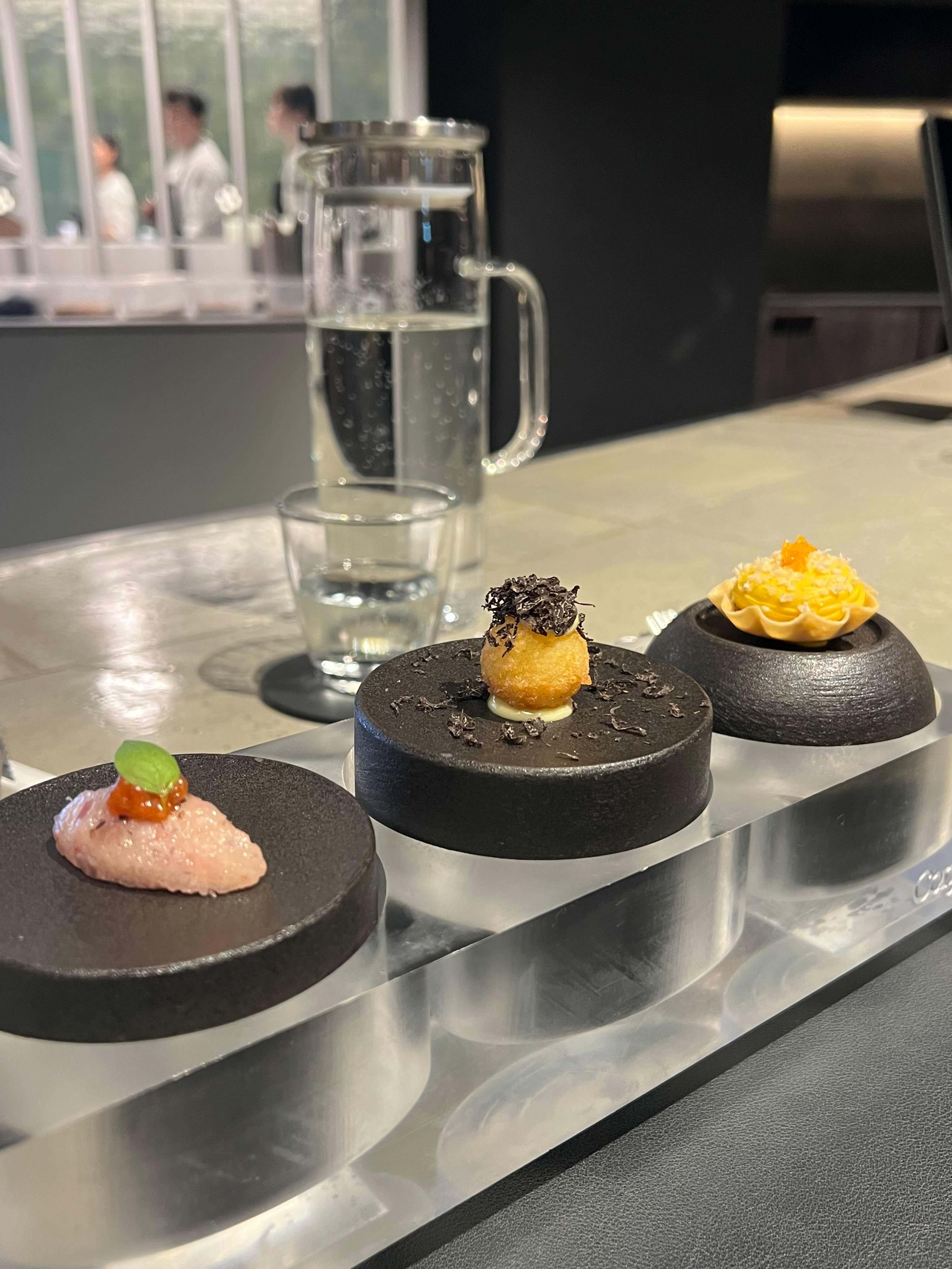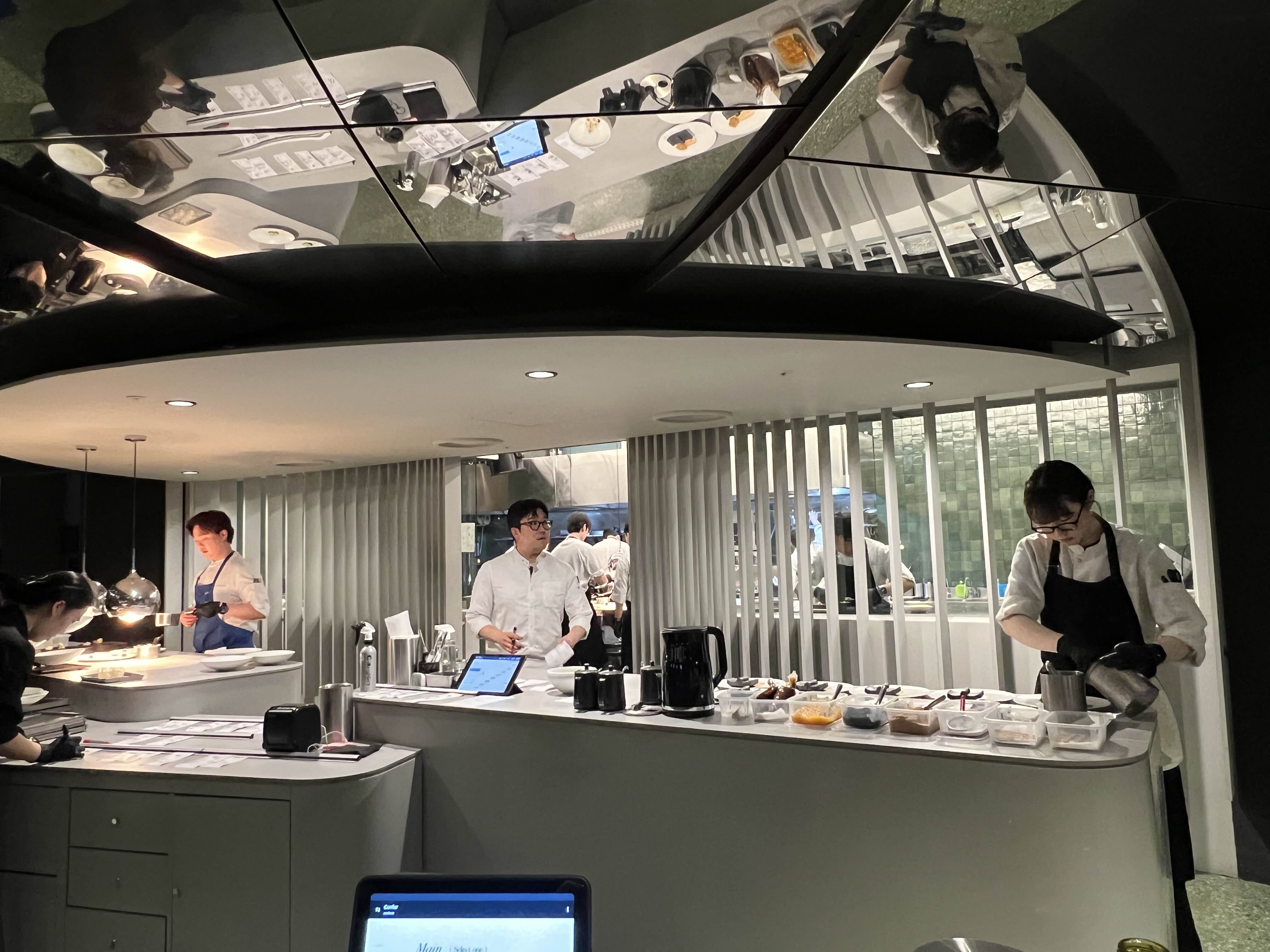 저희는 코스요리로 주문 예약했고, 가자마자 바 자리로 안내받았습니다. 자리에 앉으면 주방에서 요리하는 모습을 볼 수 있어서 신기했습니다. 마치 티비를 보고 있는 듯했습니다(너무 촌티 나나)