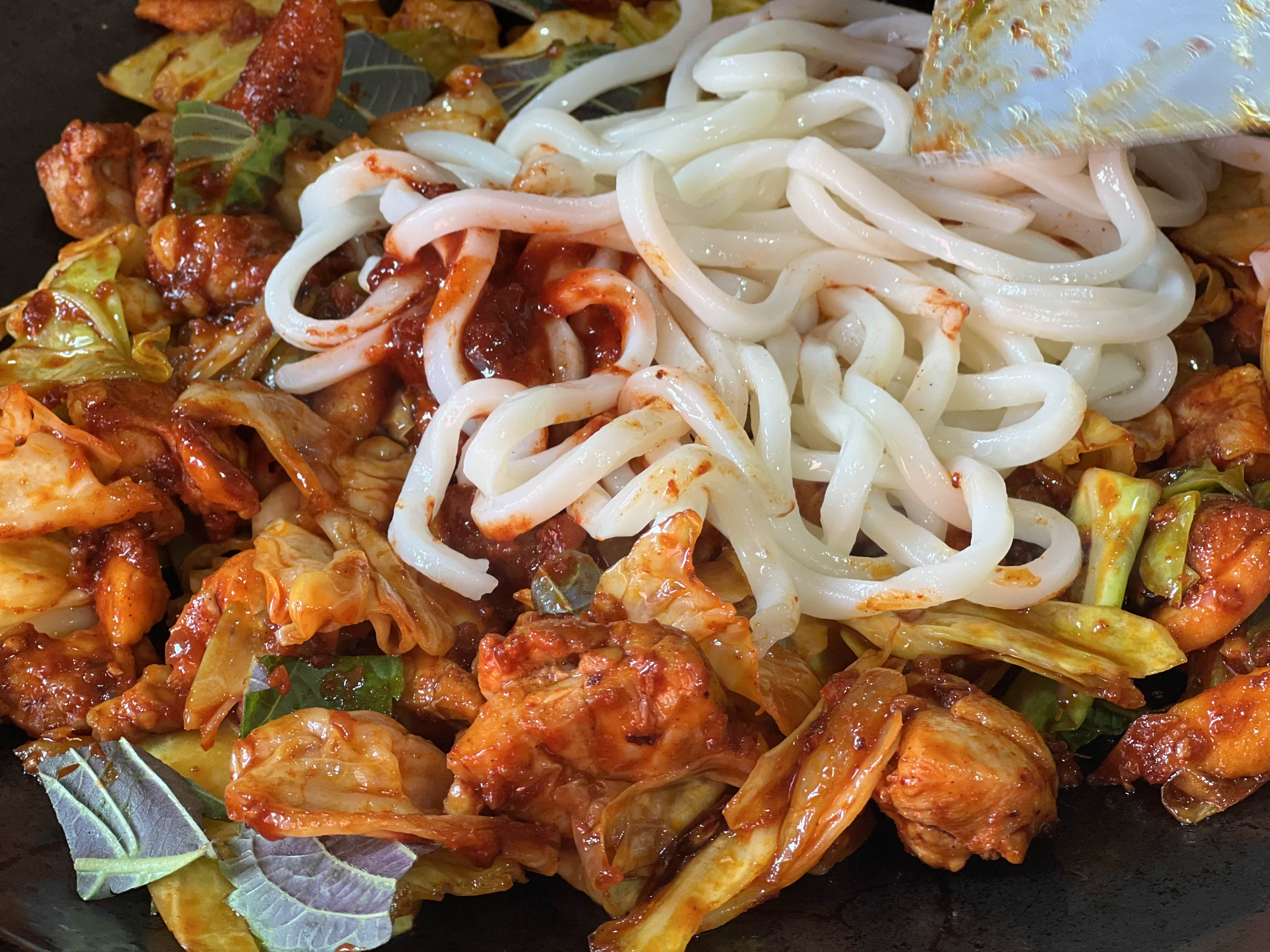 우동사리도 올리고 치즈도 올립니다. 치즈가 녹으면서 조금씩 닭갈비랑 섞어서 먹어주면 됩니다.