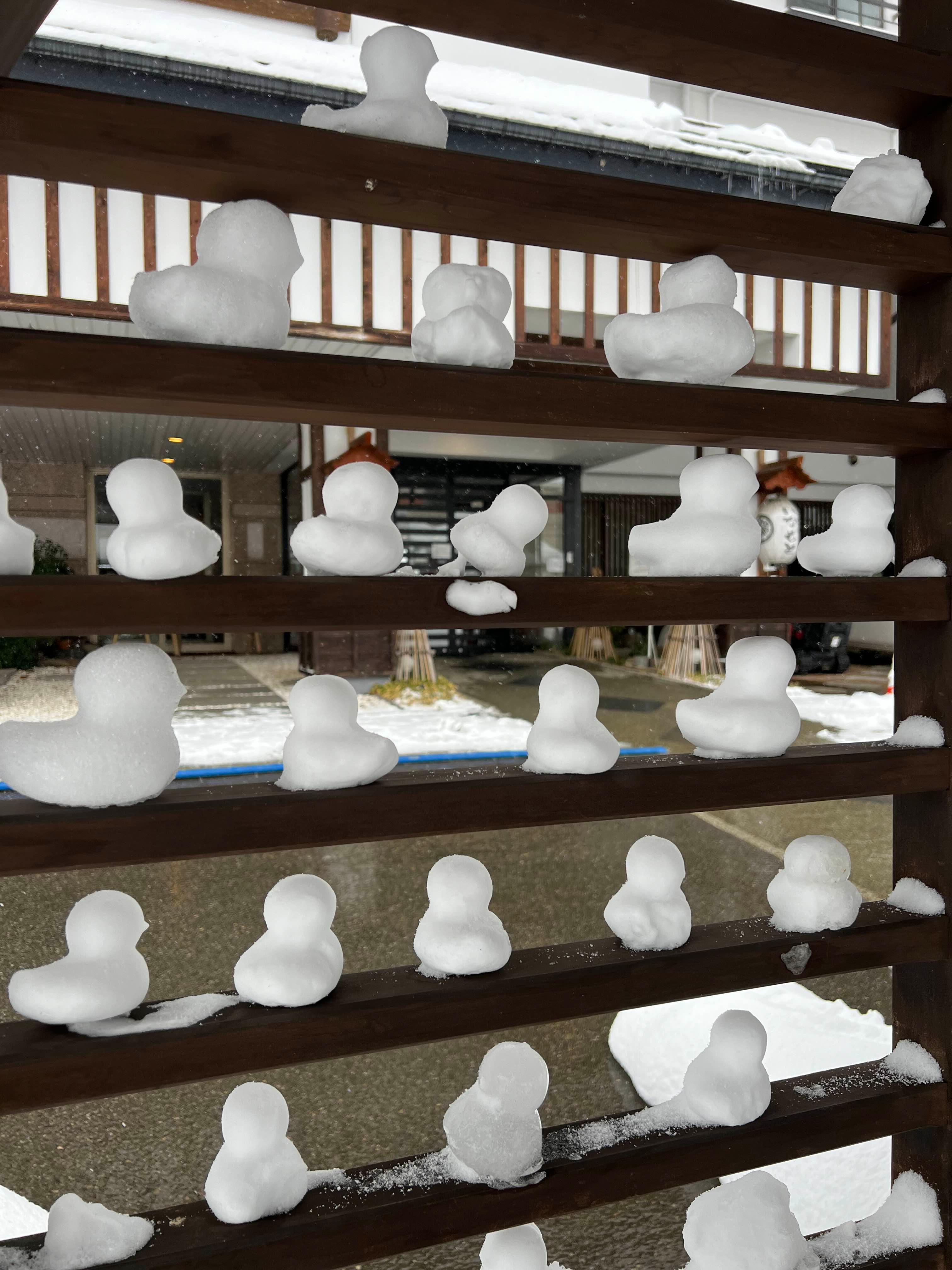 이렇게 창에 눈으로 오리를 만들어 놓아서 웃음을 짓게 만들더라고요.