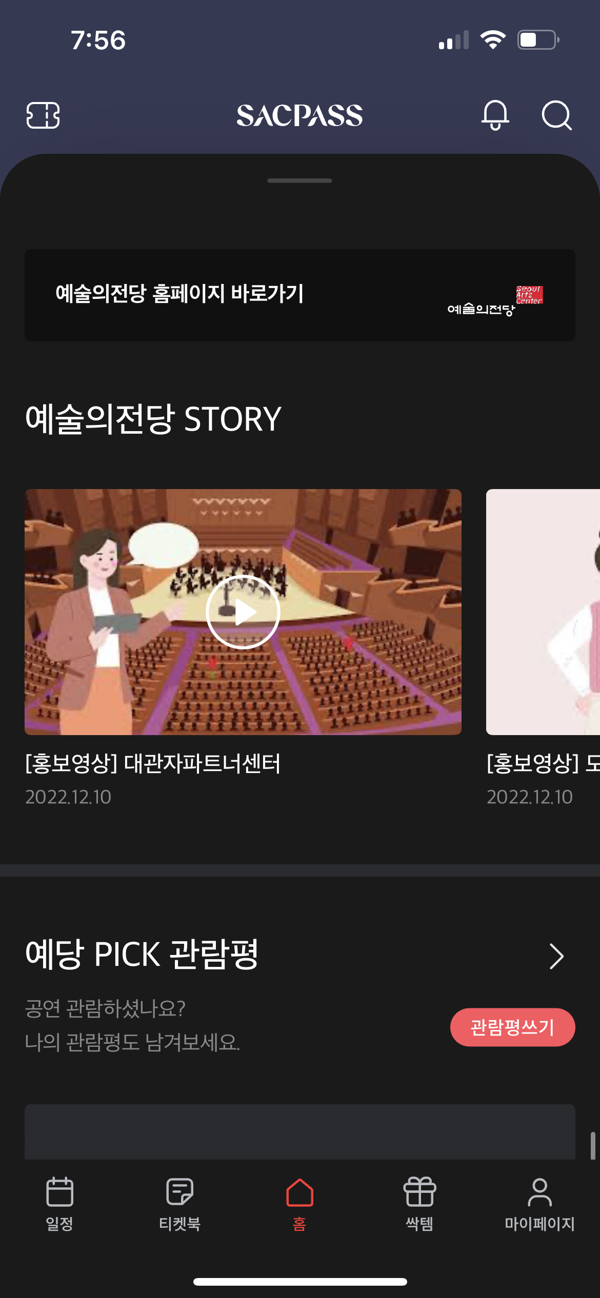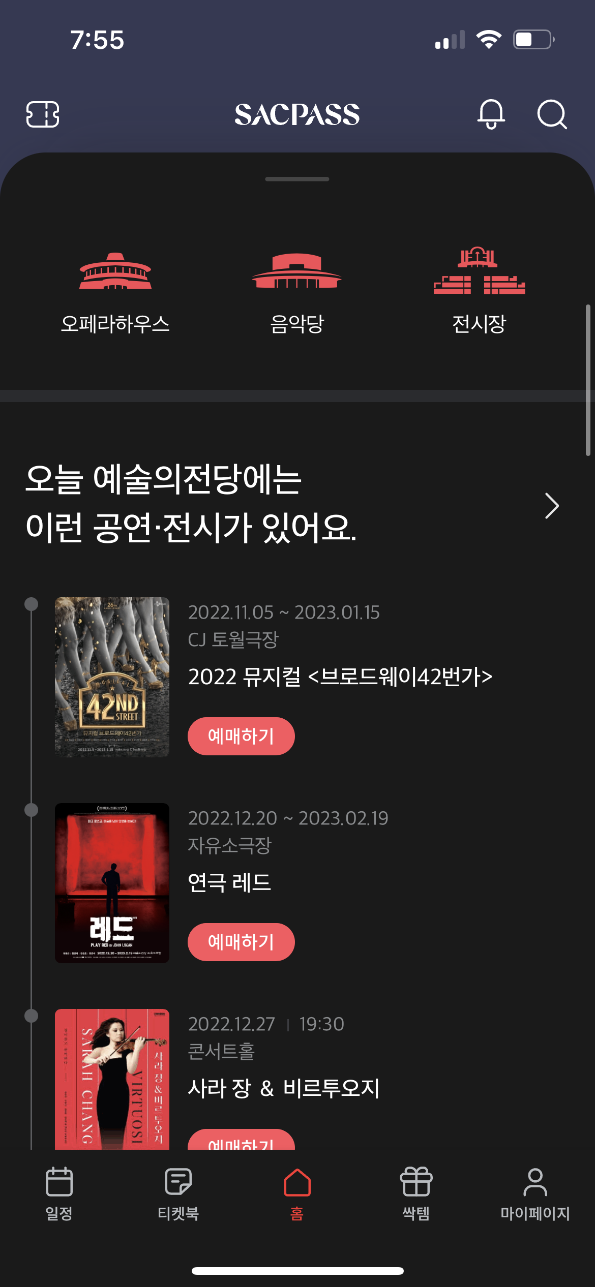 홈화면에는 최근 인기 있는 예술의전당 공연이 보이고, 스크롤로 내리면 공연 정보를 찾아볼 수 있어요.