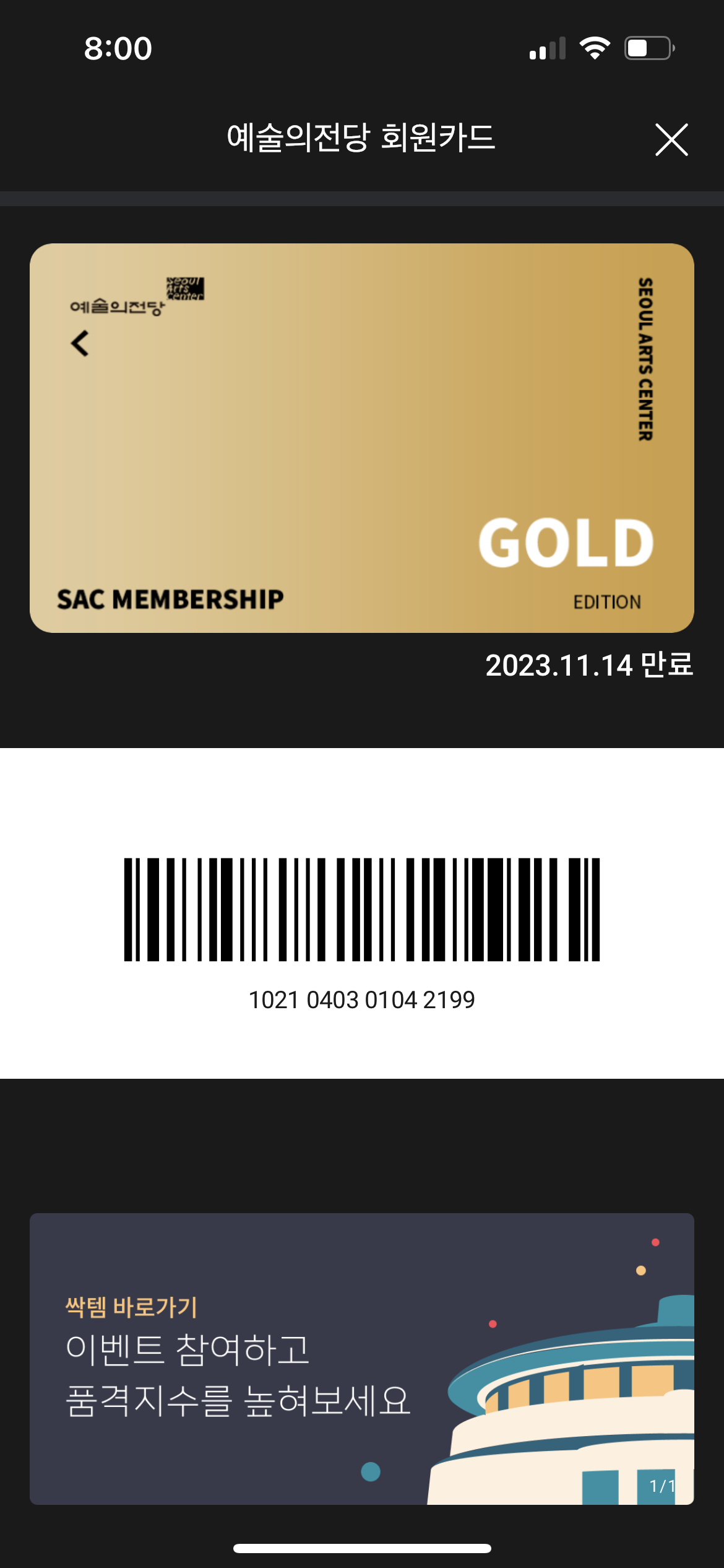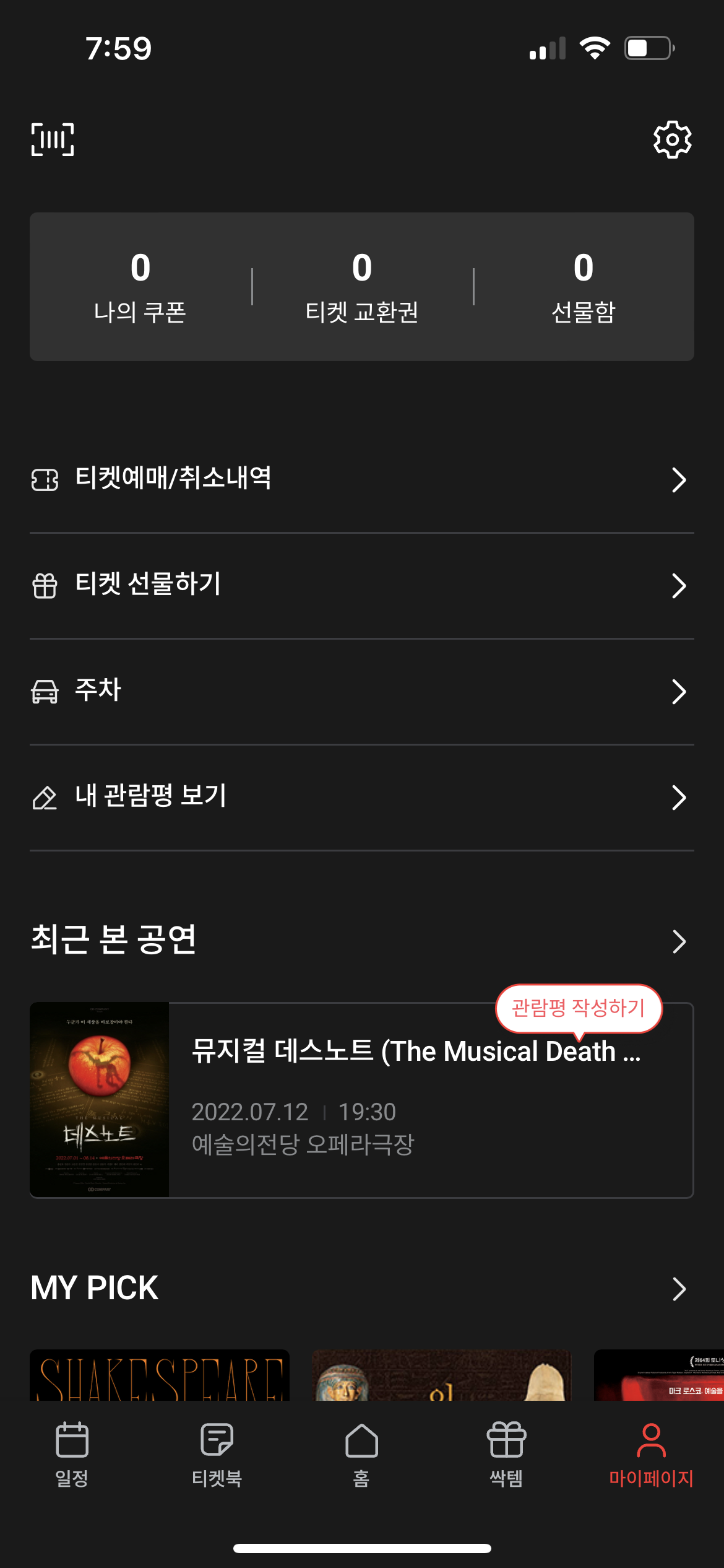 마이페이지 탭에서는 나의 쿠폰함/티켓교환권/선물함 등을 볼 수 있고, 예매내역/선물하기 내역/주차 등 나의 모든 내역등을 조회해볼 수 있는 페이지입니다. 내가 좋아요를 한 공연들의 소식도 모아볼 수 있고, 왼쪽 상단의 바코드 모양 버튼을 누르면 내 회원카드도 볼 수 있습니다. 이제는 불편하게 회원카드를 가지고 다닐 필요도 없고, 쉽게 조회할 수 있어서 좋아요. 앞으로는 주차권도 지류로 받지 않고 모바일로 받아서 쓸 수 있어서 매번 올 때마다 챙길 필요가 없게 됐습니다.