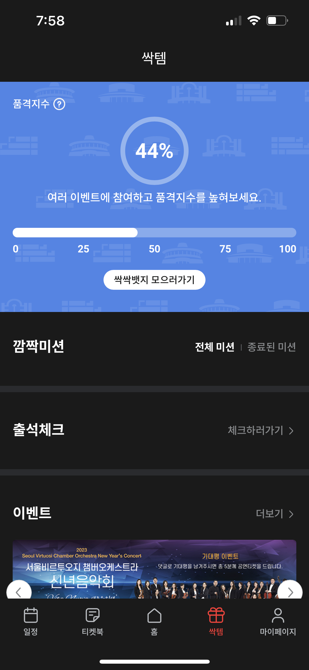 그리고 품격지수와 싹싹뱃지가 있어서 제가 앱에서 활동하는 내용들을 바탕으로 품격지수가 올라가고 뱃지도 받을 수 있어요. 뱃지를 모으는 재미도 있고 모으면 모을수록 예술의전당 이미지가 보여지도록 만들어졌습니다. 저도 들어간 김에 뱃지를 받아보려고 이것저것 많이 해봤습니다. 뱃지나 품격지수도 높으면 어떤 선물이라도 생기지 않을까 싶어서 2023년도에는 한번 다 채워봐야겠어요!