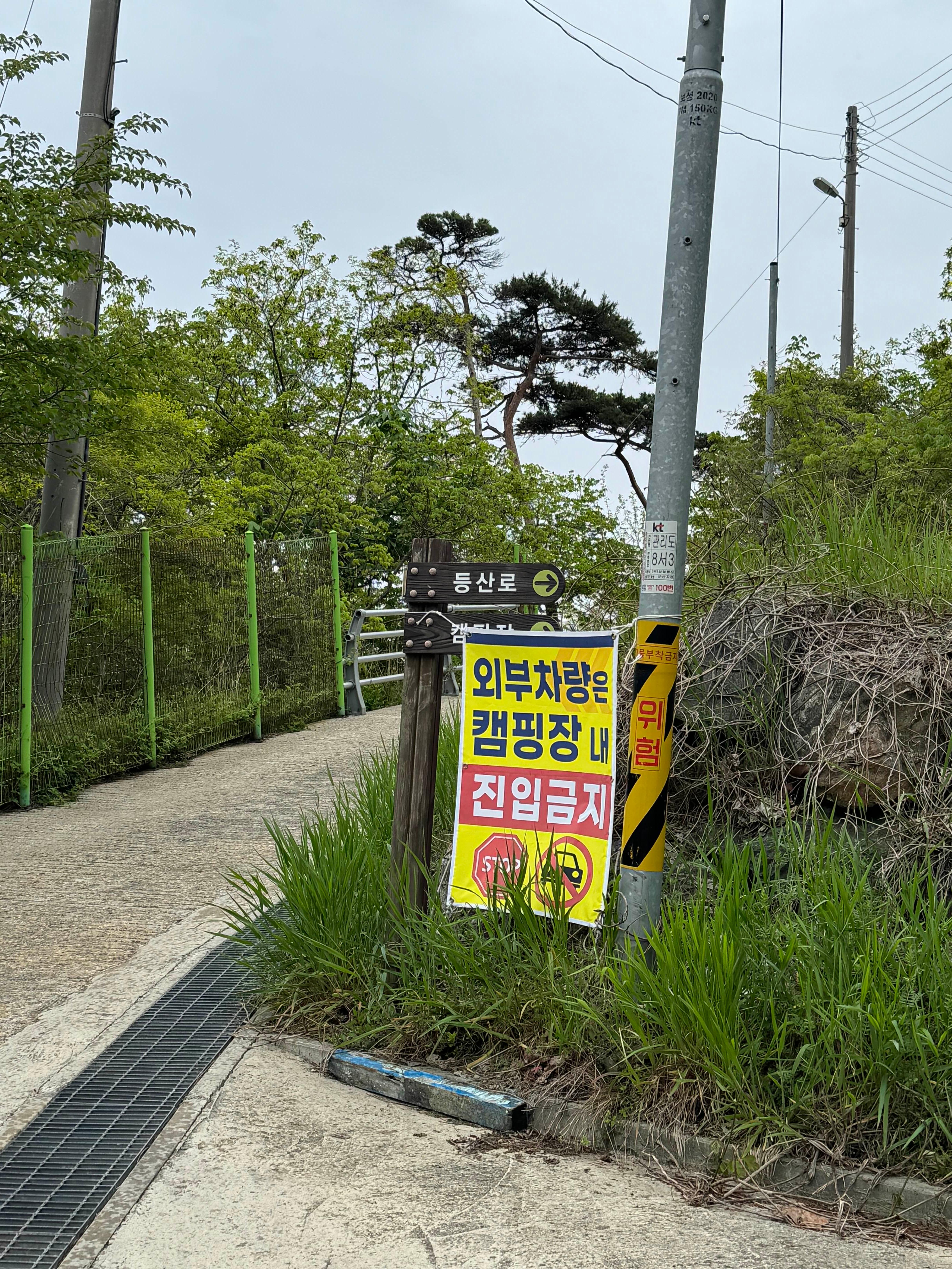 등산로를 따라서 올라가면 캠핑장 이정표가 나옵니다. 사이트랑 부대시설 위치를 기억해 두는 것이 좋아요!