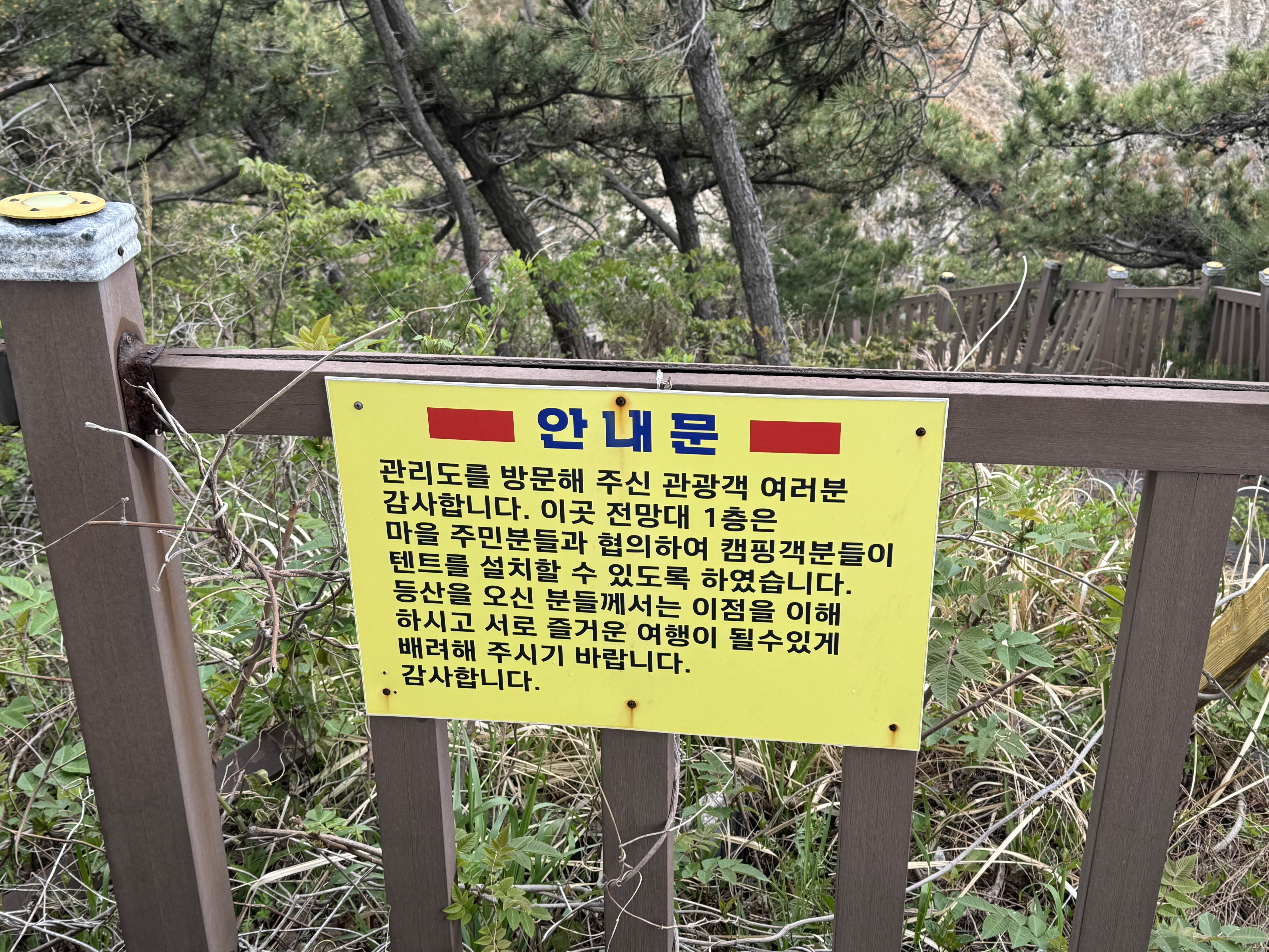 캠핑장 이외에 곳에서 캠핑하거나 백패킹을 하시는 것은 주민들에게 피해가 될 수 있으므로 자제해주셔야 합니다.