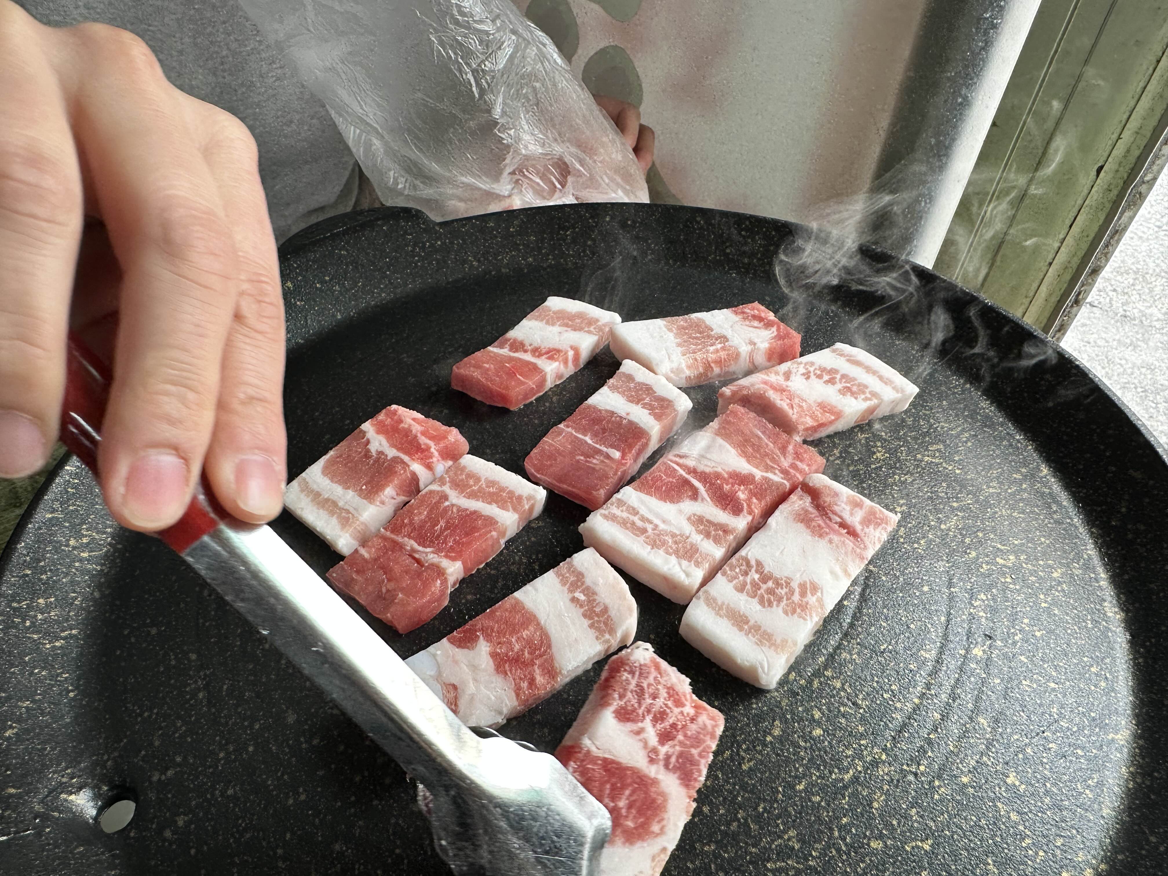 공기밥은 별도고 1근에 45,000원입니다. 생삼겹살이라고 되어 있지만 약간은 냉동인거 같은 느낌입니다. 고기는 사진처럼 비닐에 담아서 주십니다.