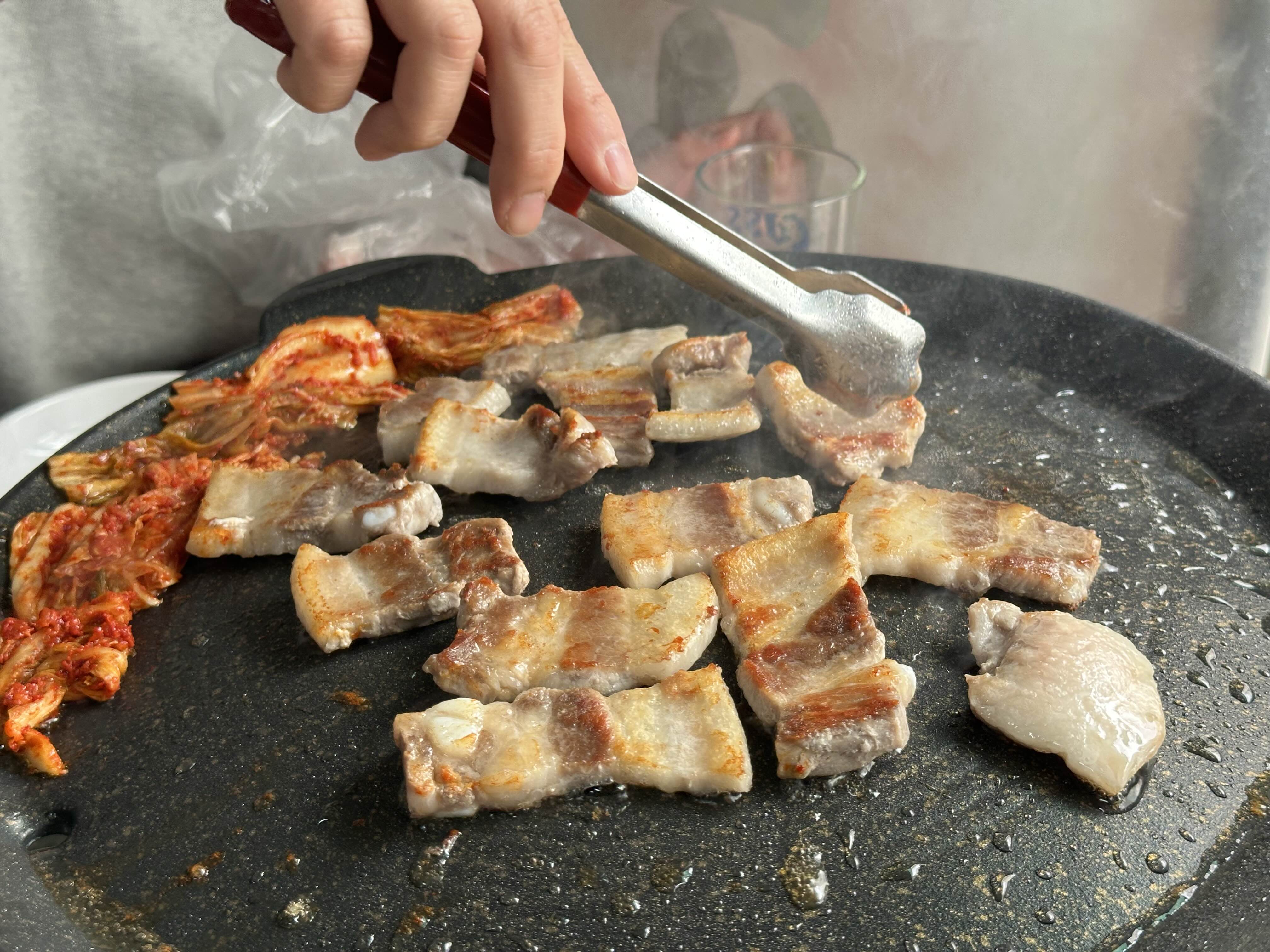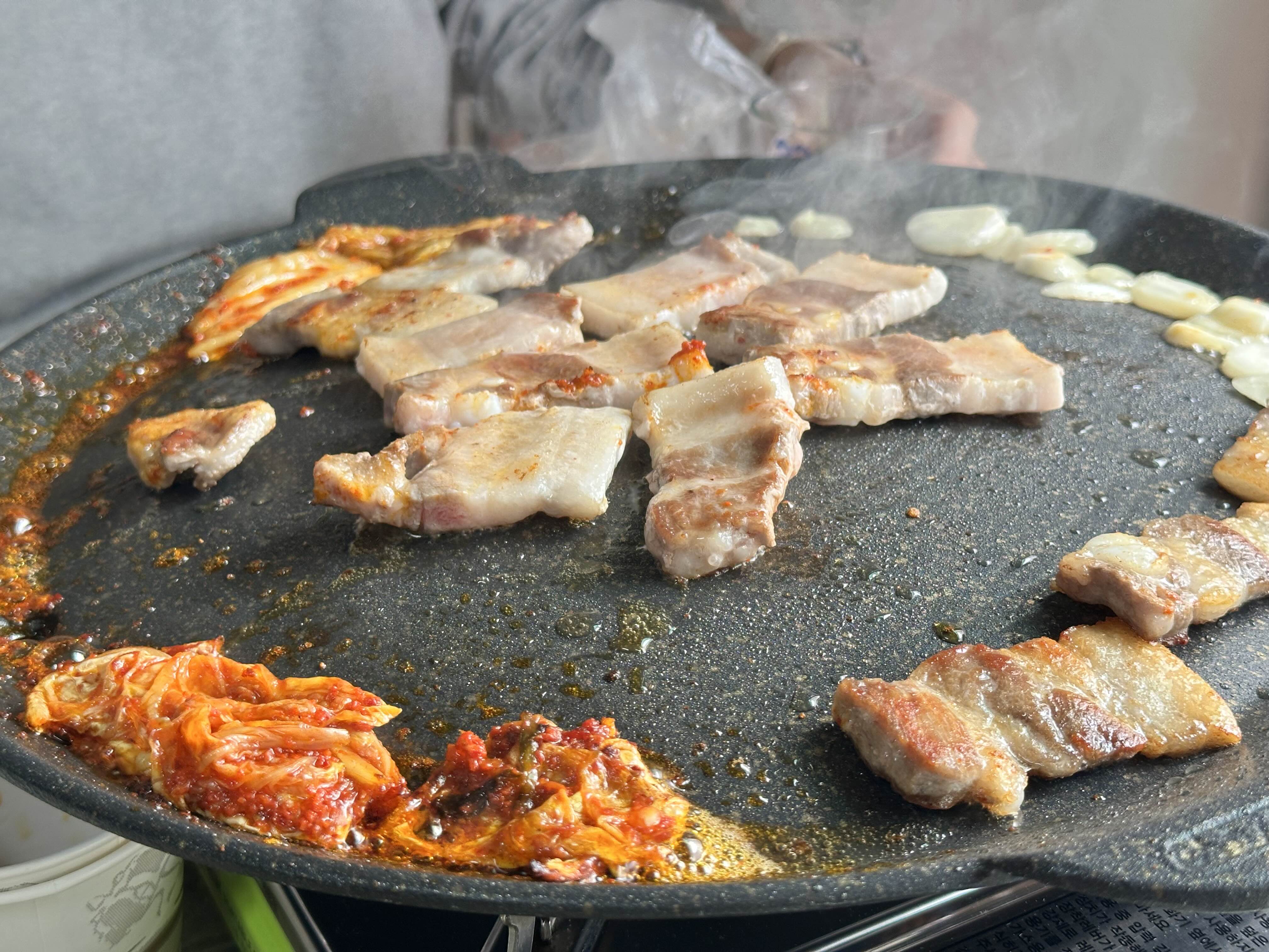 고기구워주면 기름이 주변으로 흘러나옵니다. 그럼 김치를 올려주거나 마늘도 구워주고 해주세요.
