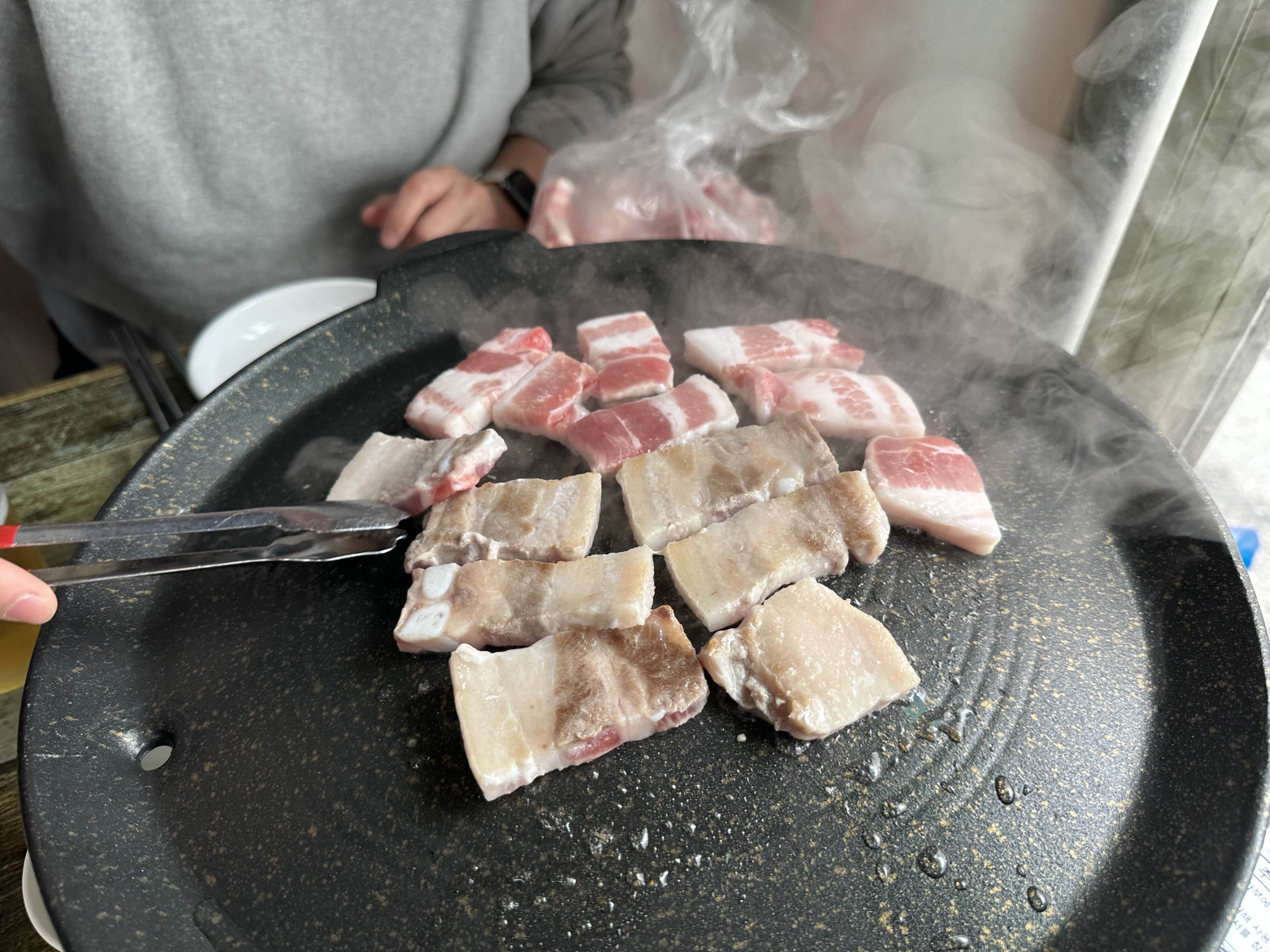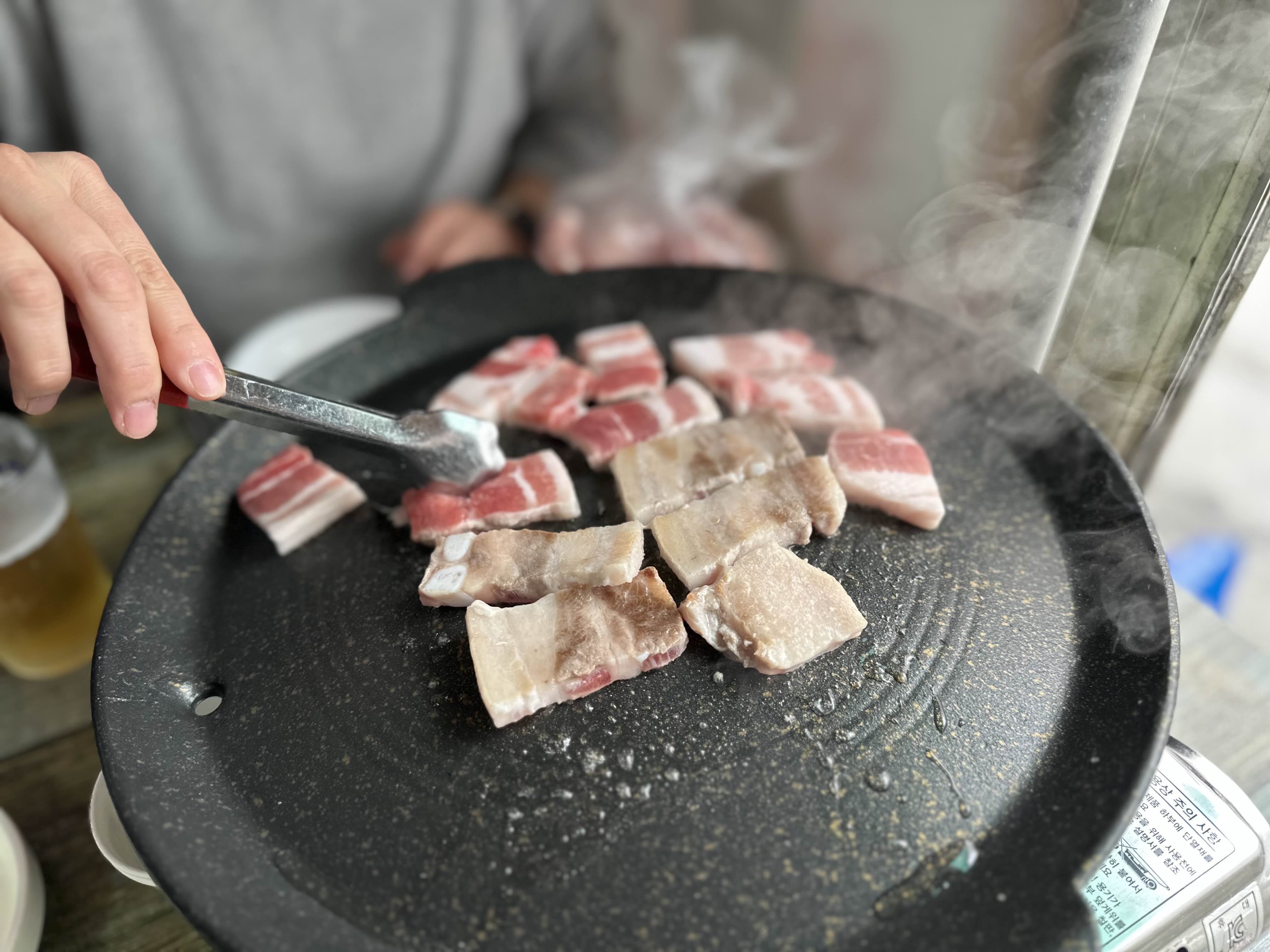 고기 굽기 전에 맥주한잔 마셔주고 불판이 달아오르면 고기를 올려줍니다. 고기는 꼭 불판의 온도가 달아올랐을 때 올려주세요!