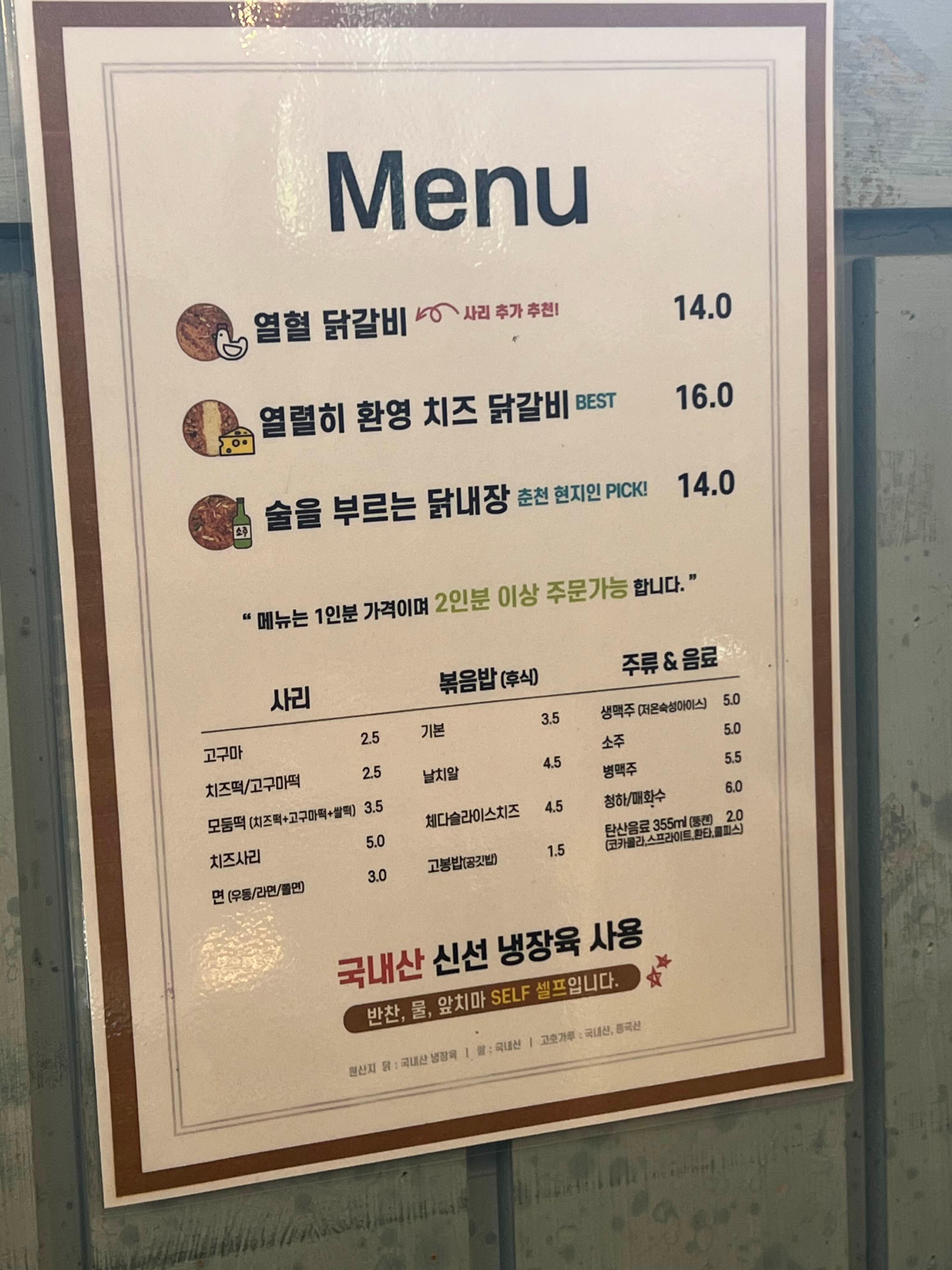 예전에 횟집이 있었는데 어느 순간 닭갈비 집으로 바뀌어 있더라고요. 그래서 몇 번 지나치긴 했는데 지나갈 때마다 사람들이 꽉 차 있었어요. 그리고 그 숯의 향기가 막 나오는데 한번 가서 먹