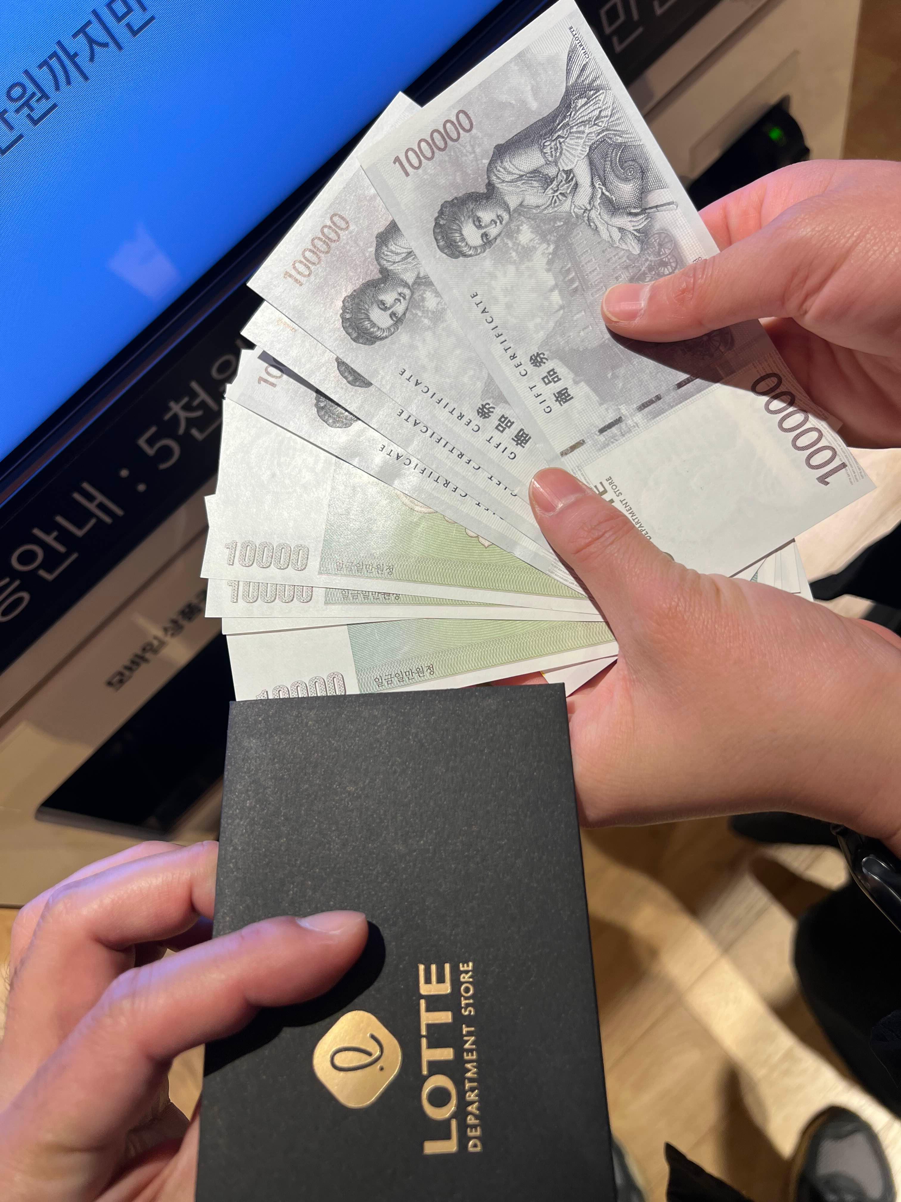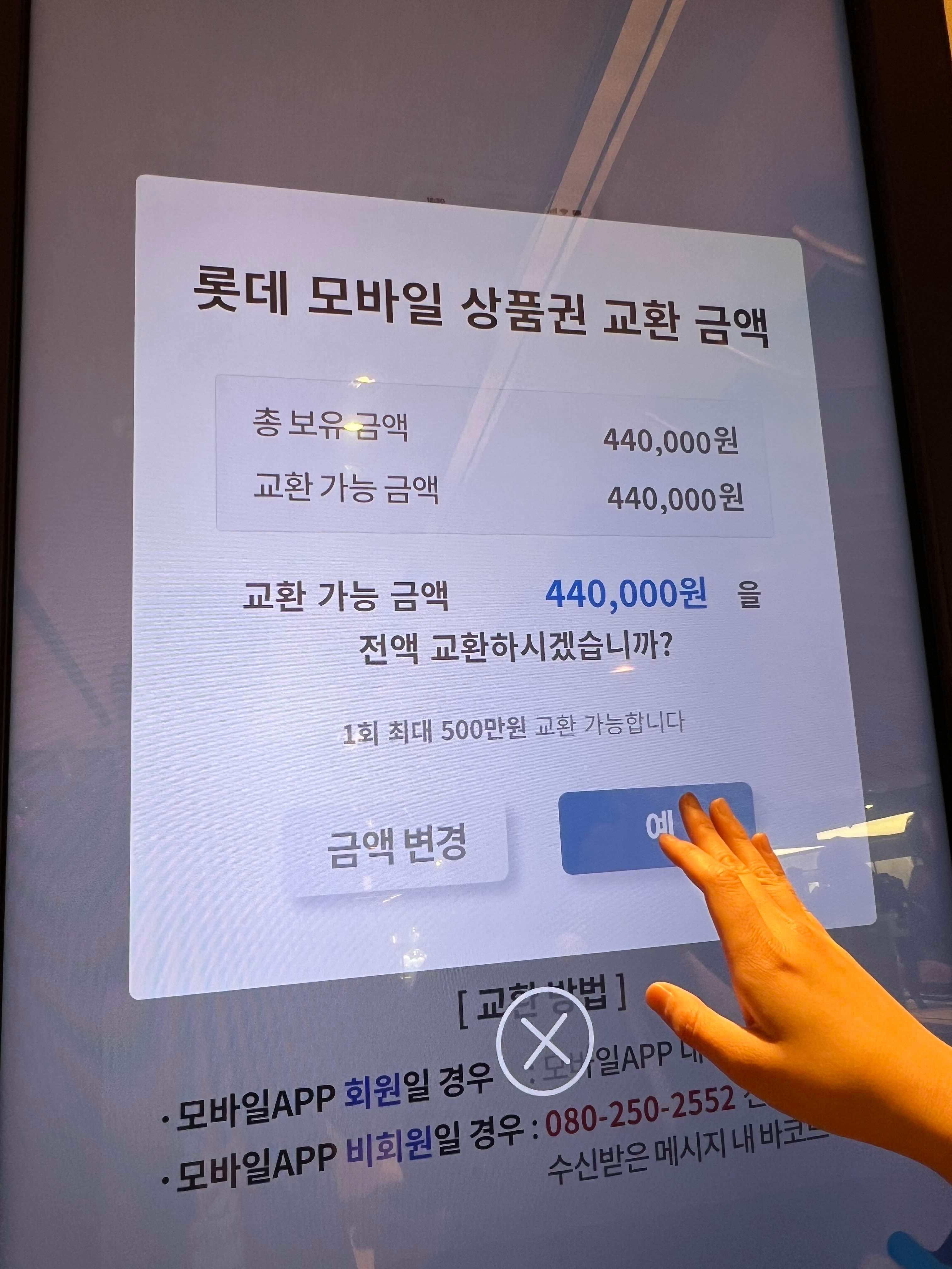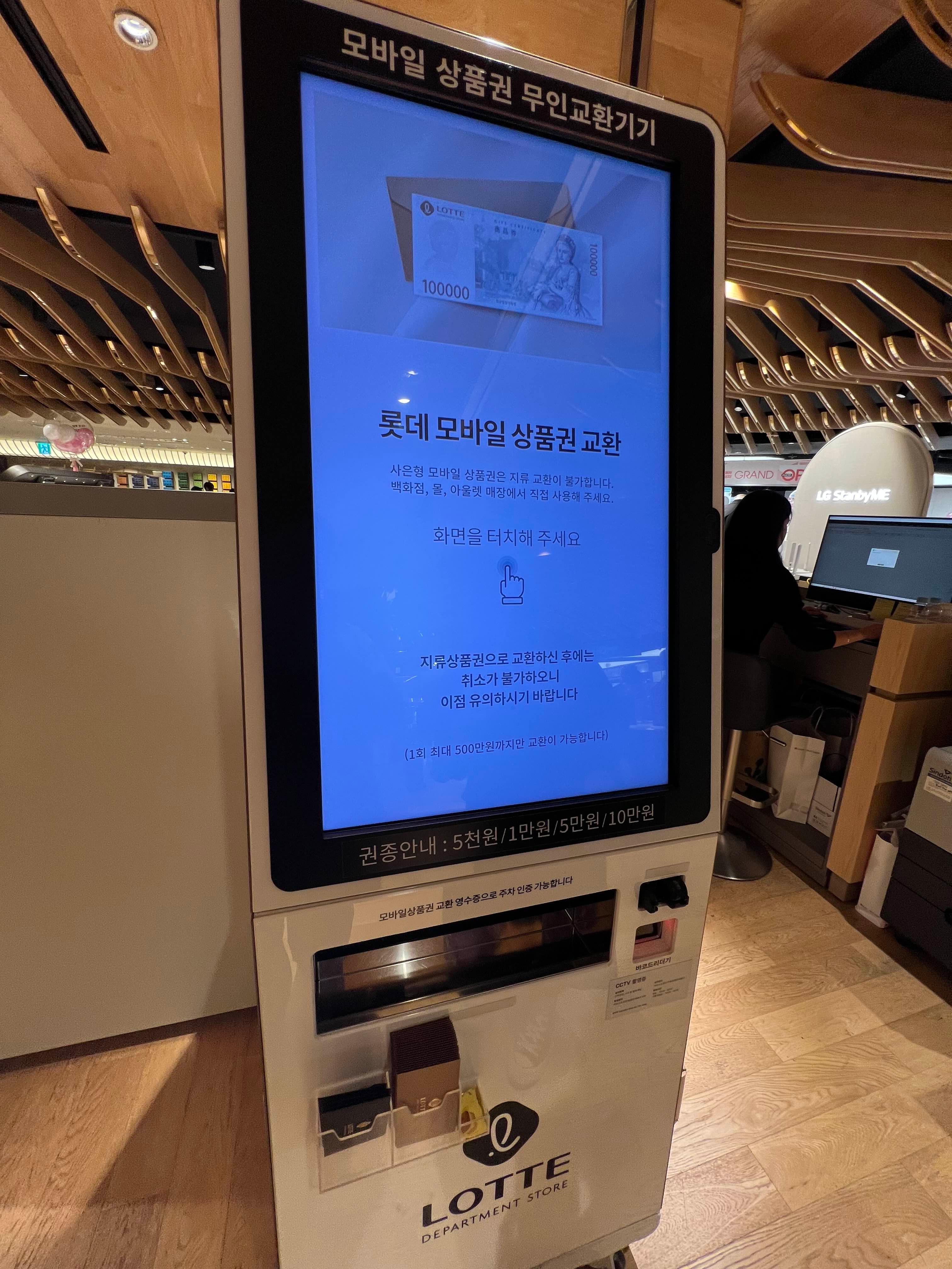 저희는 명동 쪽에 있는 롯데백화점으로 방문했고, 14층에 엘지전자 앞에 있는 모바일 상품권 무인교환기기에 가서 바코드를 인식하면 모바일 상품권이 나옵니다. 봉투도 앞에 구비되어 있어서 상품권을 고이 담아 백화점을 탈출합니다. 백화점에 가니까 또 눈이 돌아서 상품권 교환하러 갔다가 쇼핑하고 오는 사례도 있으니 충동구매 조심하세요.ㅋㅋㅋㅋ