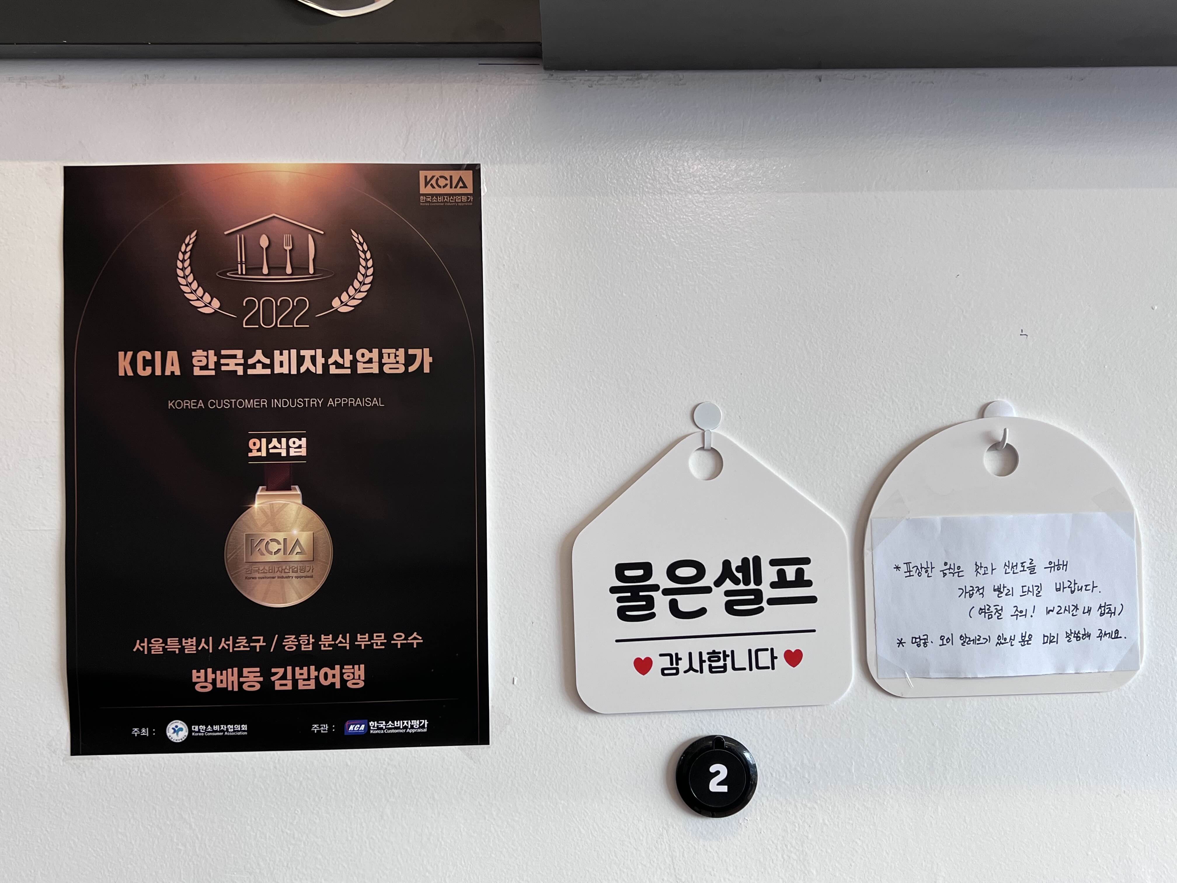 두 개의 김밥여행이 중간에 문으로 연결되어 있습니다. 들어가면 꽤 넓은 곳이에요. 혼자 먹는 공간도 있어서 혼밥족도 눈치볼 필요 없이 자유롭게 이용해도 될 것 같아요. 앞에는 메뉴배너와 2022년 KCIA 한국소비자산업평가 우수상 배너가 걸려있어요. 나중에 후기를 찾아보니까 라면도 유명해서 해장하러 많이들 가시는 것 같습니다. 라면은 먹어보지 못했지만 라국밥(라면+밥)도 있어서 한번 해장으로 먹어보고 싶었습니다.