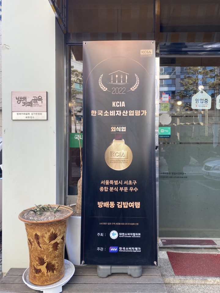 오늘은 산책을 할 겸 집 밖으로 나섰다가 출출해서 들른 분식집을 포스팅해보려고 합니다. 오후 3시쯤 한가한 시간에 마침 분식집이 있어서 들어갔습니다. 찾아서 간 곳은 아니었습니다. 근데 들어가서 보니 2022년도에 KCIA 한국소비자산업평가에서 서울시 서초구 종합분식 부문 우수상을 받은 곳이었어요. 할머니나 아줌마가 운영하시는 곳인가 해서 들어갔는데 젊은 남성분이 운영하고 있었고, 메뉴도 참신한 게 많아서 궁금증을 유발했습니다.