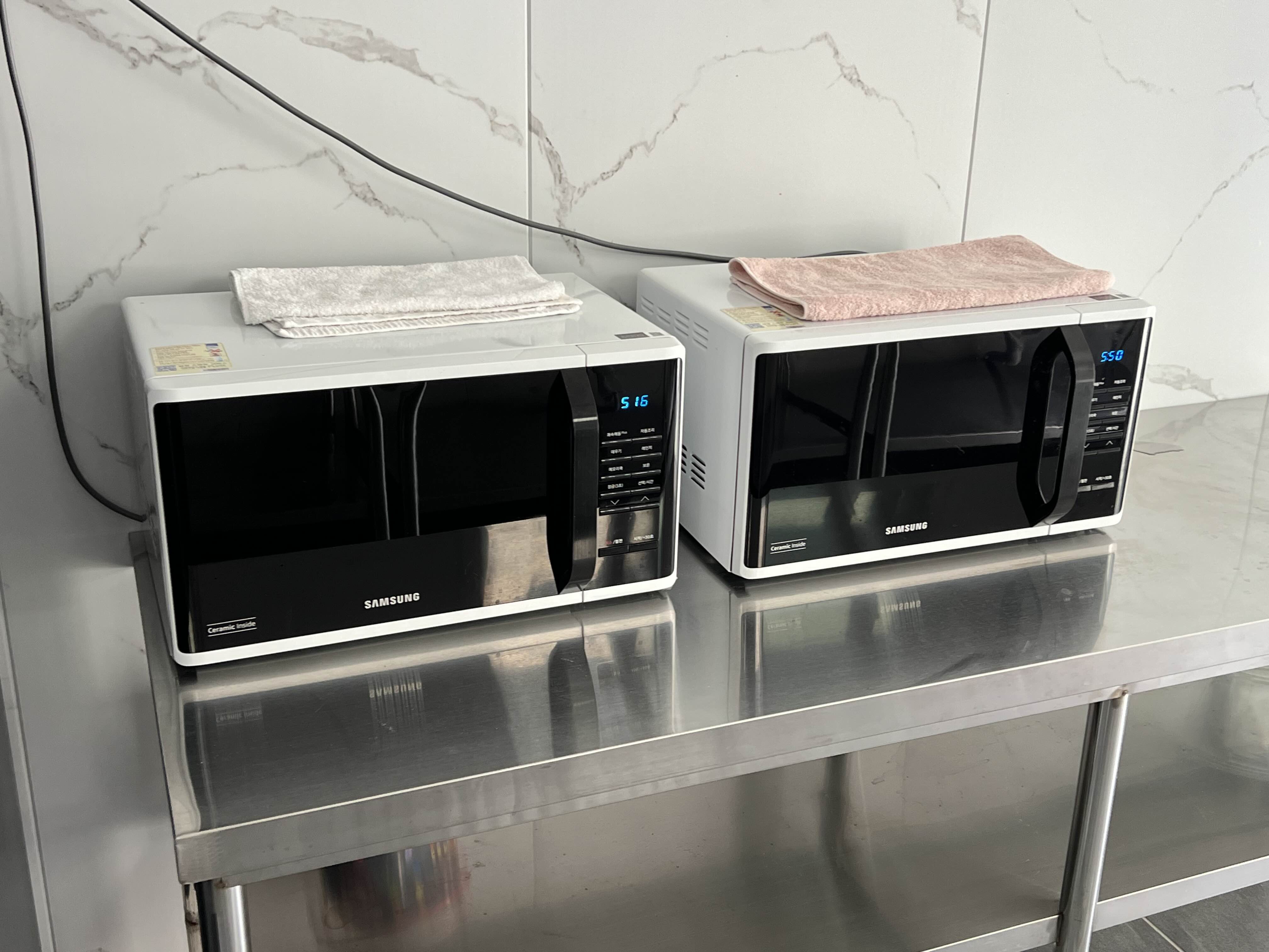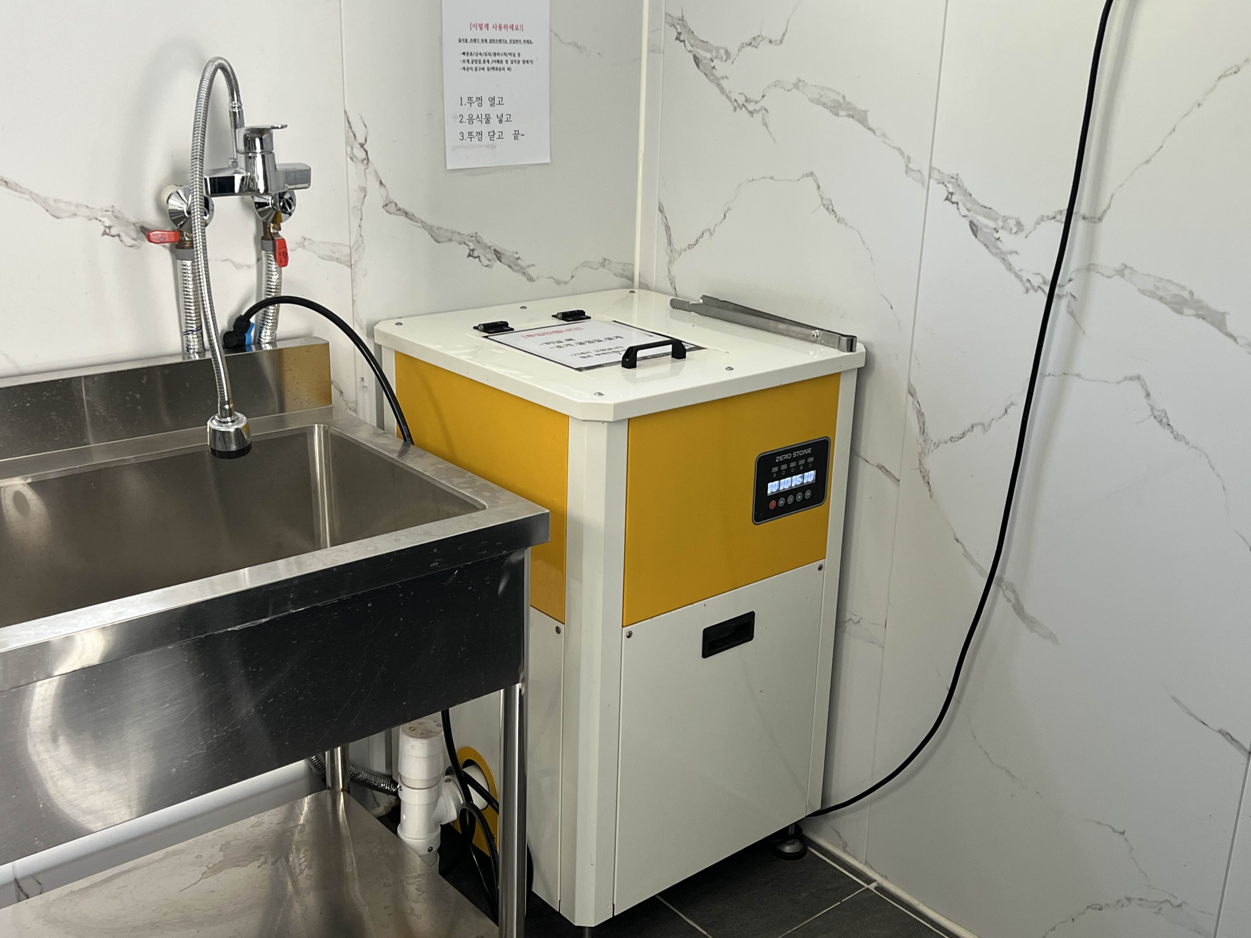 개수대도 넉넉하고 세제랑 수세미도 구비되어 있습니다. 냉장고도 커서 아이스박스 없는 분들은 사용해도 될 것 같아요! 저는 왔다갔다하기 싫어서 이용하지 않았는데 회나 고기류, 술 가져오신 분들은 이용해서 시원하게 드세요! 햇반 같은 거나 밀키트 데워먹을 수 있도록 전자레인지도 2대나 있습니다. 그리고 음식물 처리기도 있어서 발생한 음식물은 음식물처리기에 넣으면 됩니다.