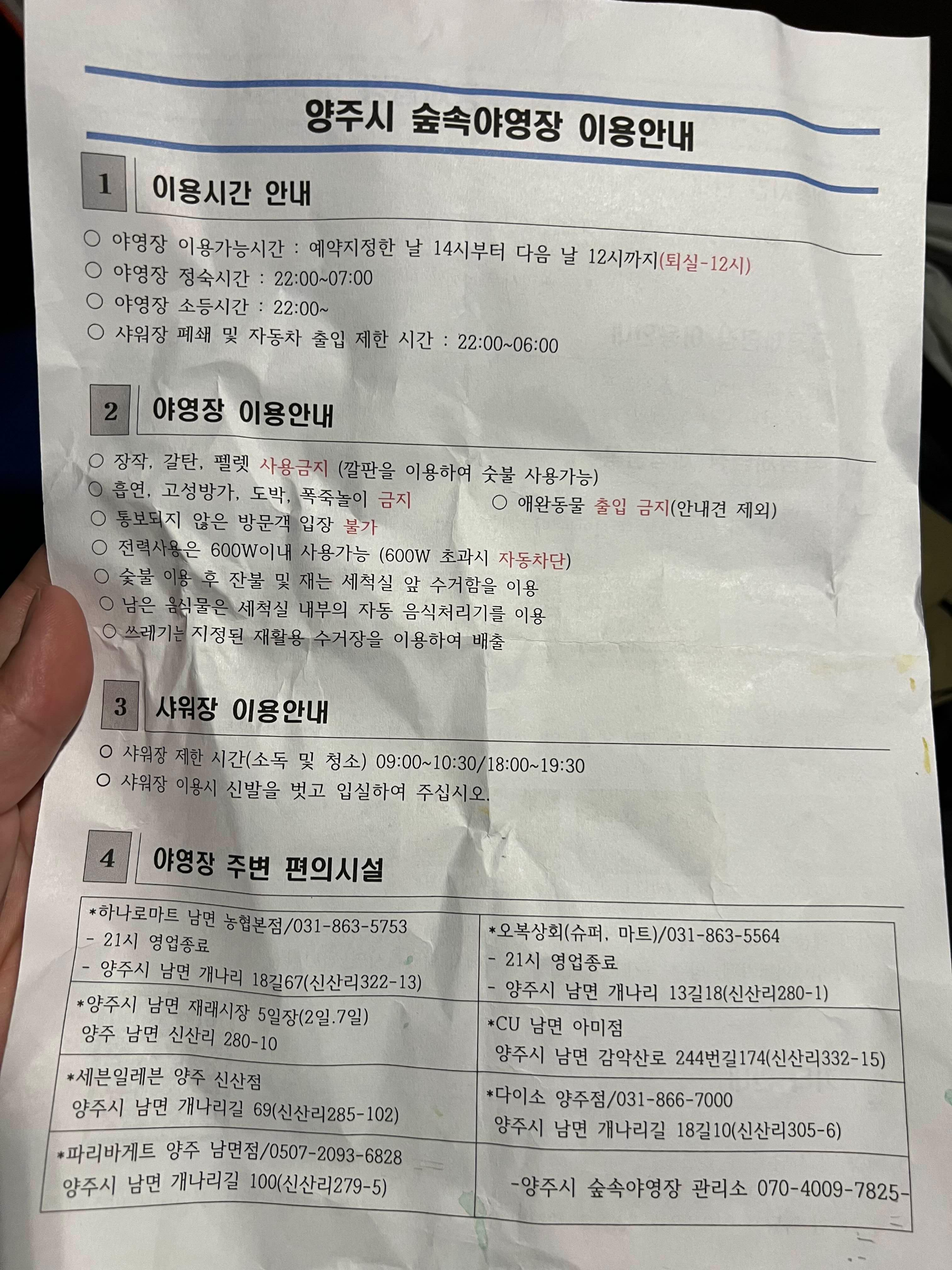 제가 가본 야영장 중에서 가장 깨끗했습니다. 원래 화장실이 더럽고 벌레들이 우글우글한데 정말 벌레도 없고 샤워장도 수전이 반짝거려서 놀랬습니다. 관리가 정말 잘 되고 있었고, 서울에서 1시간 정도로 올 수 있는 곳이니 간편하게 1박 2일 하기 좋습니다.