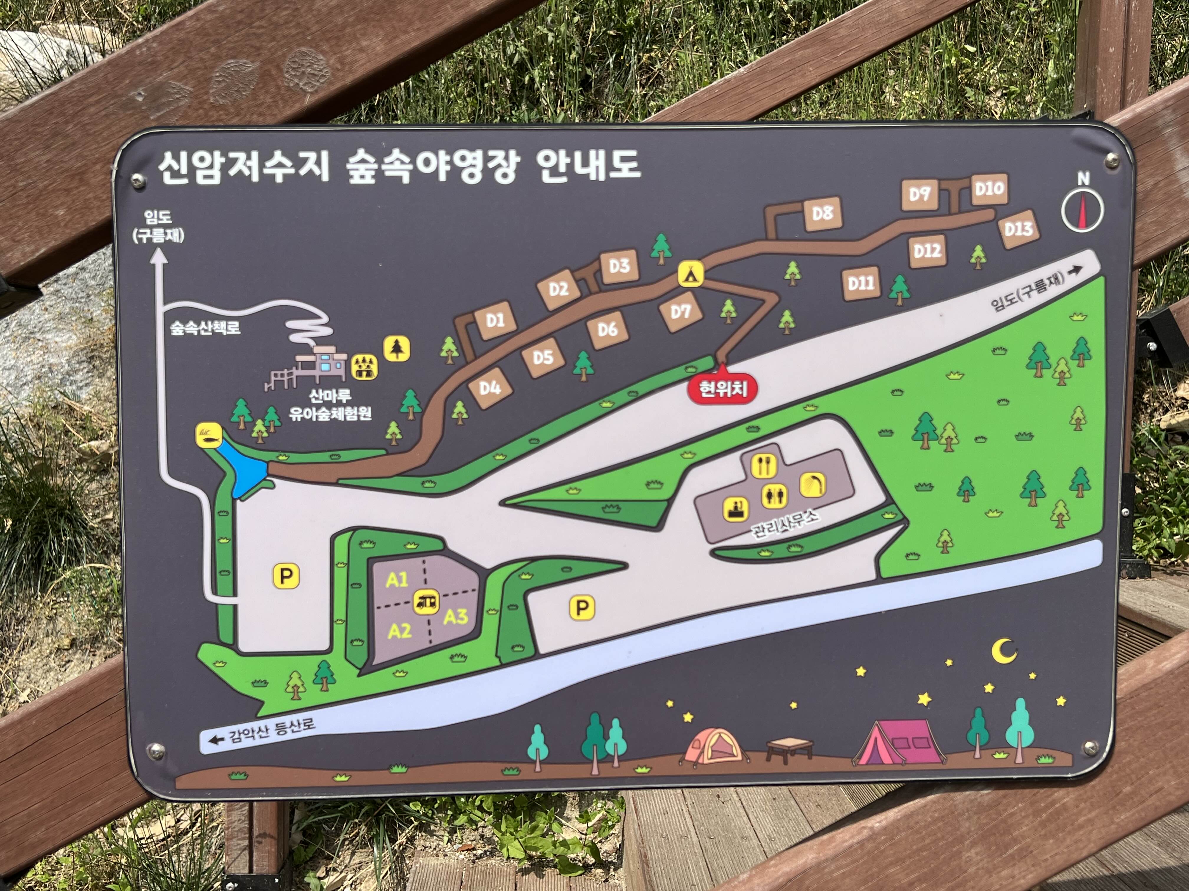 신암저수지 숲속야영장에는 산마루 유아숲체험원이 있어서 놀 수 있는 공간이 있습니다. 아이들이랑 체험원에서 같이 놀아주실 수 있습니다. 아이들이랑 같이 간다면 유아숲체험원 주변으로 사이트 잡으면 좋아요.