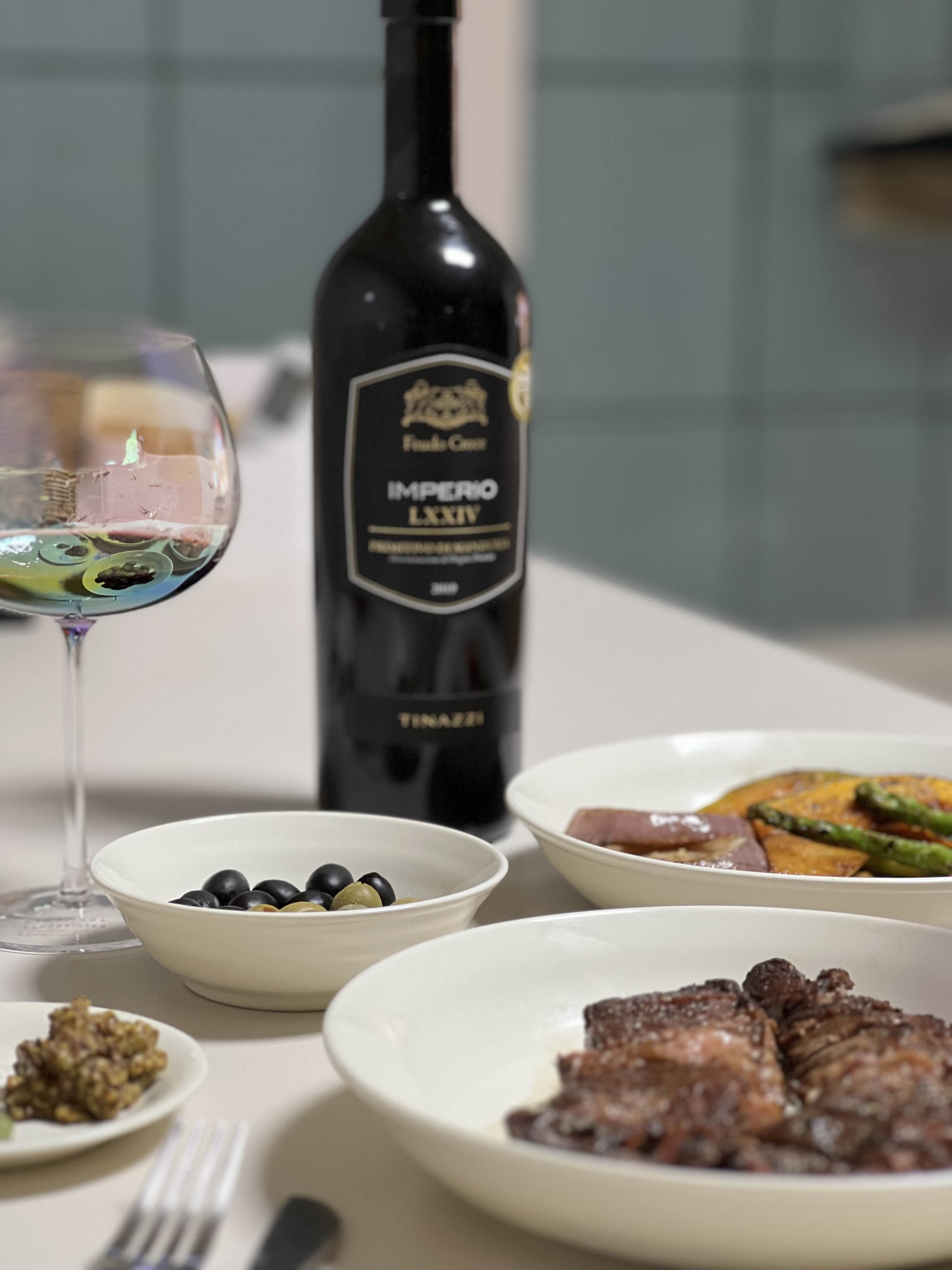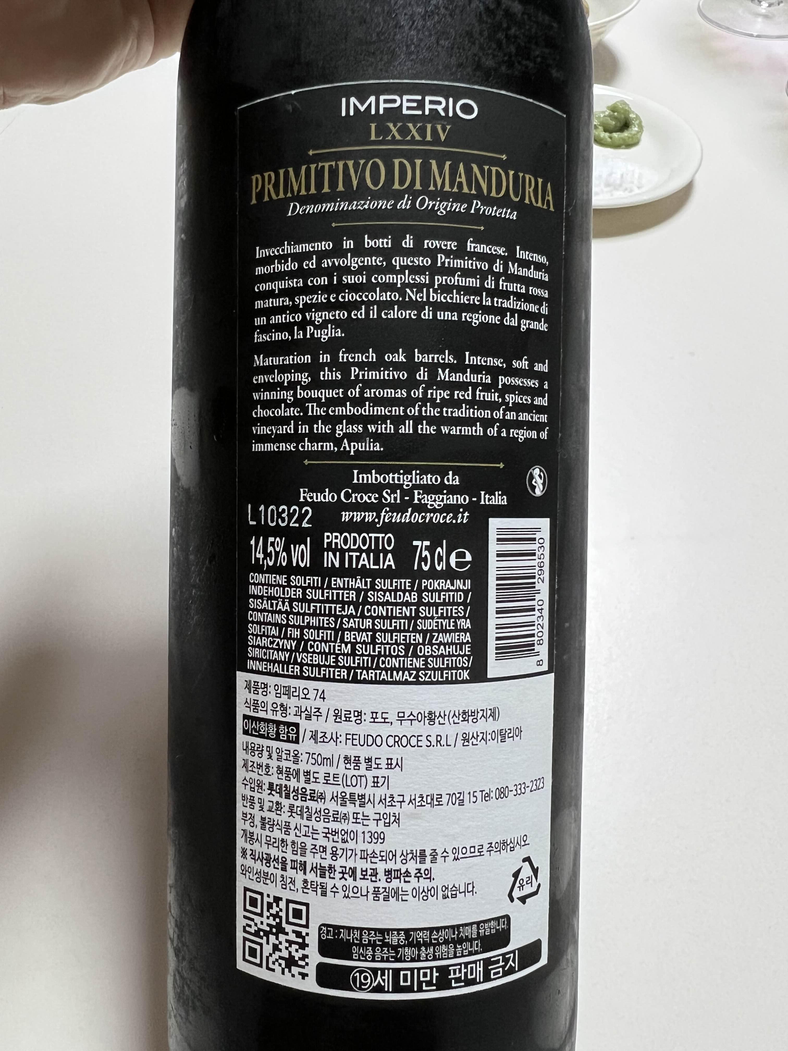 연말에 마시려고 사놨던 와인을 새해가 되고 나서야 집에서 오픈하게 됐다. 그래도 항상 와인이 집에 있다는 건 마음이 든든해지는 것 같다. 와인 2-3병쯤은 집에 두고 있는 것이 좋다는 생각이다. 그래서 오늘의 와인은 Feudo Croce Imperio LXXIV Primitivo di Manduria라는 와인이다.