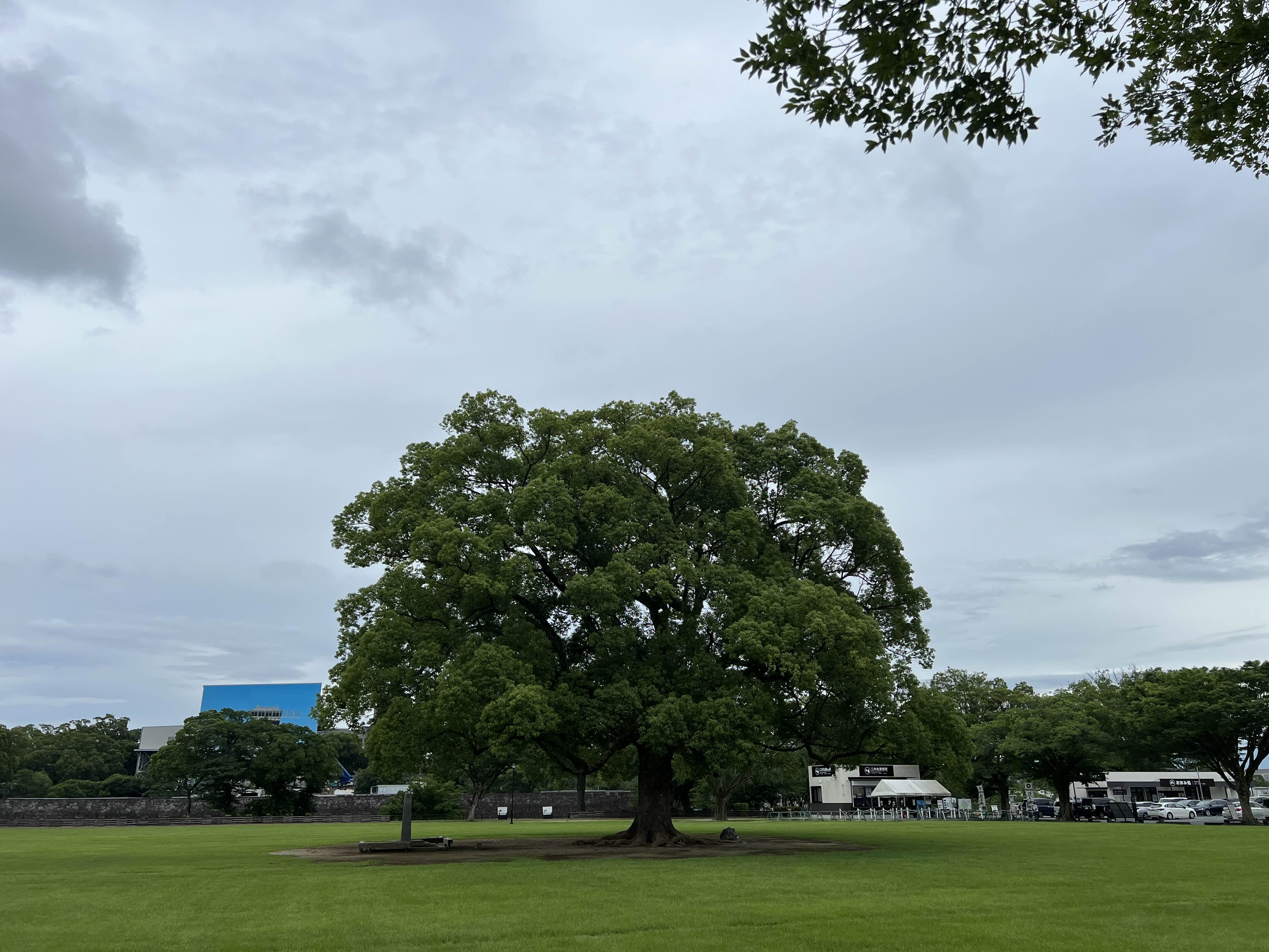 쿠마모토성에서 내려오면 주차장 옆으로 큰 나무와 잔디밭이 있습니다.