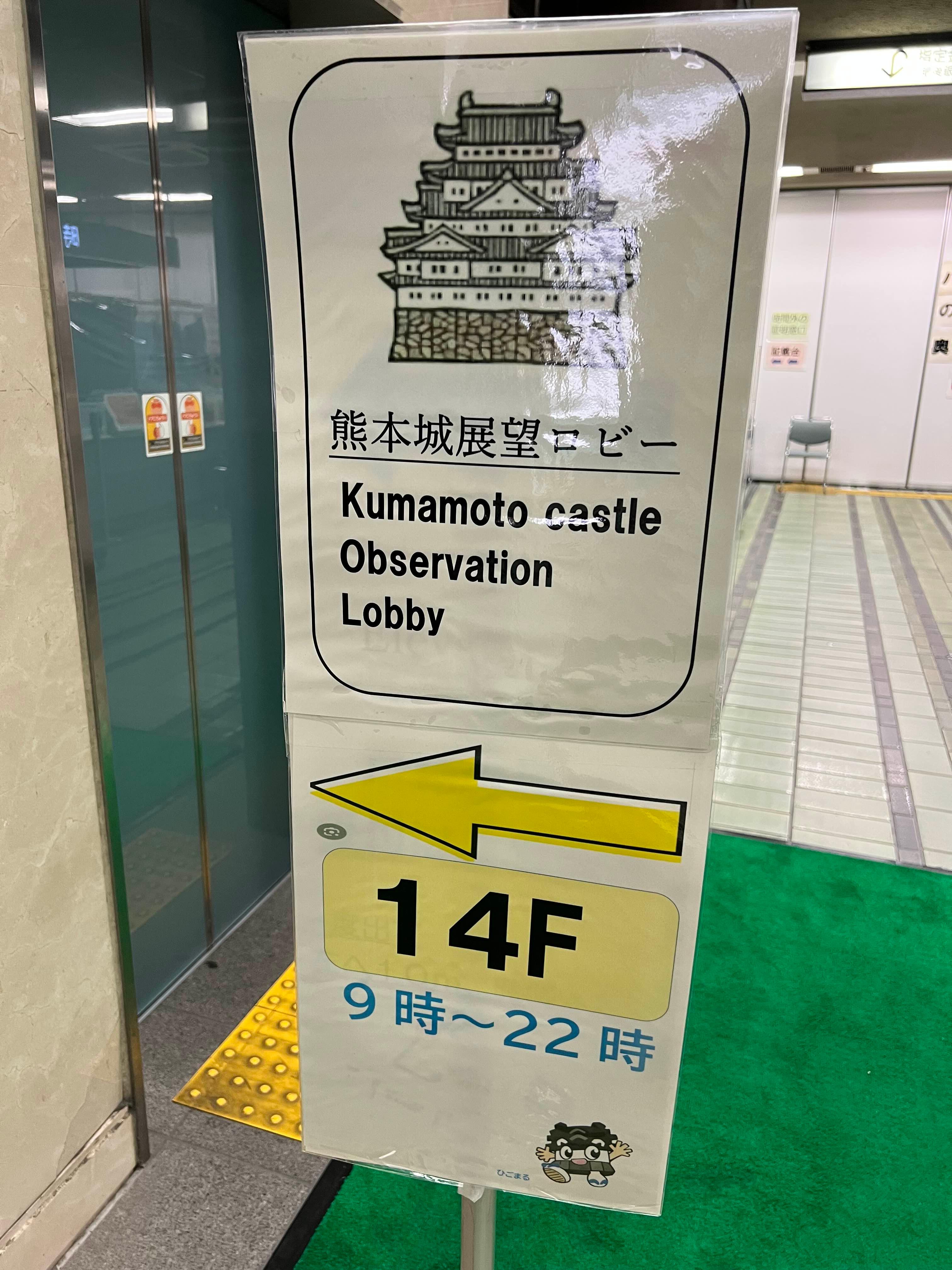 쿠마모토 시청에 들어가면 엘리베이터 앞에 이렇게 표지판이 있어서 전망대 14층이라고 안내되어 있습니다.