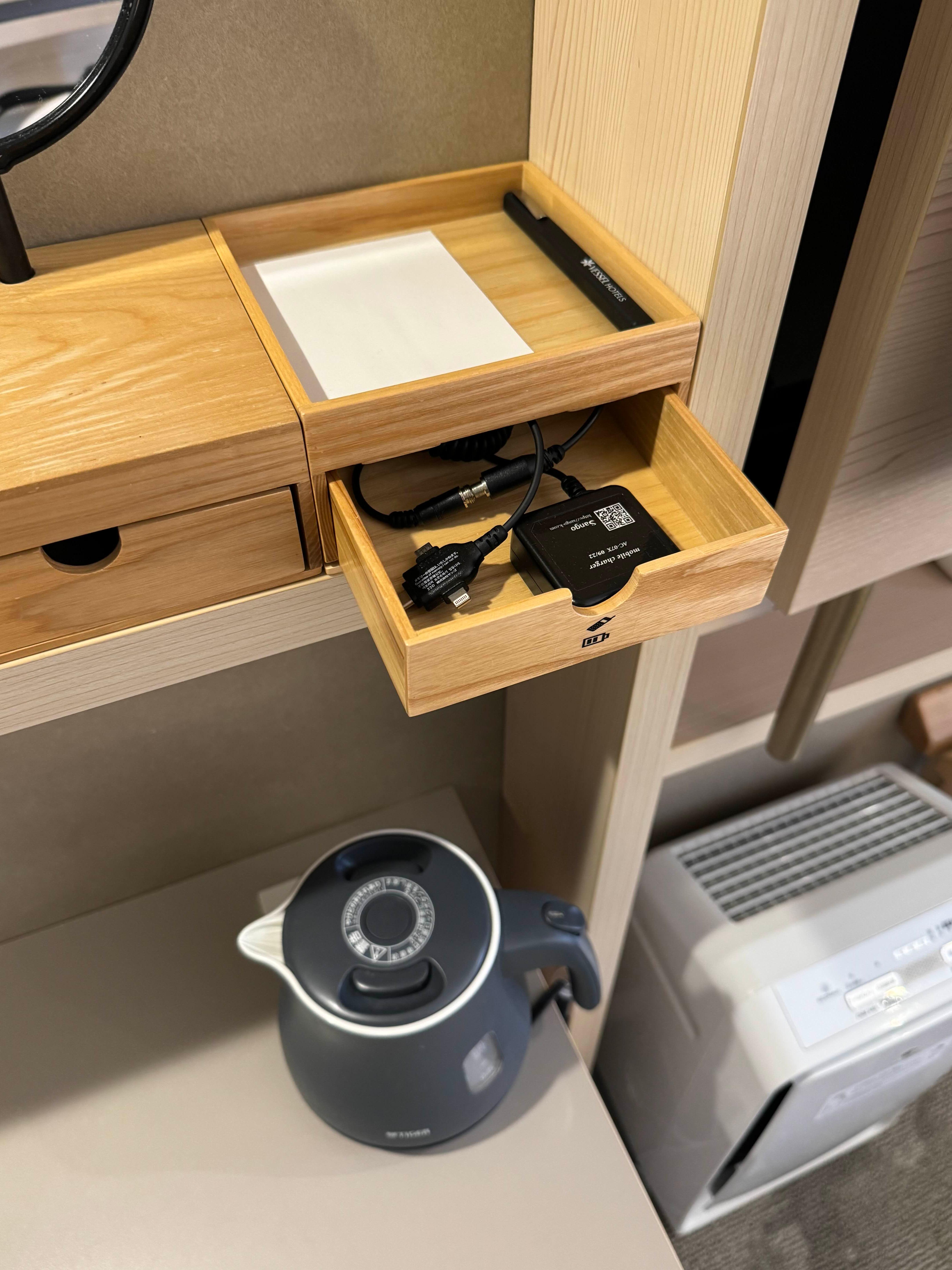 냉장고도 아래 있고 커피포트도 있고, 컵이나 거울, 그리고 충전기도 있어서 따로 충전기를 안 챙겨 와도 됩니다.