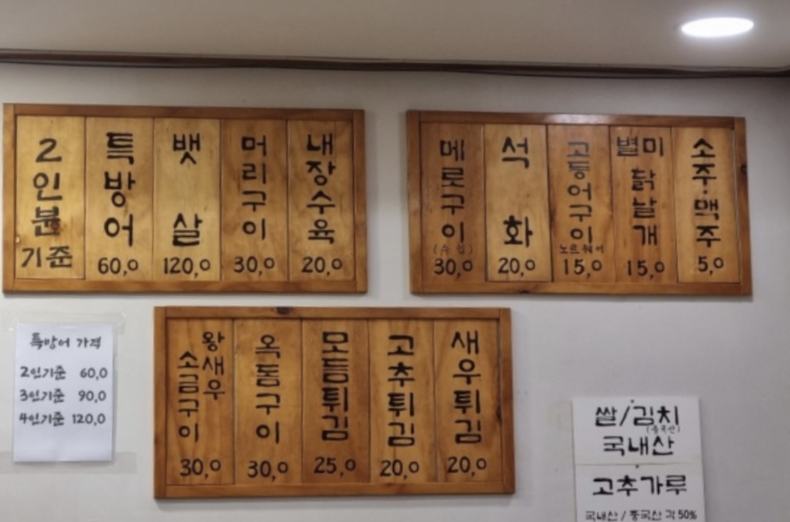 회를 먼저 먹고 나서 머리구이나 미역국, 고구마튀김이 나와서 같이 술한잔 해도 좋습니다. 가게에 갔을 때 나이 많으신 분들은 거의 없었습니다. 대부분 젊은 사람들이 많았습니다. 분위기는 약간 시끌벅적해서 조용하게 이야기 나누기는 조금 힘들어 보이기도 했고, 옆테이블과 바짝 붙어있기도 해서 조금 신경 쓰이기도 했어요.