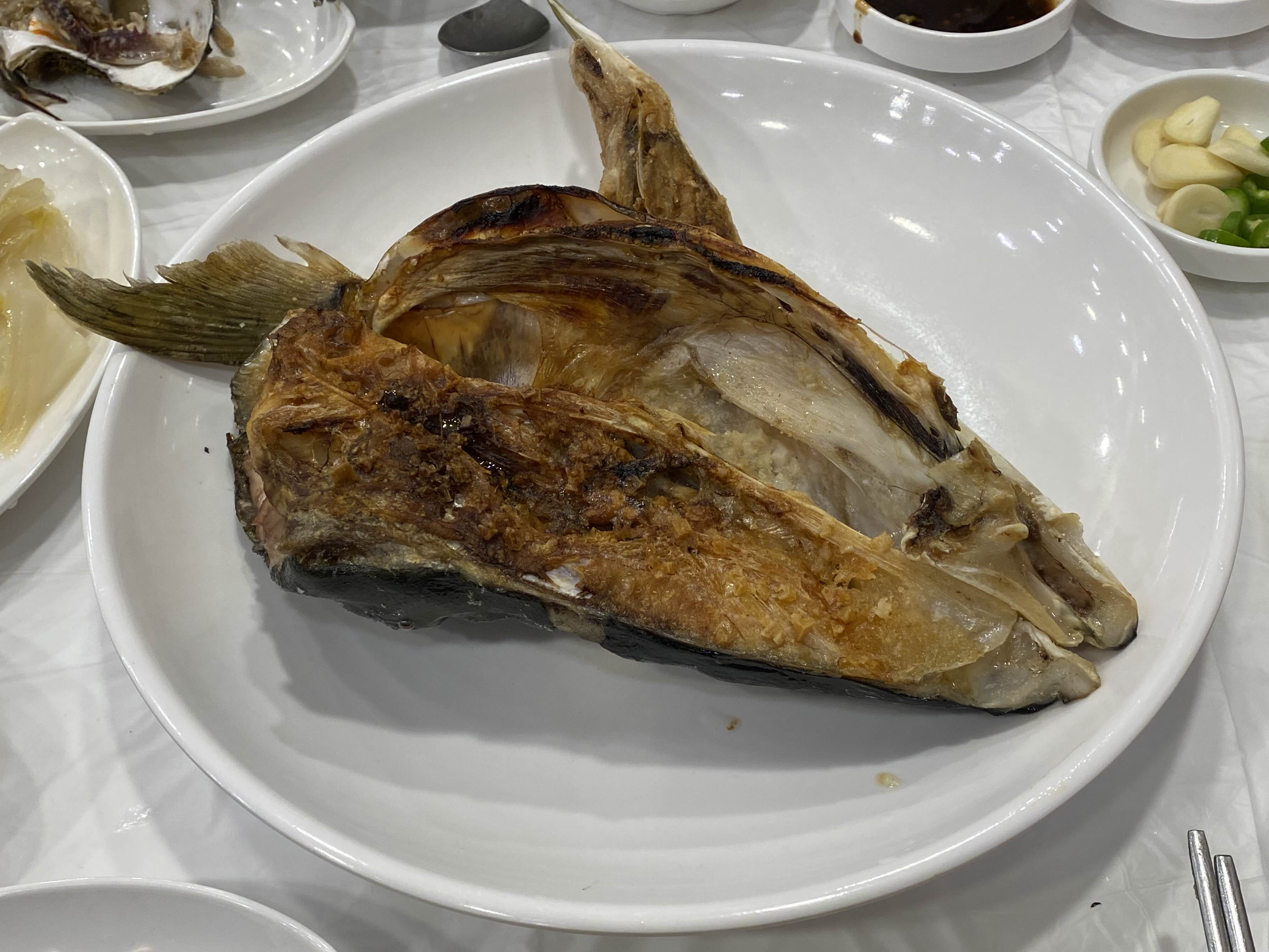 많아 보이던 특방어도 한점 한점 싸먹다보니까 다 먹어버렸습니다. 그리고 머리구이가 오래 걸려서 특방어를 다 먹을 때쯤 머리구이가 나옵니다. 아주머니께서 다 쪼개서 먹기 좋게 해체해 주시니 걱정할 필요 없습니다. 바로 구워서 나와서 따듯하니 맛있어요. 특방어회만 먹으면 조금 느끼할 수 있는데 머리구이를 먹으니 또 맛있더라고요.