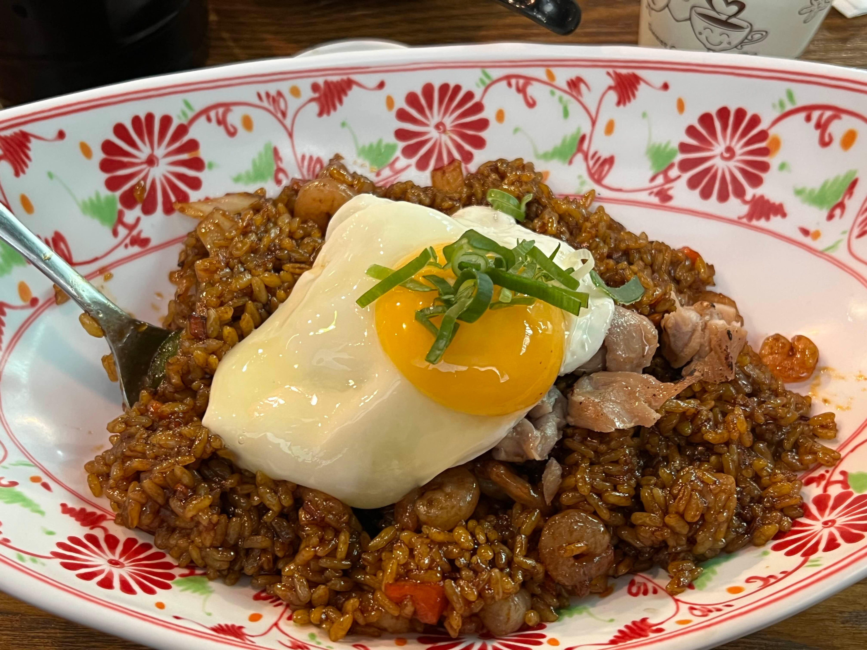 나시고랭은 조금 매콤해요. 전혀 그렇게 보이지 않지만 먹으면 먹을수록 매콤한 맛이 나서 맵게 느낄 수 있습니다.