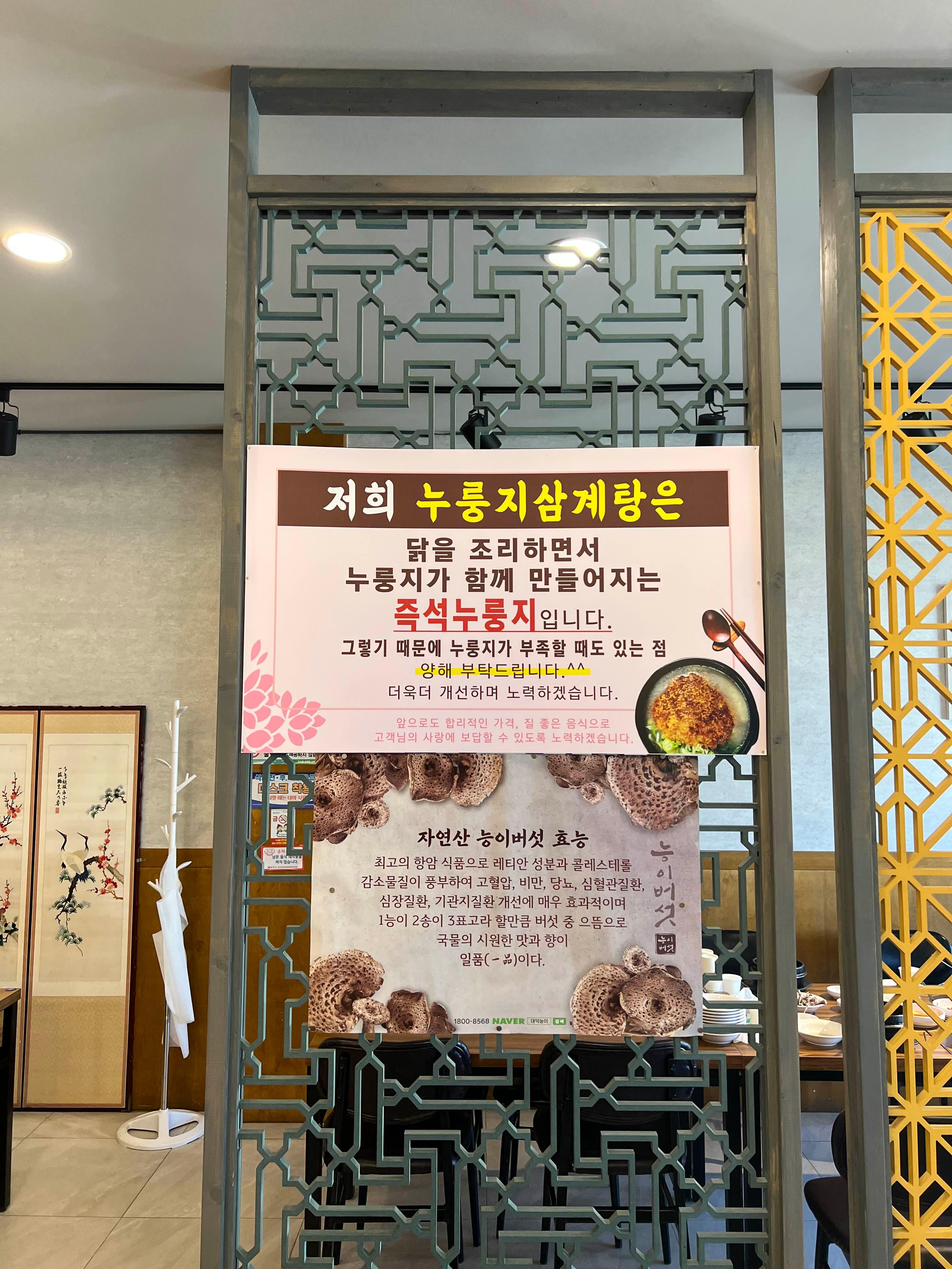 능이는 정품을 쓴다는 표지판도 있었어요! 흑마늘 능이 삼계탕도 어떤 맛인지 참 궁금합니다.