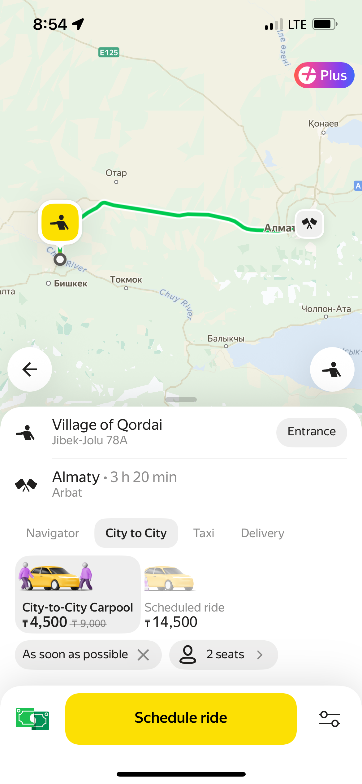 알마티에서 비슈케크로 넘을 때는 얀덱스고 어플에 ‘시티 투 시티’ 기능이 있다.
