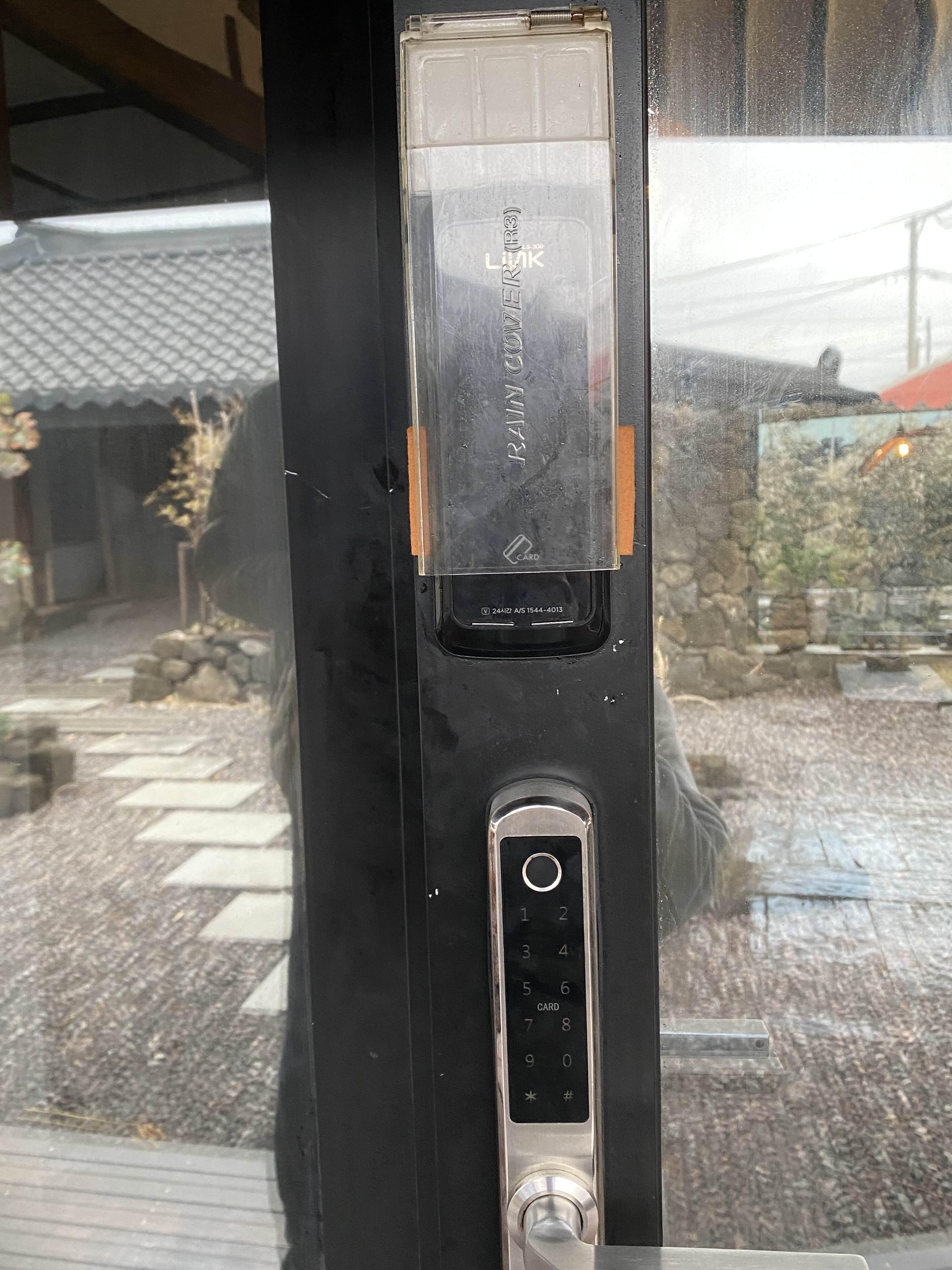 왼쪽 나무대문이 안거리로 가는 입구이고 오른쪽에 유리문이 밖거리이다. 제주는 바깥쪽에 있는 동과 안쪽에 있는 동을 안거리 밖거리라고 부른다. 사랑채와 본채라고 생각하면 좋다. 우리는 안거리만 예약했기 때문에 왼쪽 나무 문으로 들어간다. 더 많은 가족이 오면 밖거리도 같이 예약하면 된다.