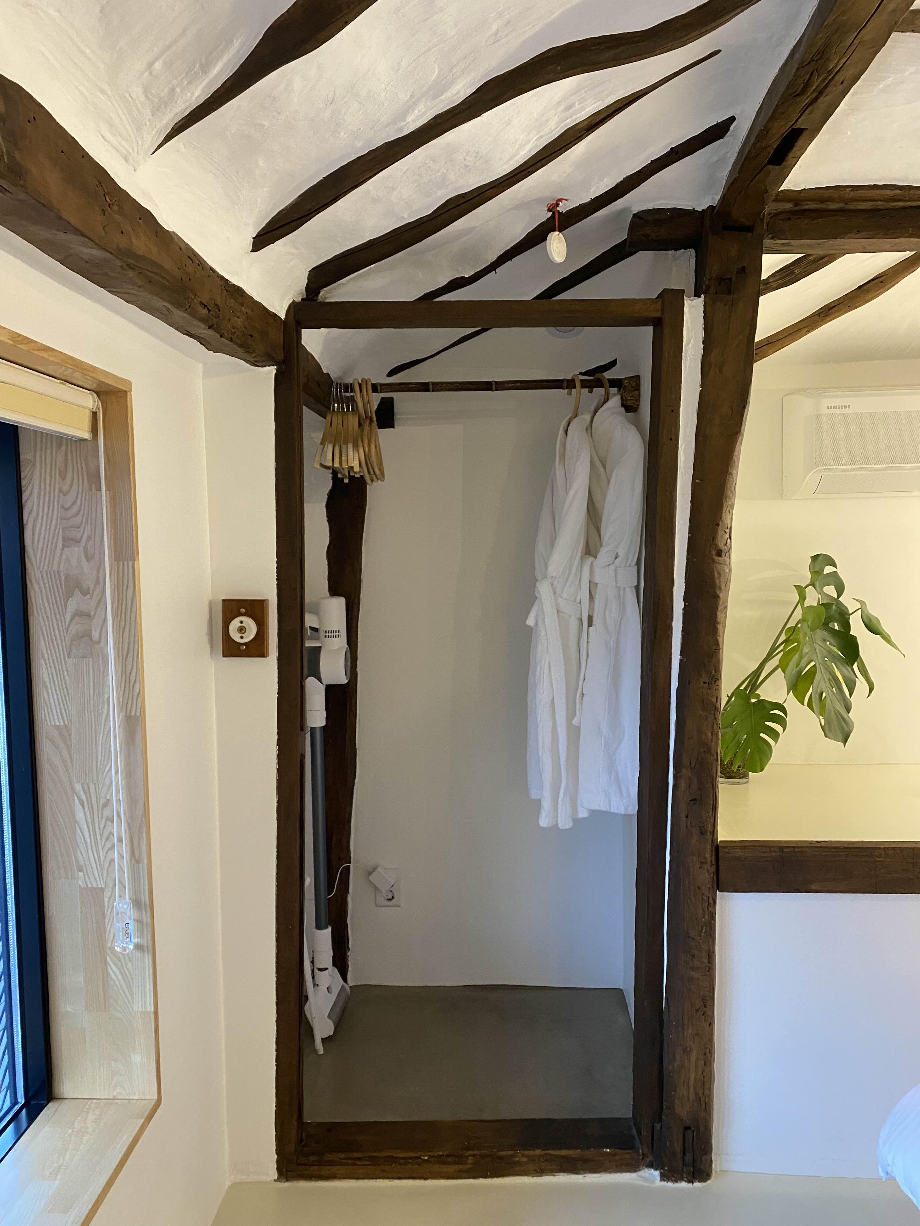 침실 안쪽에는 옷장이 있어서 짐이나 옷을 걸어두었다. 가운은 나중에 밖 욕조로 이동할 때 입고 다녔다. 기둥들이나 구조틀이 다 옛 가옥을 남겨두어 한옥집에 있는 듯 했지만 또 세련되고 현대적으로 마감이 되어 있어 고풍스러웠다. 신식 호텔보다도 이런 숙소가 더 제주스럽고 기억에 남는 숙소가 아닐까 싶다.