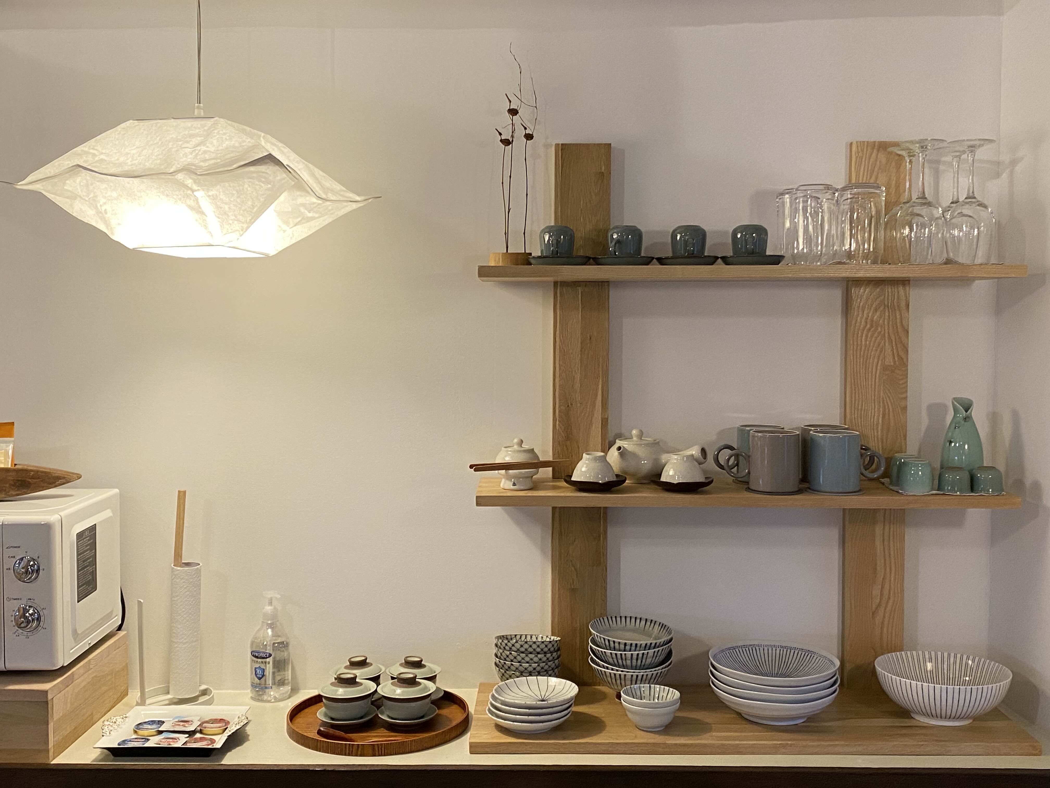 입구 반대편으로 뒷 정원이 보이는 창문이 있고, 그 앞에 낮은 테이블과 차를 즐길 수 있는 공간이 있다. 조용히 앉아서 차를 마시면서 바깥을 구경하는 모습이 그려진다. 차를 좋아하지 않아도 커피를 끓여서 조용히 사색을 하거나 책을 읽어도 좋다. 테이블에는 방명록이 있는데, 방명록에는 신혼부부를 비롯한 젊은 부부가 많았는데 코로나로 인해서 해외여행을 못 갈 때 이곳으로 많이 머물렀다고 쓰여있고 다 너무 좋았다는 내용이었다. 가족단위로도 많이 왔는데 어르신들도 이곳을 엄청 좋아할 것 같아서 다음에 가족끼리 와도 좋을 것 같다고 생각했다. 안거리 밖거리가 있으니 걱정 없다.