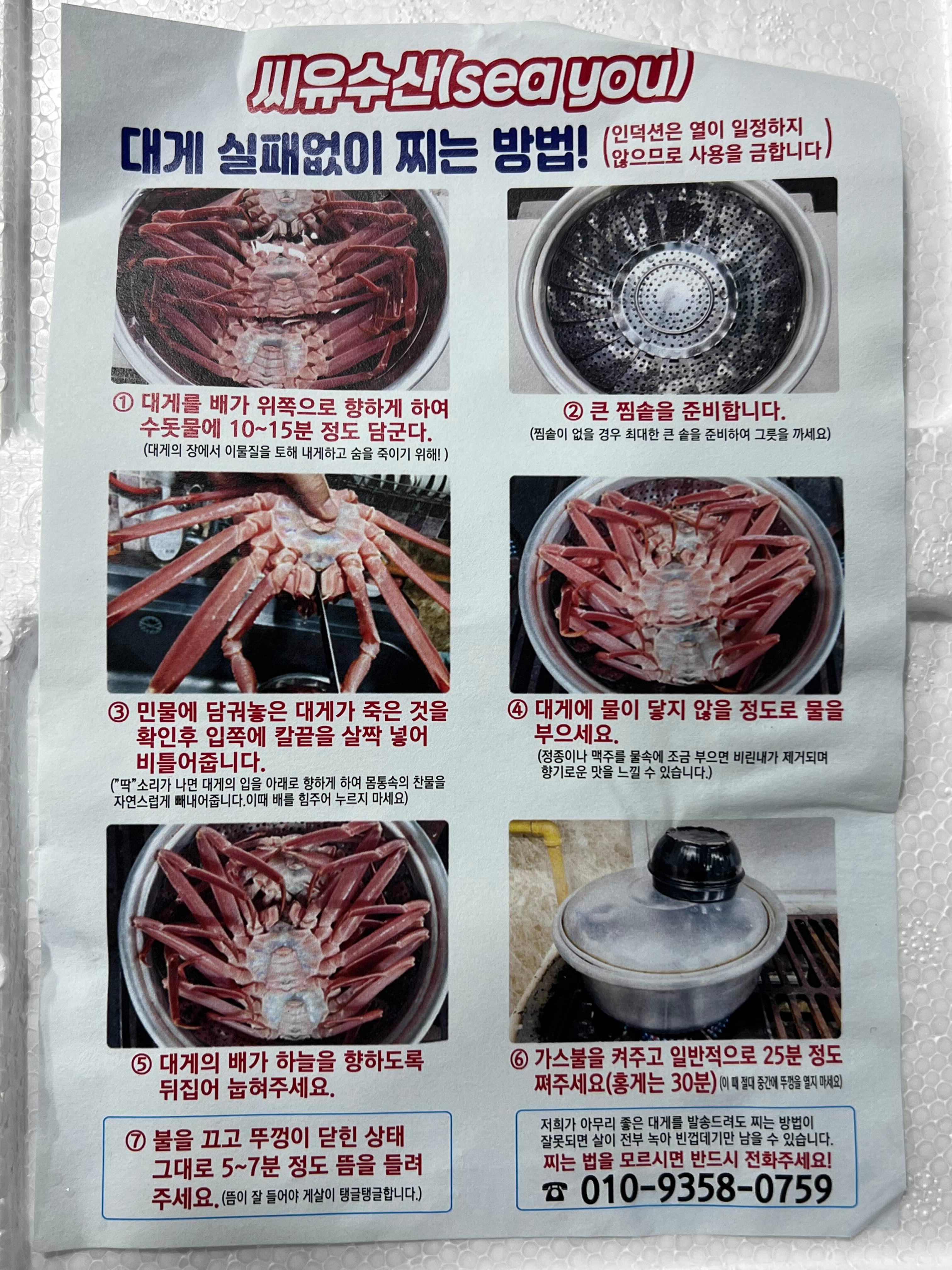 울진쪽에서 갓잡은 대게를 당일 바로 배송해주니까 저희는 받아서 찜기에 찌기만 하면 됩니다. 찌는 방법도 같이 보내주셔서 안내서 보고 찌니까 전혀 어렵지 않았습니다.