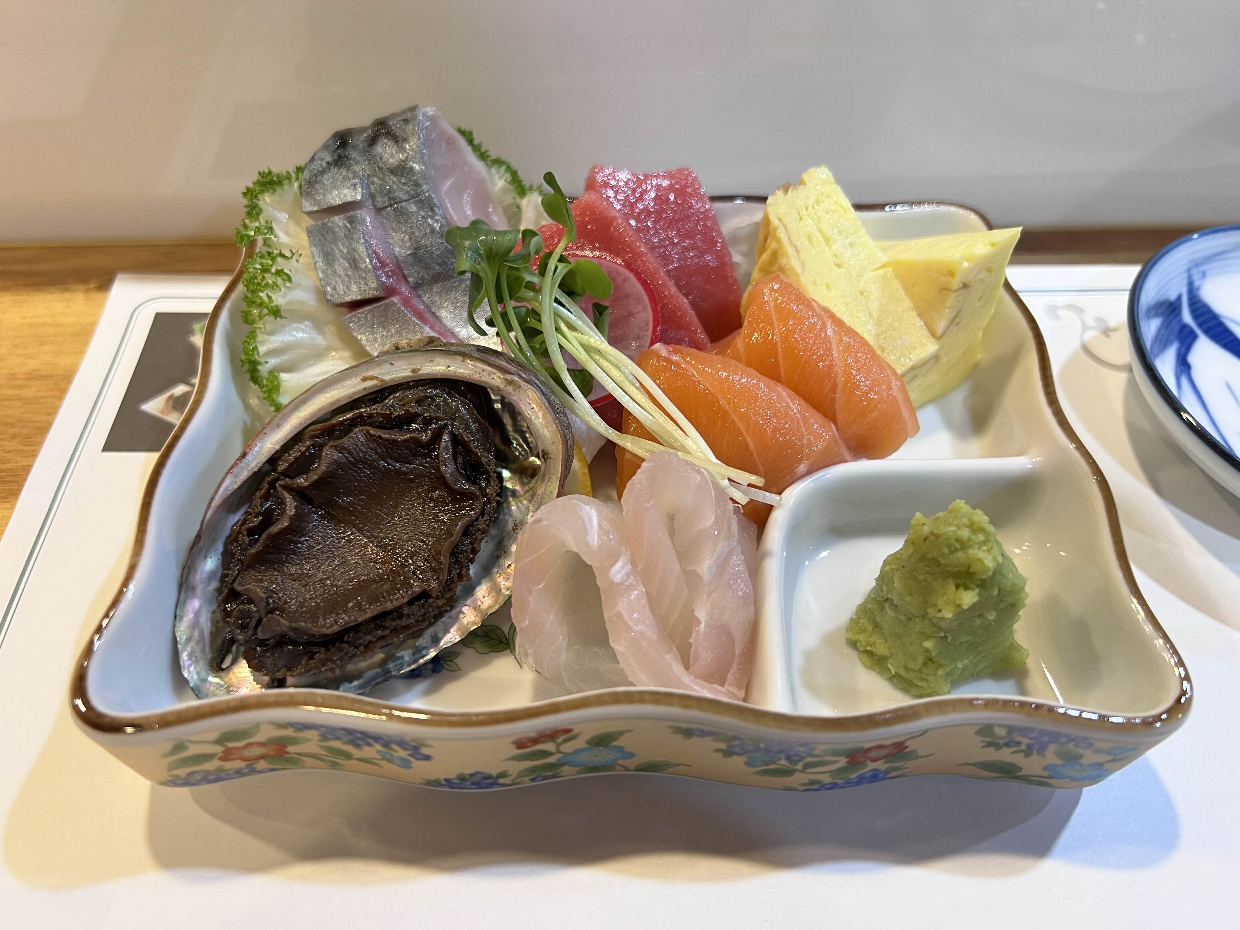 먼저 사시미가 나온다. 광어/연어/참치/고등어/간장에 조린 전복 등이 나온다. 계절마다 제철회로 나올 것이다.