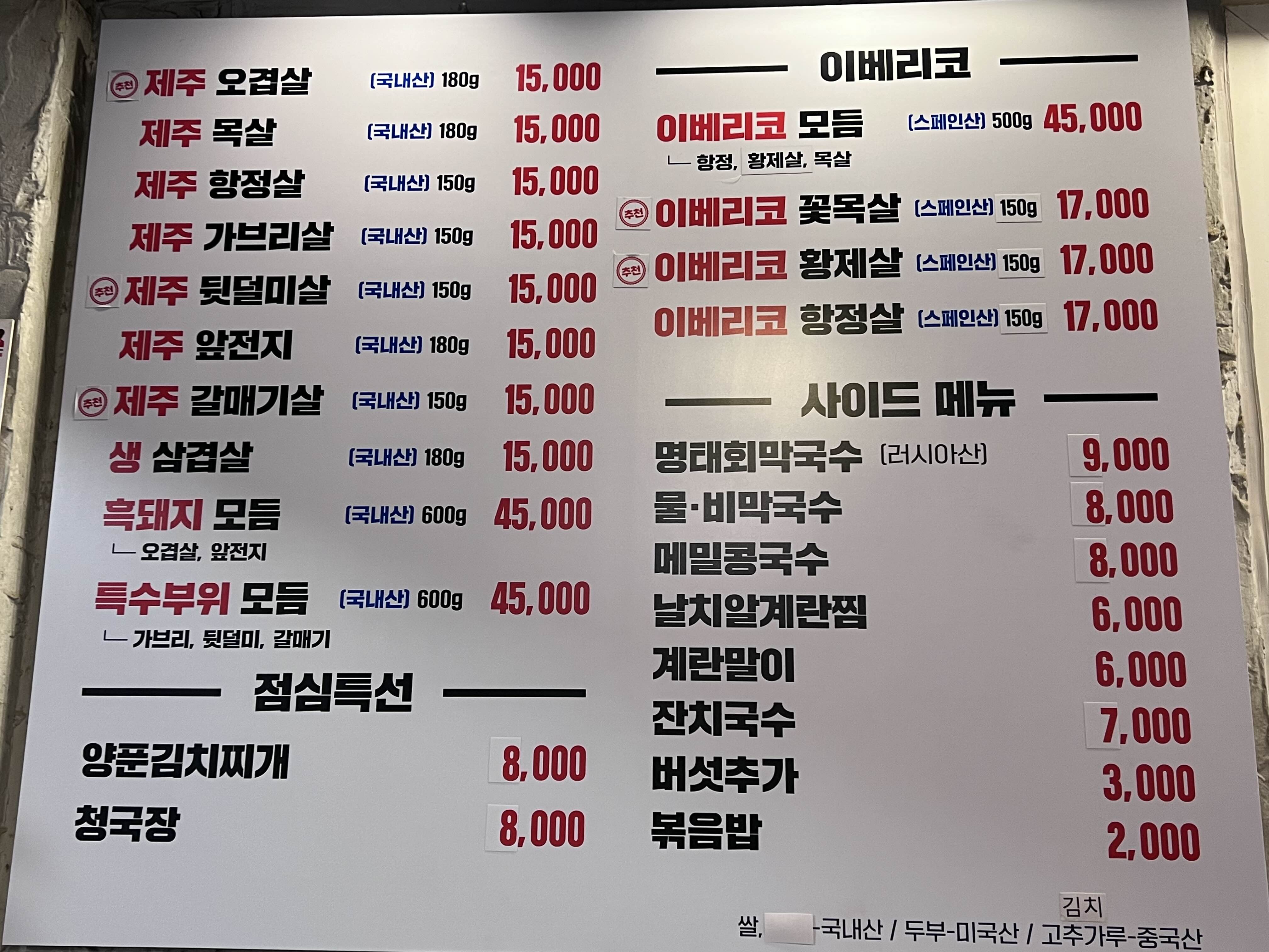 처음에는 2인분 기준으로 주문가능한데 첫 방문이라면 오겹살을 추천한다. 오겹살이 지방이 적당히 껴있어 고소하고 맛있다. 모든 고기들이 신선해서 다 맛있긴 하다. 오겹살을 기준으로 다른 부위를 섭렵해 가면 좋다.