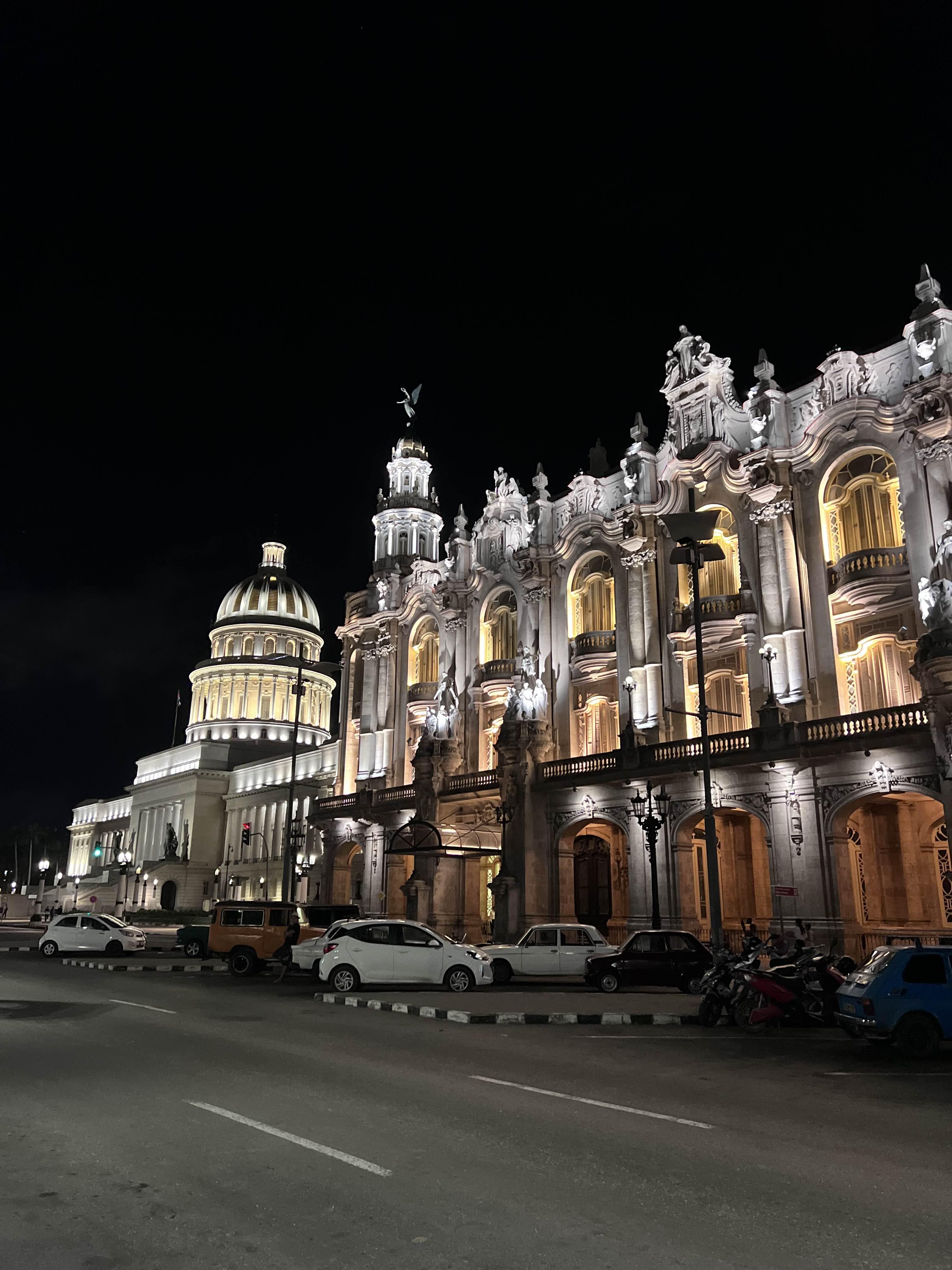 저 멀리 까피톨리오가 조명으로 멋있게 보이길래 까피톨리오로 걸어가 보았다. 쿠바는 전기공급이 잘 안 되는 도시들도 있다. 그래도 하바나는 전기가 잘 들어오는데 특히나 까피톨리오는 환하게 비치고 있었다. 상징 같은 곳이라 그런지 더 웅장하게 보이는 듯했다. 특히나 그 옆 대극장까지도 조명이 예뻐서 사진을 엄청 많이 찍었다. 알아본 바로는 여기 호텔에서 바라보는 야경이 좋다고 해서 내일은 그 호텔에 가서 저녁 먹고 야경을 볼 셈이다.