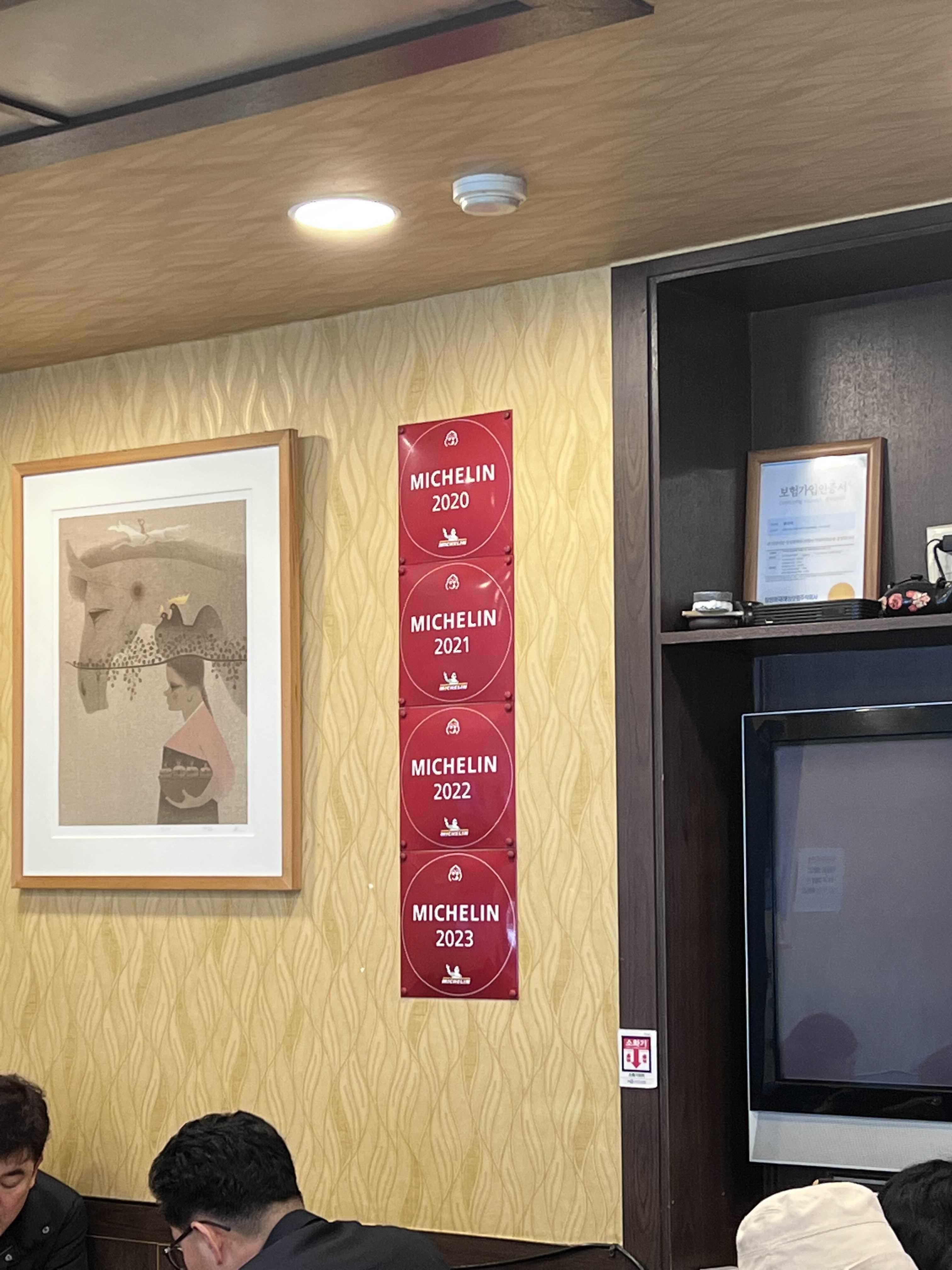 봉산옥은 2020년부터 2023년까지 미쉐린에 선정되었어요. 실내에도 저렇게 붙여있고, 지역 특색이 묻어나는 음식이라 더 많이 찾고 유명해진 듯합니다. 1층에는 약 7개의 테이블이 있습니다. 내부 테이블 사진은 사람들이 많은 관계로 찍지 않고 안내사항이나 메뉴만 찍은 점 양해해 주세요.