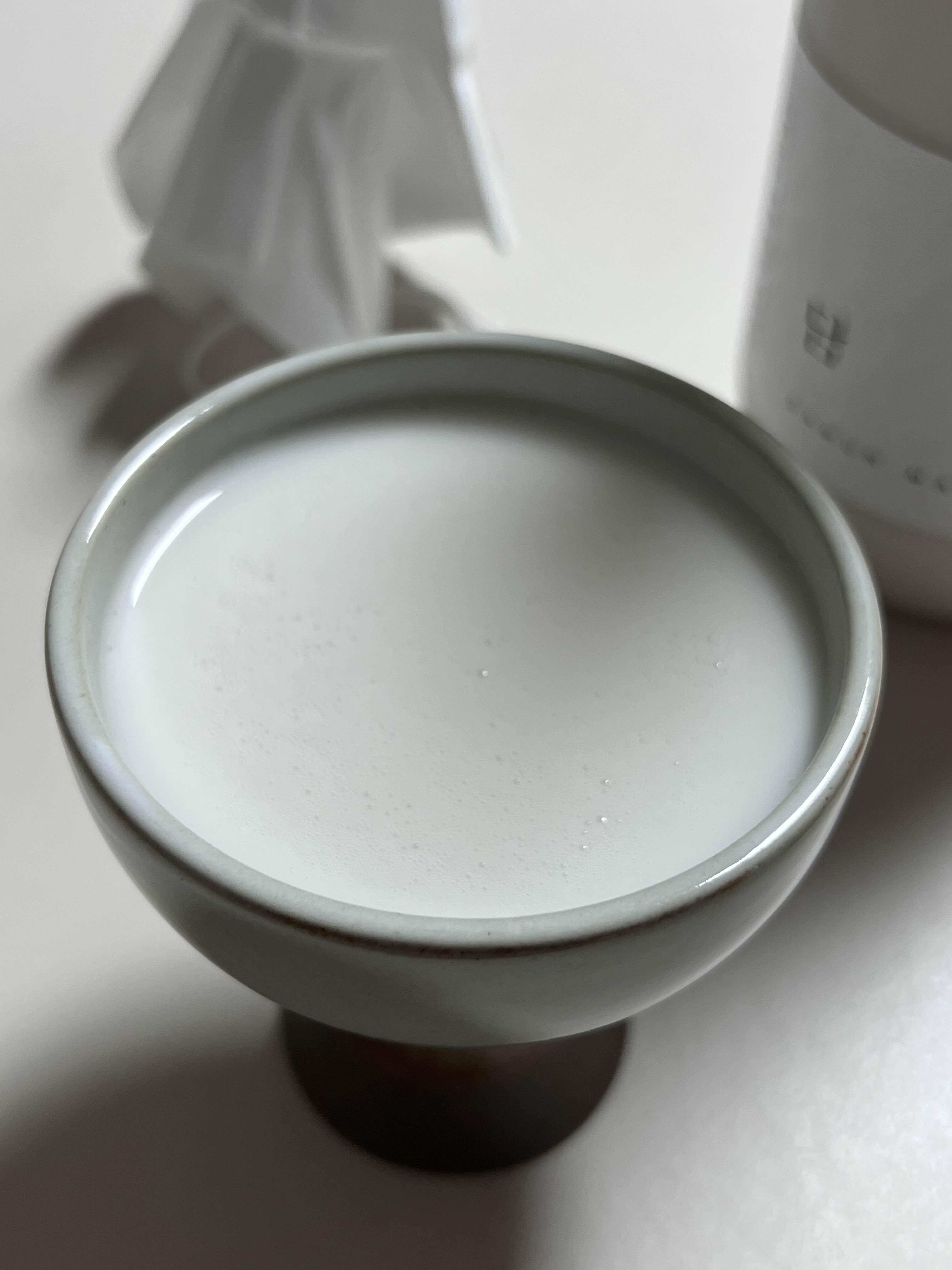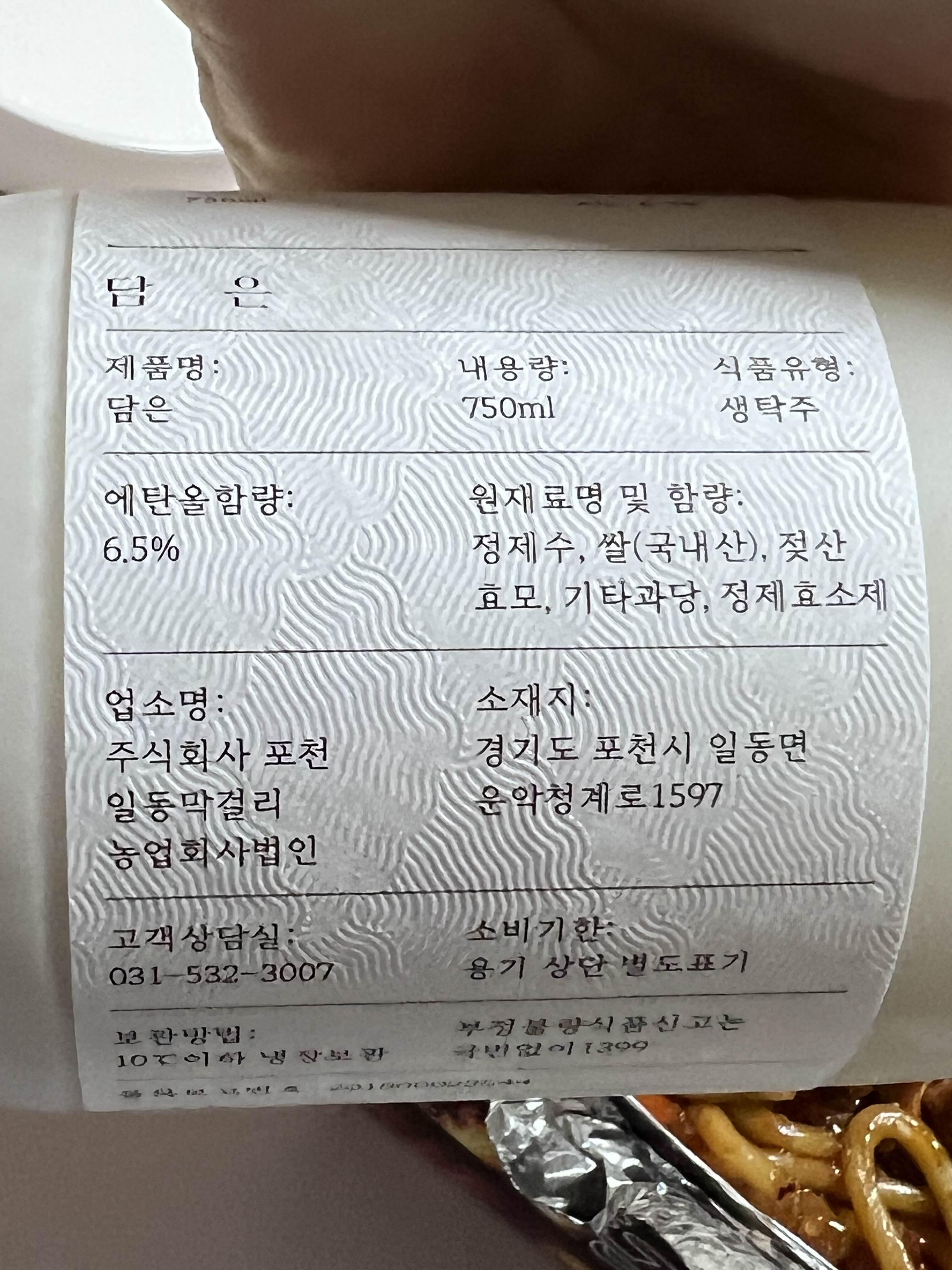일반적인 막걸리보다 더 하얗고 우유같은 느낌이 더 강합니다. 맛도 쌀맛이 조금 나는 것 같아요. 750ML이고, 경기도 포천 일동막걸리에서 만들었습니다. 6.5도 정도로 그렇게 높은 도수는 아닙니다. 원재료는 아래 사진 참고해 주세요.
