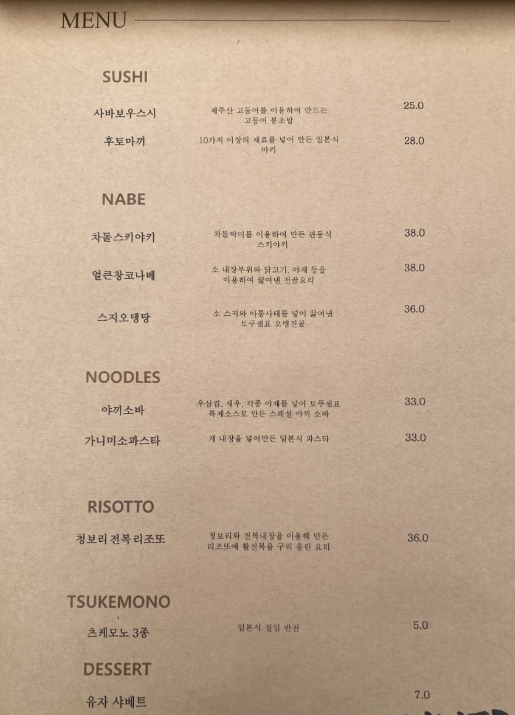 만약 장어덮밥을 좋아한다면 점심에 예약하고 방문해 보길. 나도 점심에는 가지 않았는데 장어덮밥 메뉴를 보자마자 점심에 다시 와봐야겠다고 생각이 들었다. 가격만큼이나 맛도 구성도 좋을 것 같다.