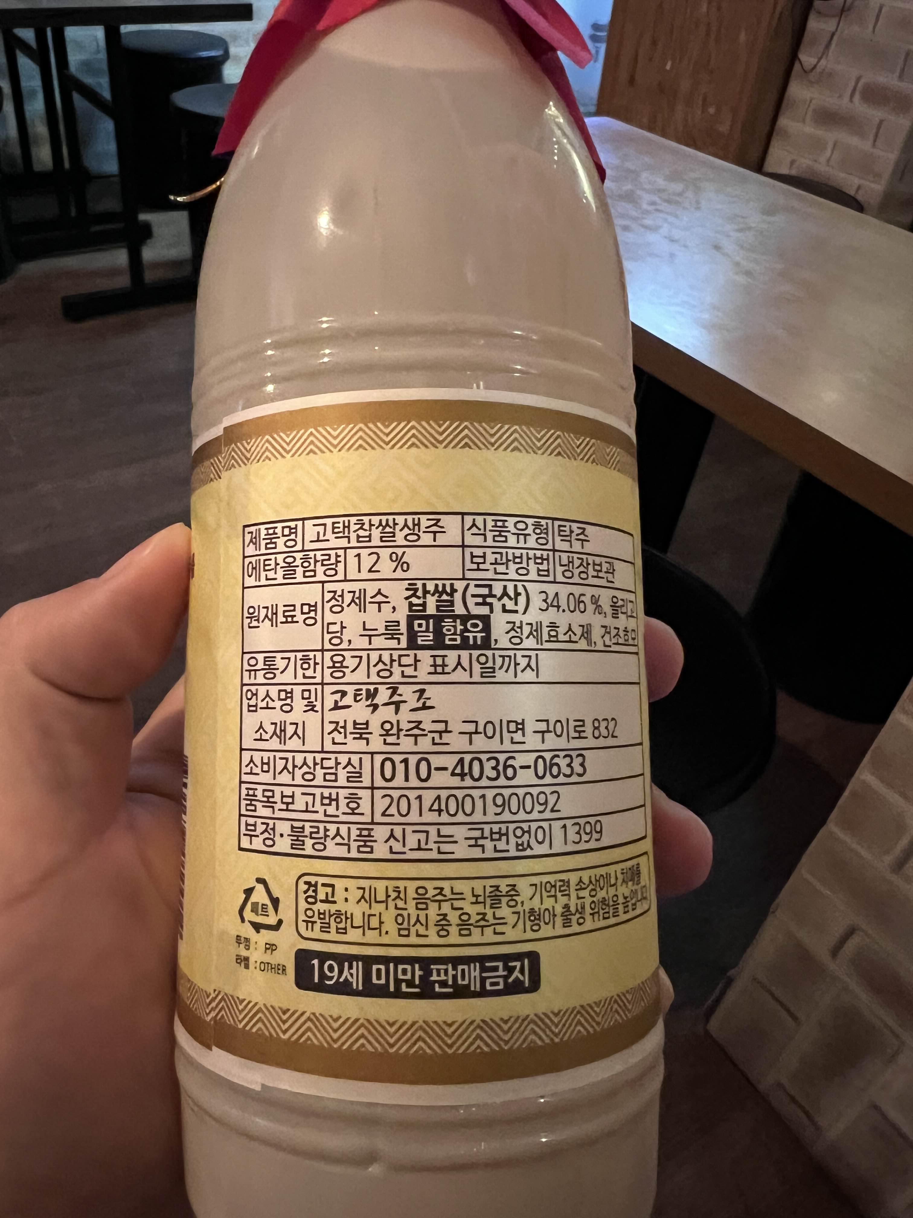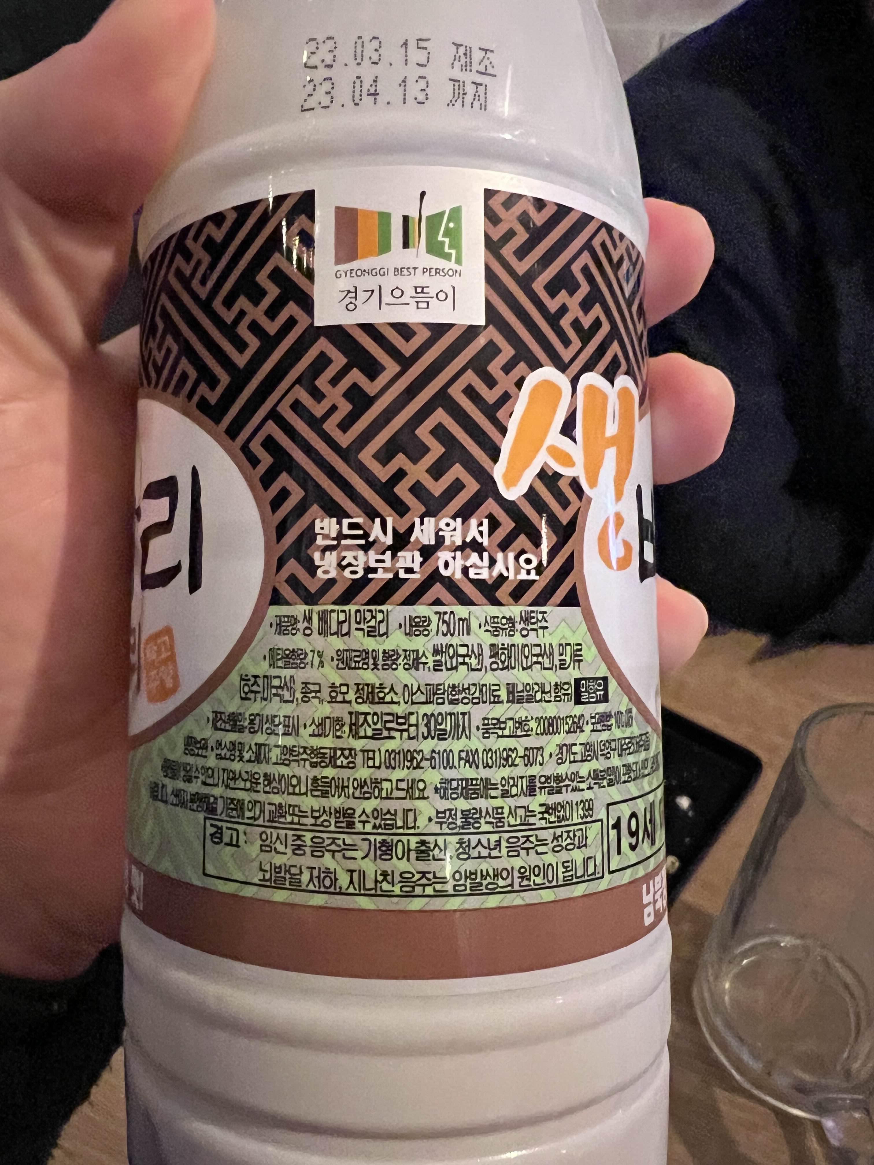 세 번째로 마신 탁주가 찹쌀생주입니다. 처음 보는 막걸리기도 해서 궁금해서 맛보았는데, 탁주라기보다는 청주에 가깝습니다. 다른 막걸리처럼 뽀얀 막걸리가 아니고 투명한 탁주입니다. 제가 알기론 청주와 탁주의 세법이 다르고, 그 기준도 애매해서 저 정도도 탁주라고 하나 봅니다. 어쨌든 저는 청주를 좋아하기 때문에 이 막걸리가 아주 좋았습니다. 맛은 조금 더 세다고 느낄 수 있어서 더 독하게 느껴질 수 있어요. 나중에 이 막걸리 따로 먹어보고 싶습니다. 찹쌀로 만들었고, 아스파탐 등 감미료가 들어가지 않았습니다.