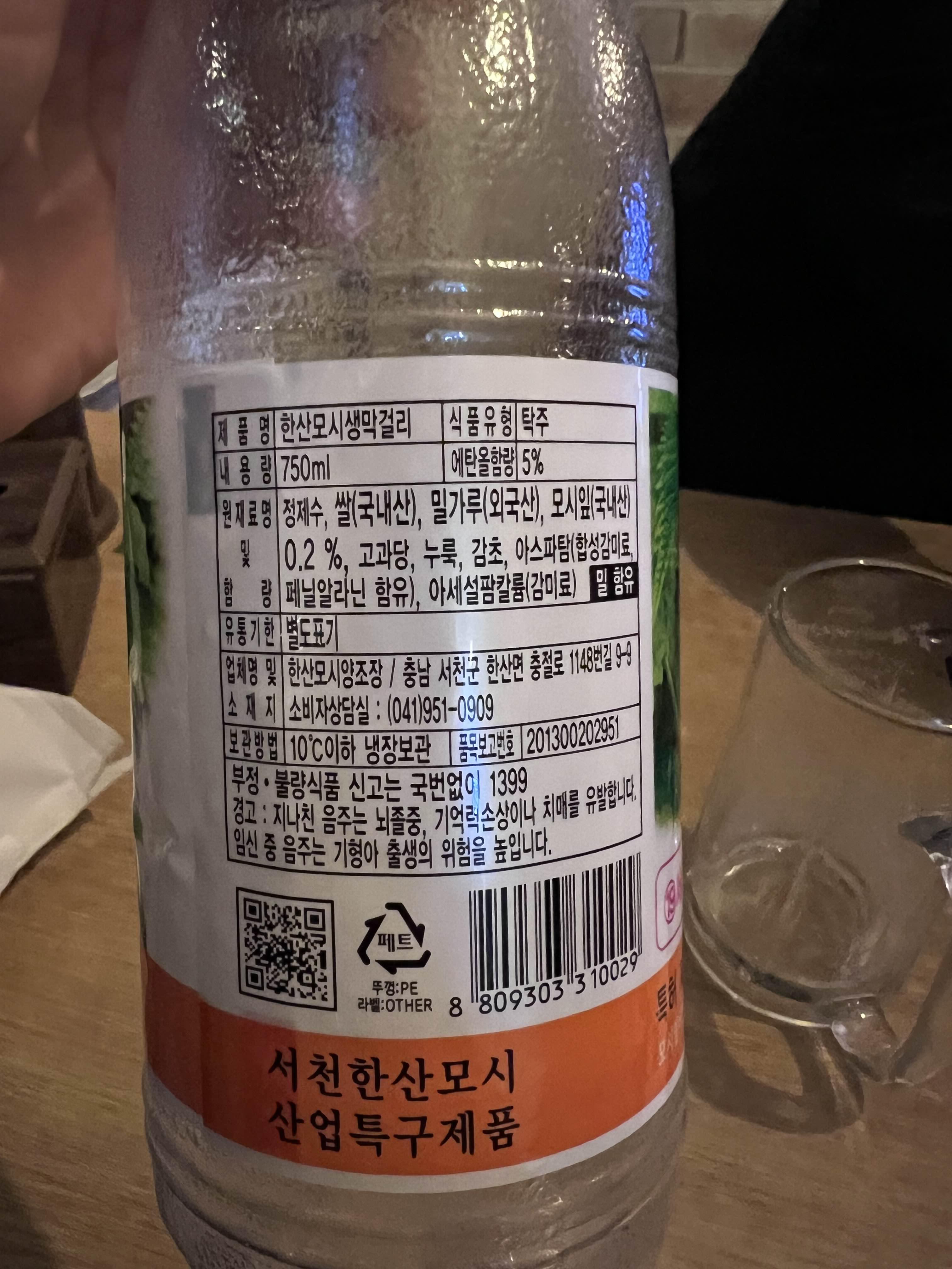 저희는 첫 막걸리로 한산모시를 먹어봤습니다. 선호막걸리는 이미 먹어봤으니까 먹어보지 못한 한산모시를 선택했는데 맛있었습니다. 맛이 강력하지도 않았고, 벌컥벌컥 오래 마시기에도 좋아서 첫 막걸리로 먹고 후에 3,4병은 더 마셨던 것 같아요. 모시잎도 들어가고 아스파탐도 들어가 있습니다. 육전이랑도 잘 어울려서 드셔보기 추천드립니다.