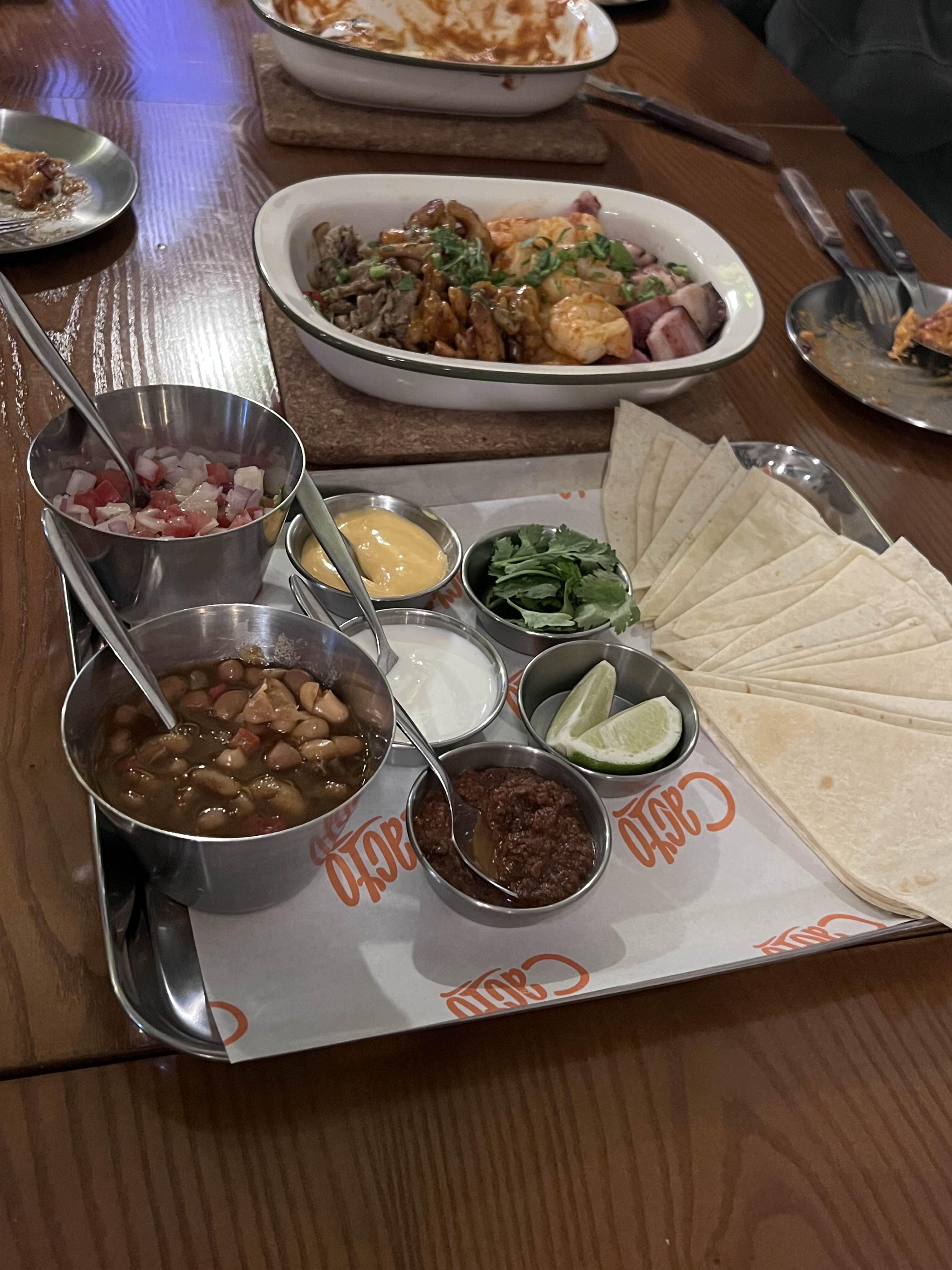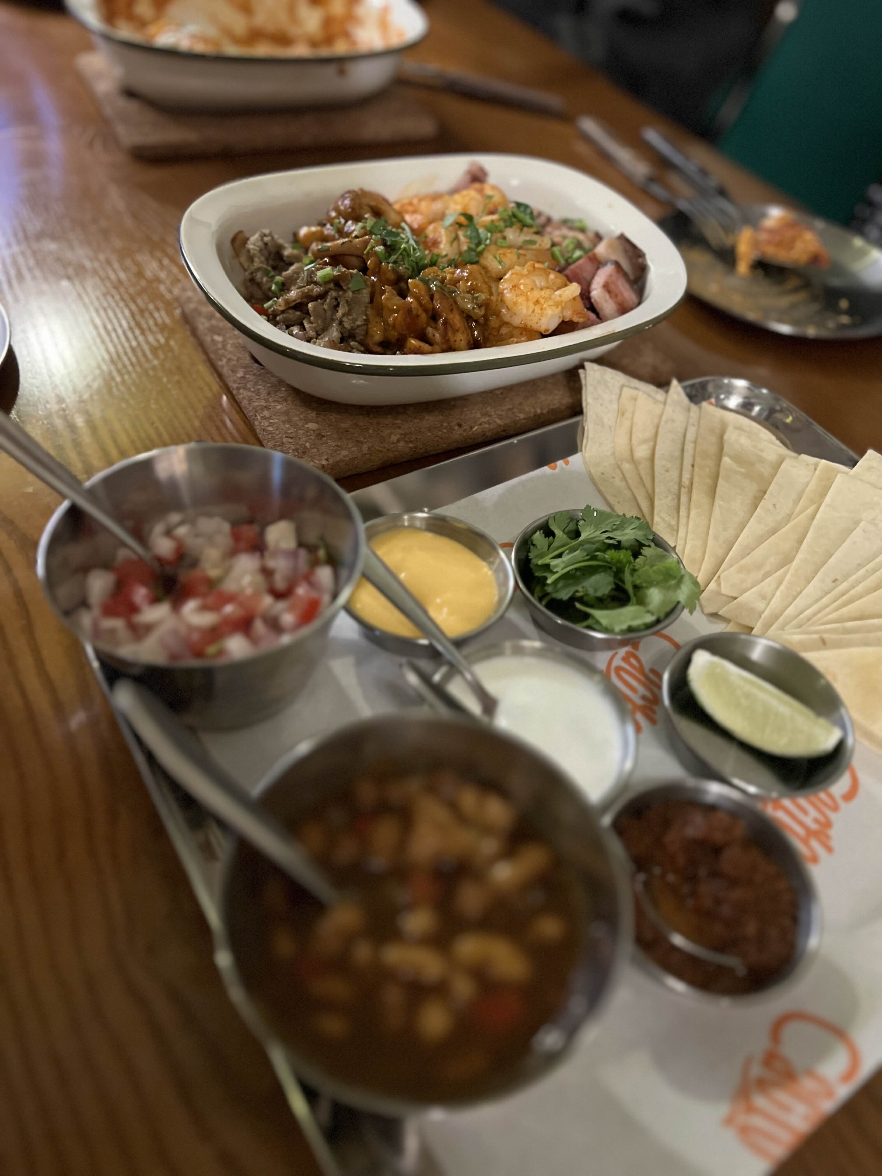 플래터에는 포크, 치킨, 새우, 불고기가 나옵니다. 토르티야에 취향에 맞게 소스를 넣고 싸 먹으면 너무 맛있습니다. 맥주도 플래터도 순식간에 사라졌습니다. 개인당 2잔 정도는 마신 것 같아요. 그렇게 깔끔하게 먹을 수 있었고, 저희는 5명이서 먹었습니다.