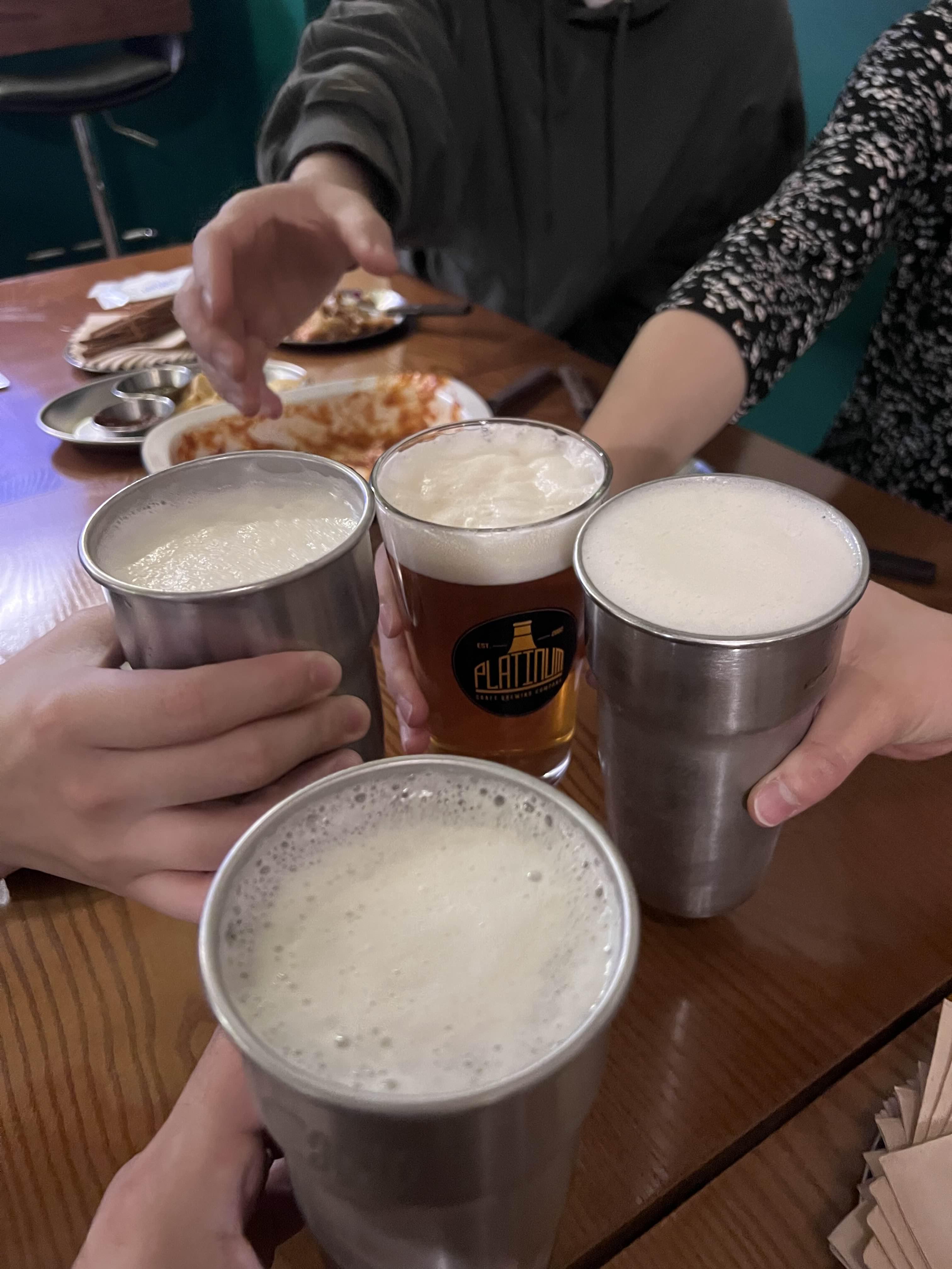 나중에 온 친구는 맥주도 아직 못 받아서 빈 손으로 건배!