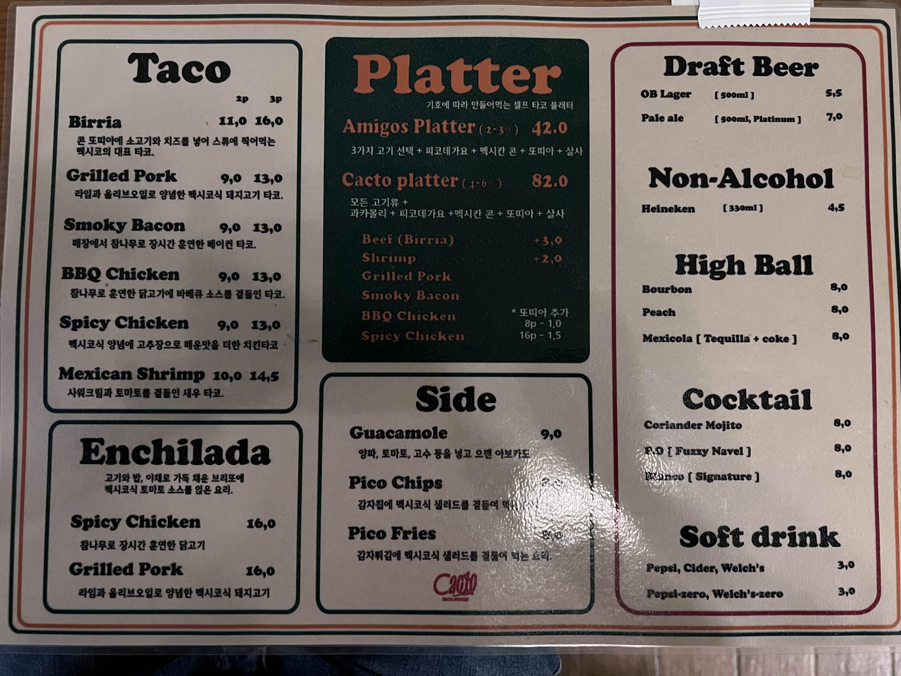 너무 오랜만에 먹어서 인지 맛있었고, 타코벨 같은 타코 프렌차이즈보다 더 맛있었어요. 타코를 좋아하신다면 가보면 좋을 것 같아요. 1차로 가서 가볍게 식사 겸 맥주를 마시면 좋습니다. 저희는 이렇게 먹고 맥주가 살짝 부족해서 근처 노가리집으로 가서 술을 더 마셨어요.