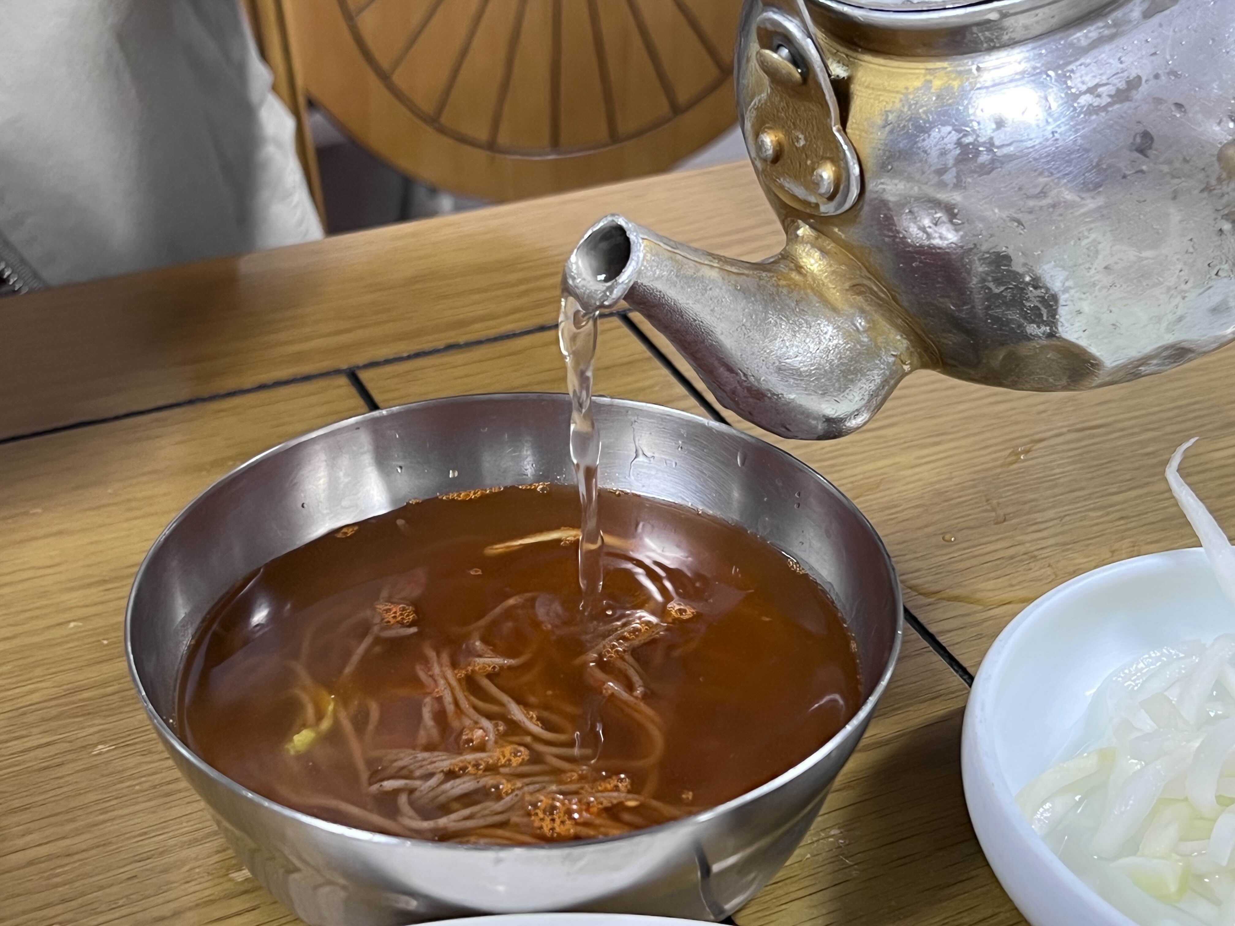 이렇게 대접에 따로 덜어서 육수를 부어서 먹어봤습니다. 육수가 슴슴해서 약간 맹맹하게 느껴질 수 있어요. 육수는 멸치육수 같은 맛이 나요. 저는 개인적으로 비빔으로 먹는 게 더 좋았습니다. 육수를 조금 넣어서 따로 맛보시는 게 더 나을 것 같아요. 맛보고 나서 괜찮으면 남은 그릇에 육수 콸콸콸 부어서 시원하게 드시면 됩니다.