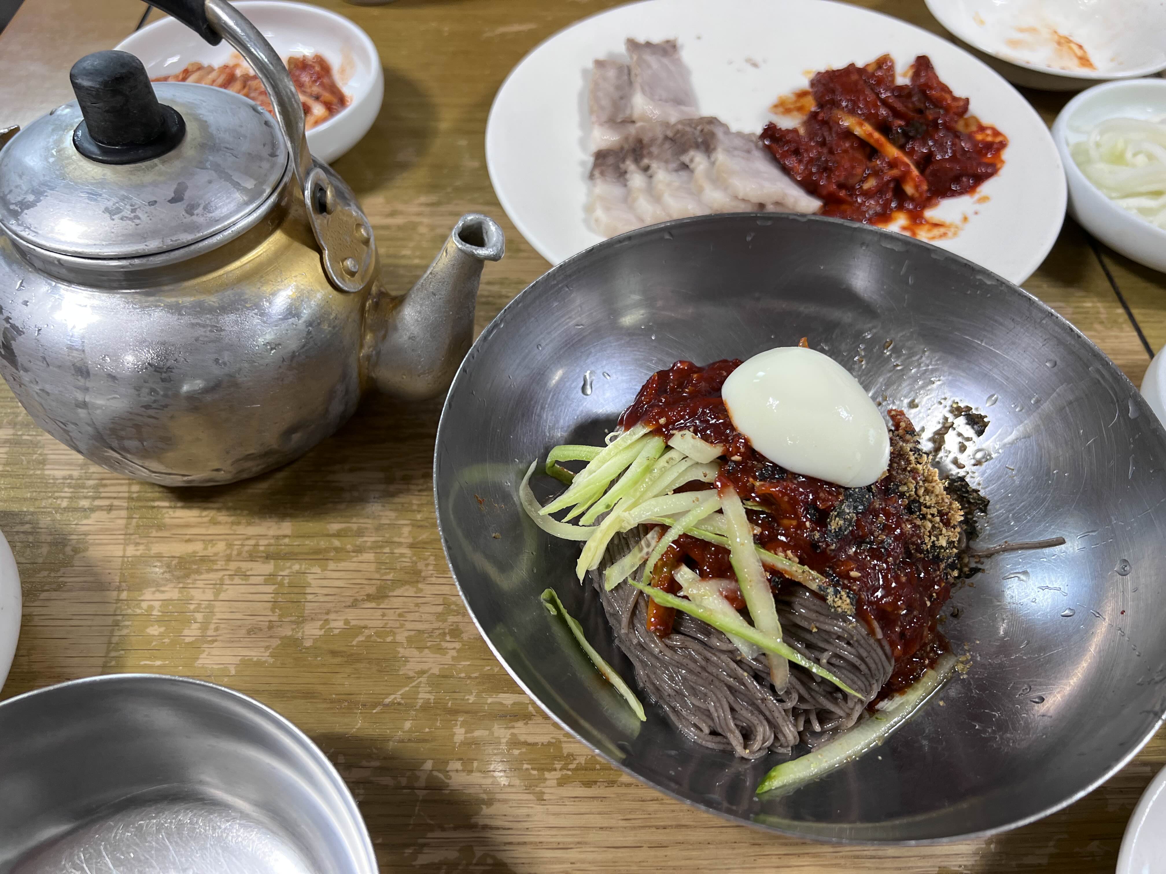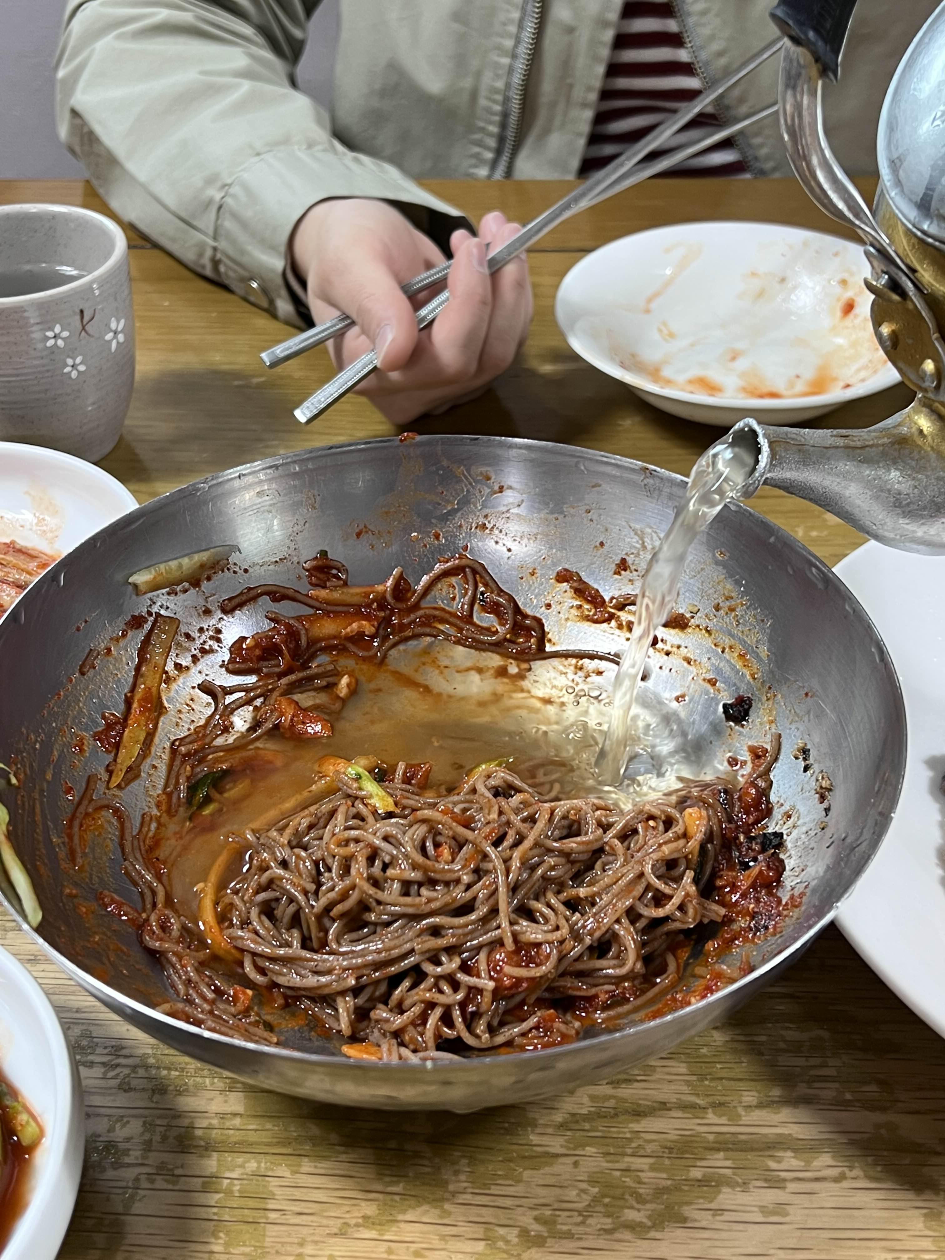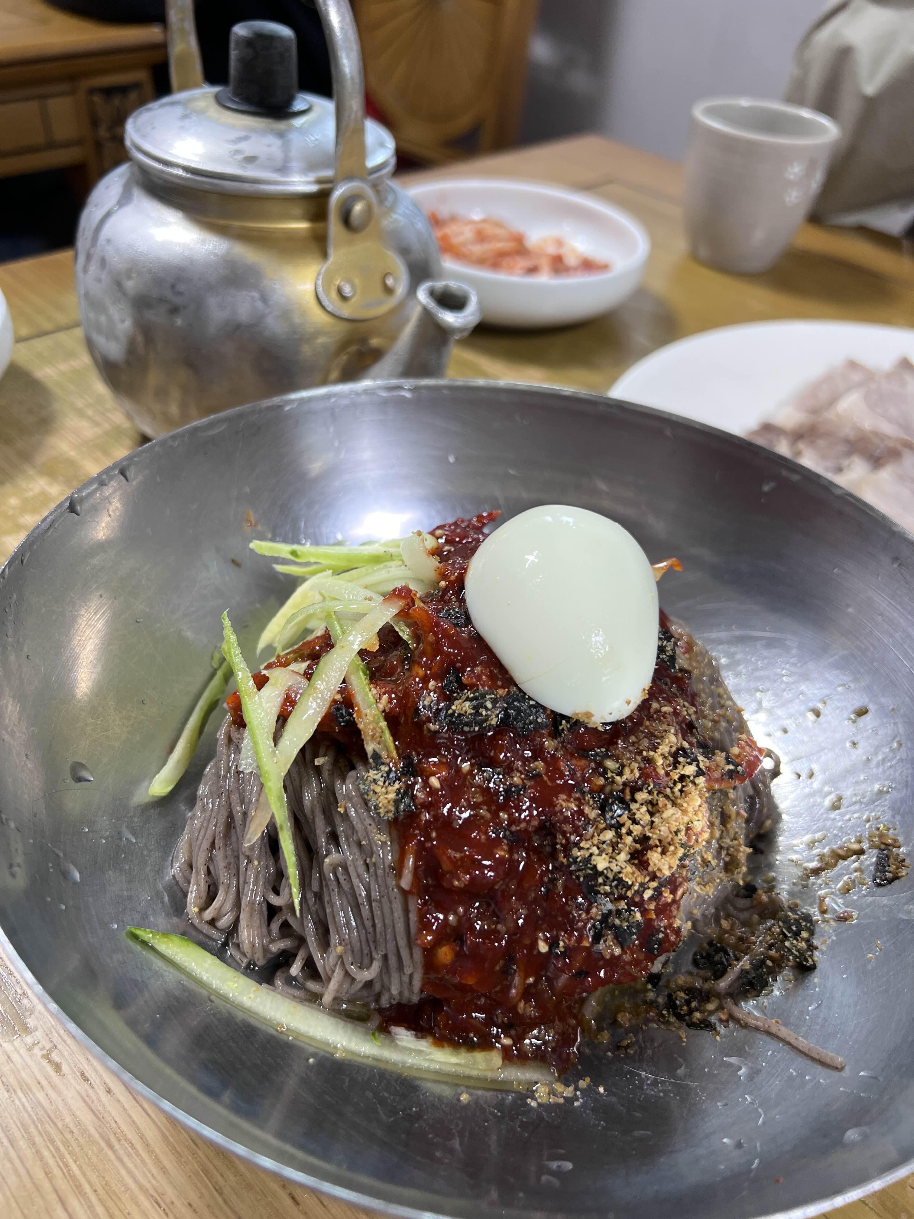 저희는 2명이서 갔고, 회비빔막국수와 수육을 하나 시켰습니다. 육수를 따로 주셔서 비빔막국수로 먹다가 물을 부어서 물막국수처럼 먹었습니다. 두 가지를 다 맛보고 싶으면 저희처럼 하세요. 정말 배부르게 남기지 않고 다 먹었네요. 만약 수육이 당기지 않고 해장으로 오신 거라면 물냉면이나 물막국수 추천합니다.