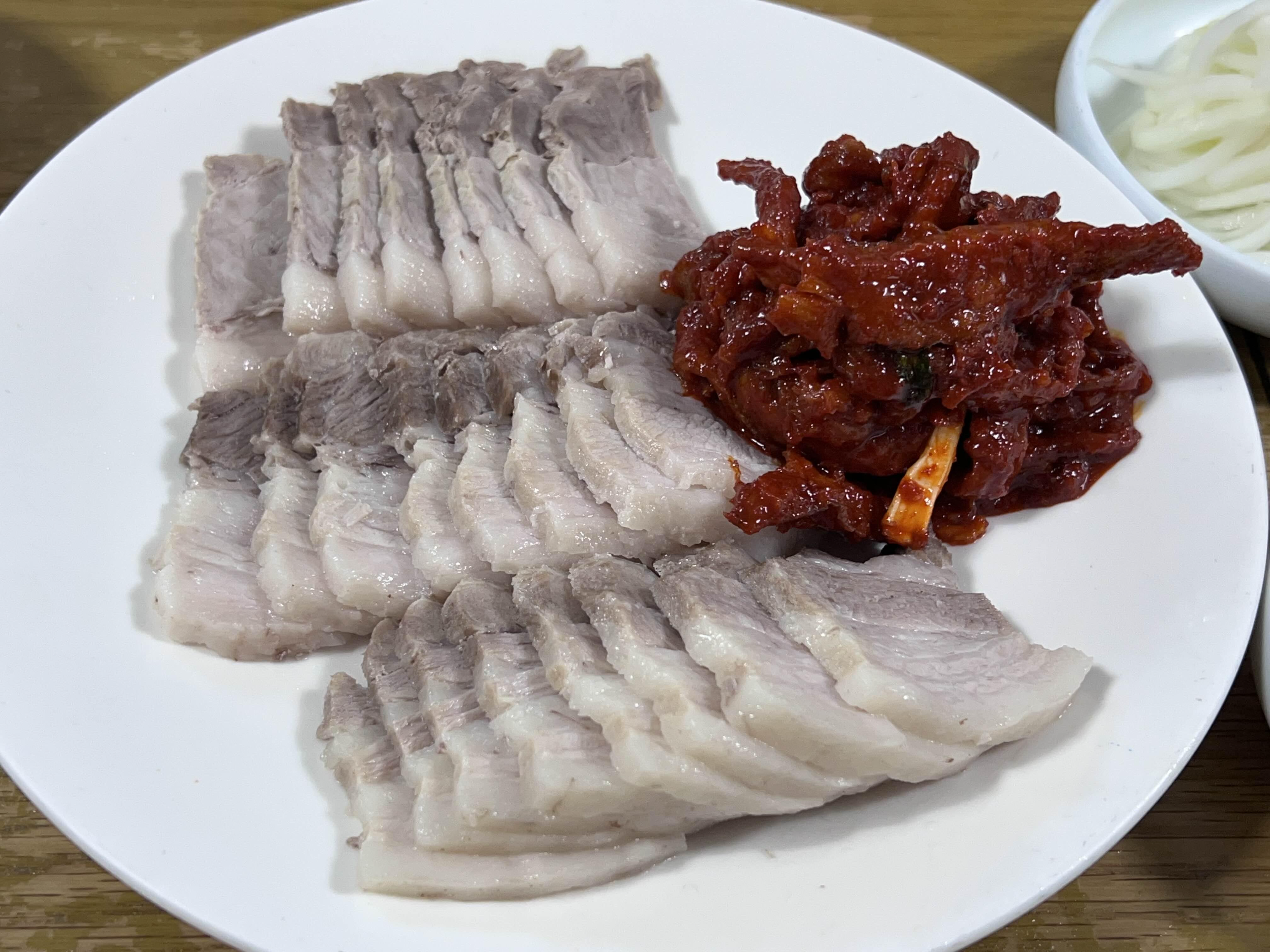 수육에는 비계 부분이 적당이 있어서 고소하고 야들야들합니다. 몇 번 씹으면 사라지는 그런 육질이에요. 가자미식해는 다른 곳보다 색도 진하고 맛도 강한 것 같습니다. 다른 야채가 안 들어가고 가자미로만 만든 것 같아요. 그래서 수육과 가자미식해와 다른 김치나 생채를 같이 드시는 게 좋습니다.